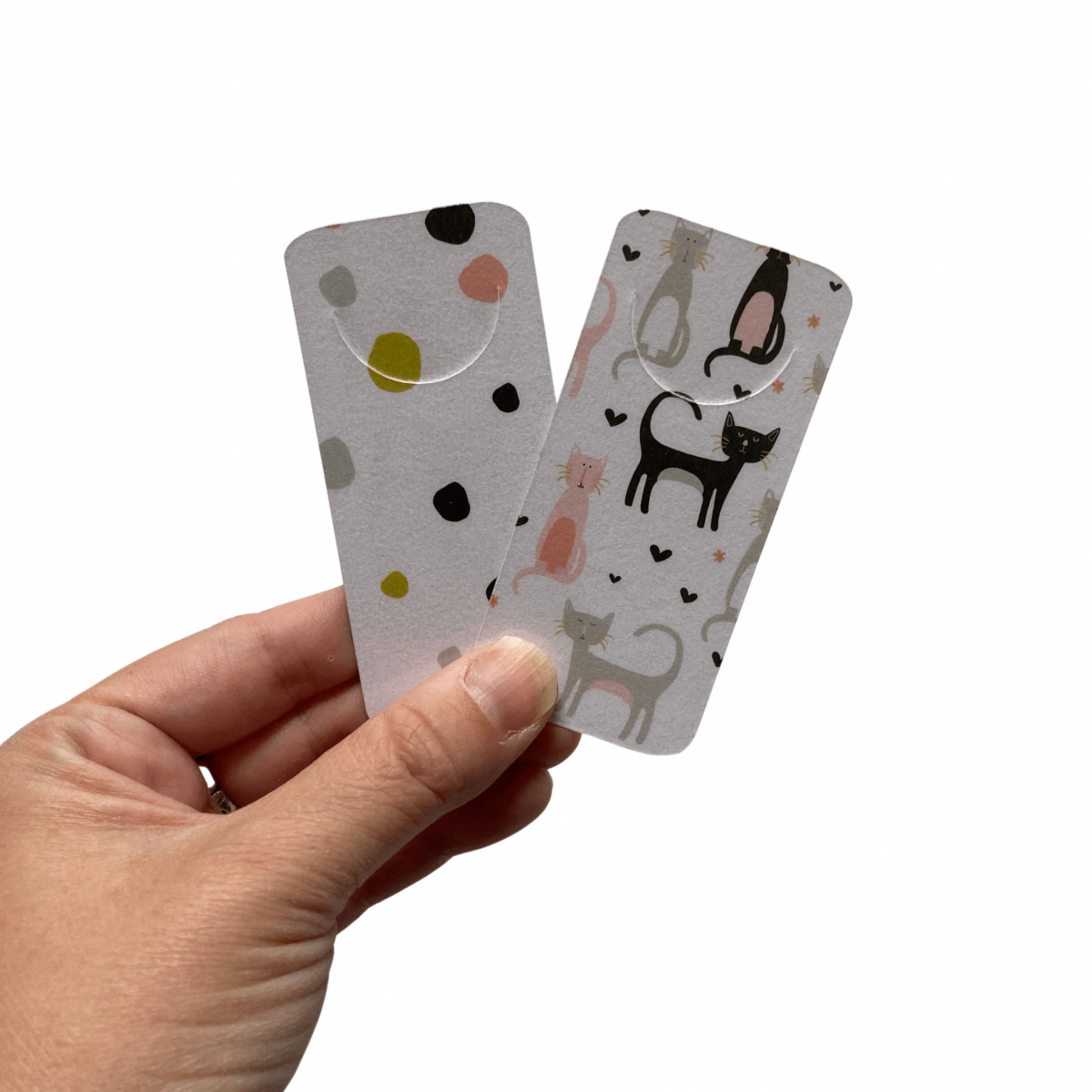 Handle with care. While the bookmarks are made from sturdy, laminated cardstock, repeated use will likely cause some wear and tear. Be careful when lifting tab to attach to your page.