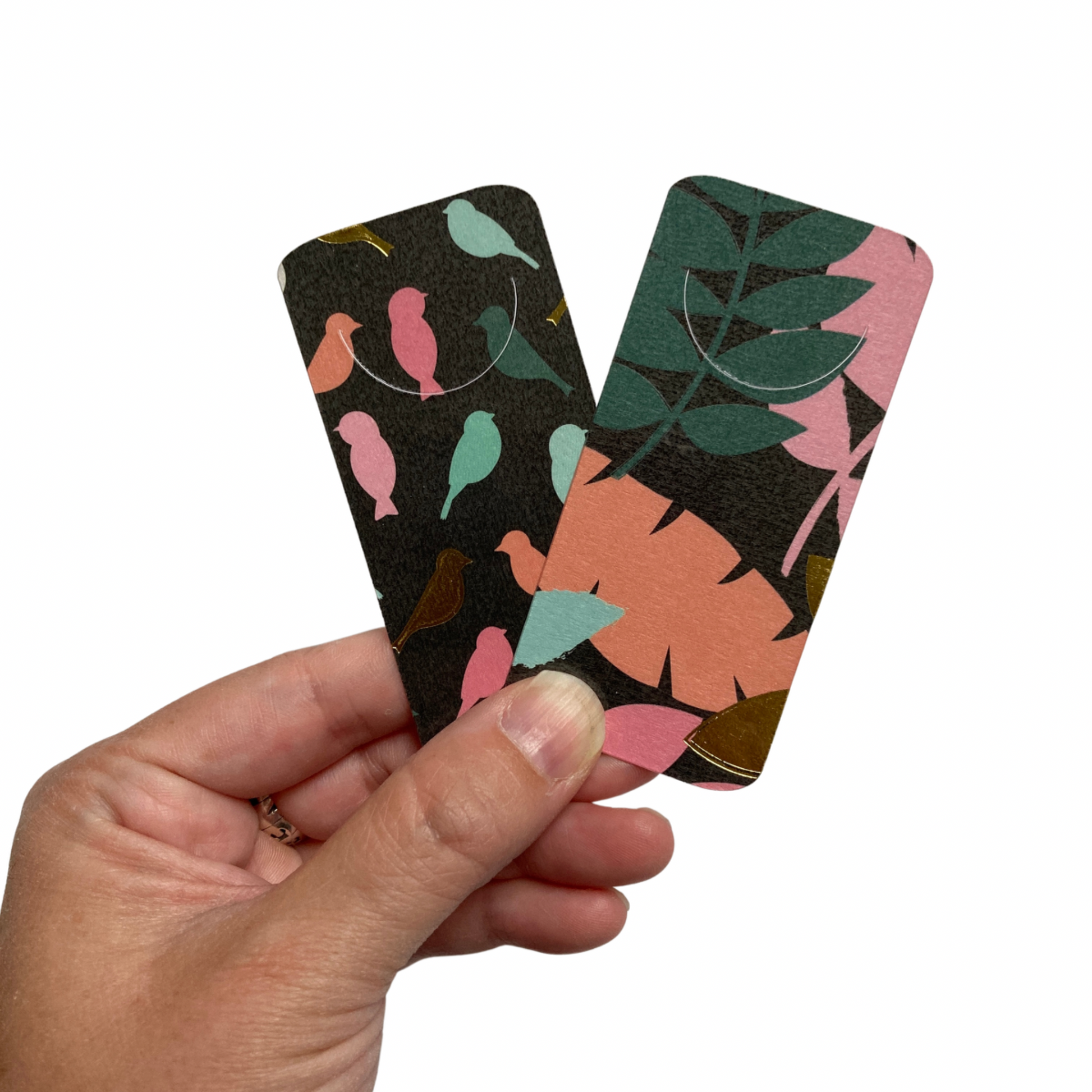 Handle with care. While the bookmarks are made from sturdy, laminated cardstock, repeated use will likely cause some wear and tear. Be careful when lifting tab to attach to your page.