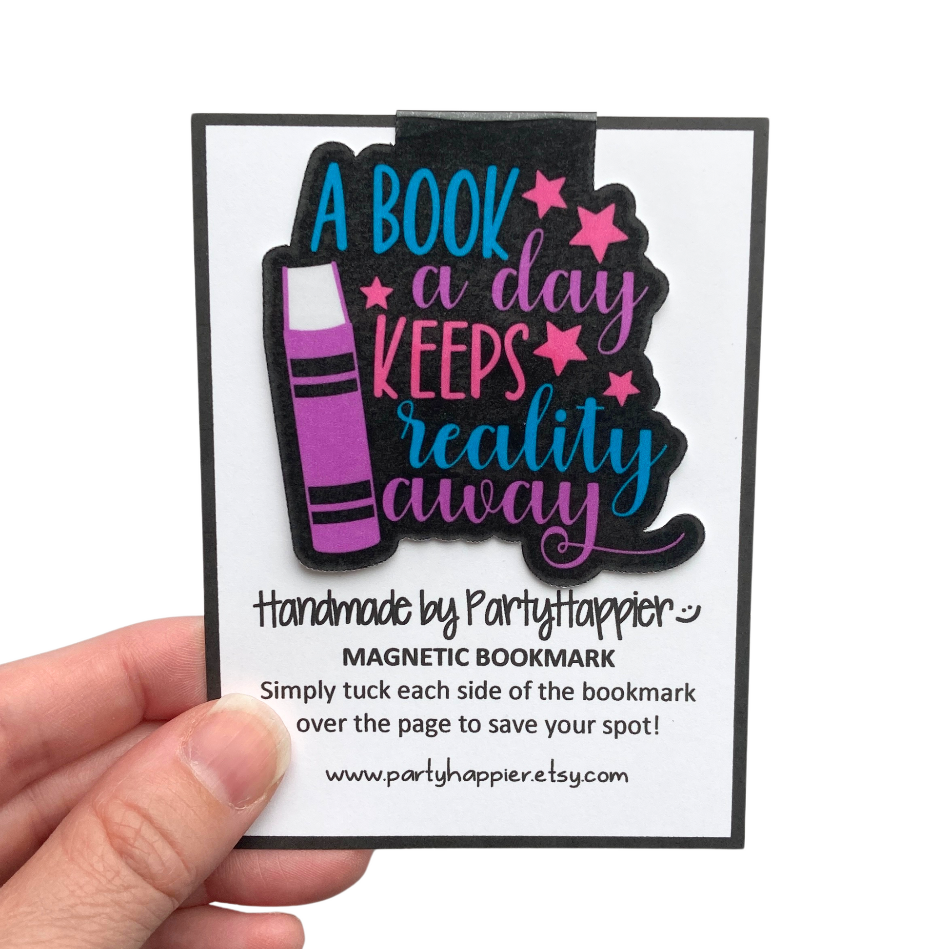 This listing is for one magnetic bookmark that says, "A Book A Day Keeps Reality Away." It's perfect for holding your place just about anywhere! Use it in your favorite book, planner, notebook, or wherever your heart desires!