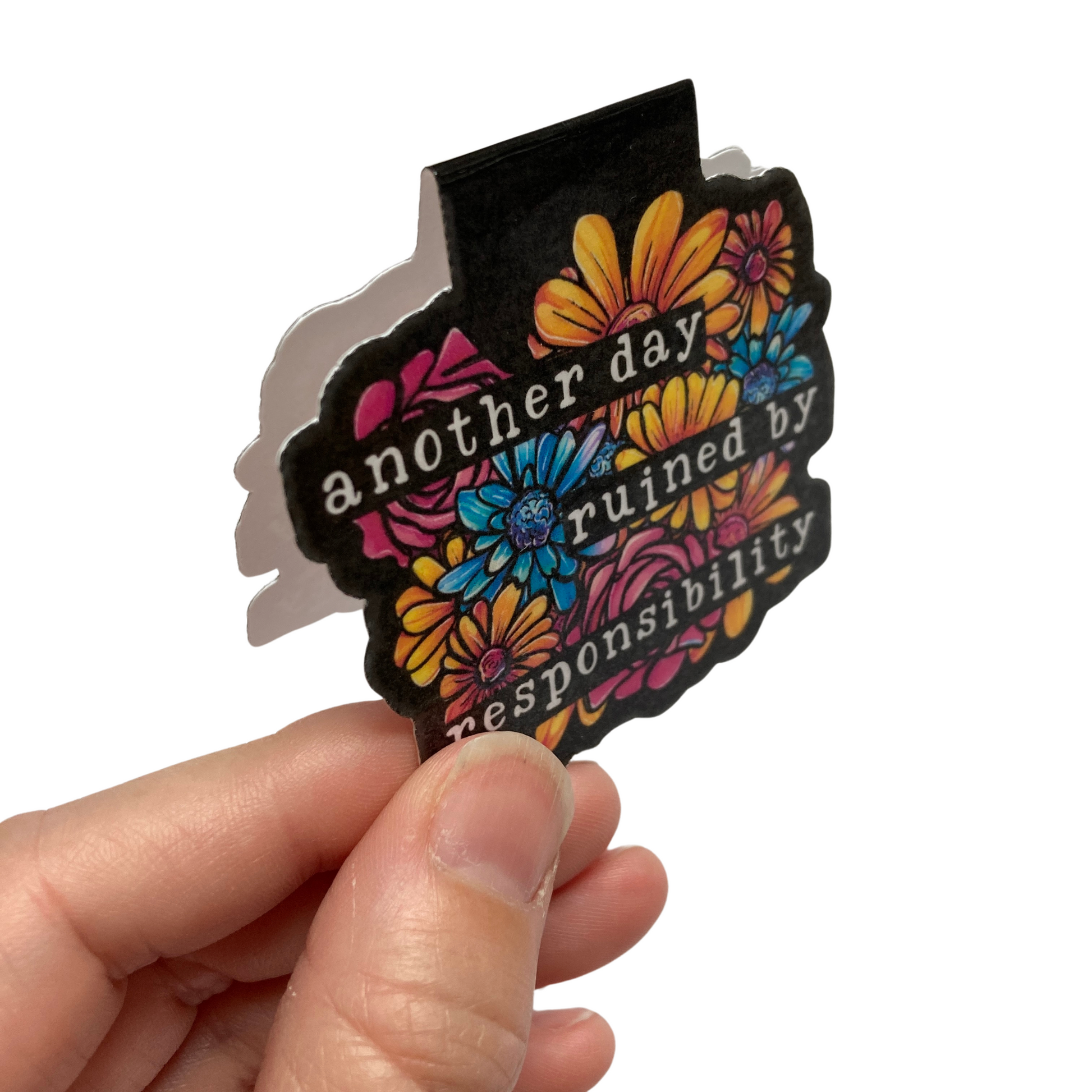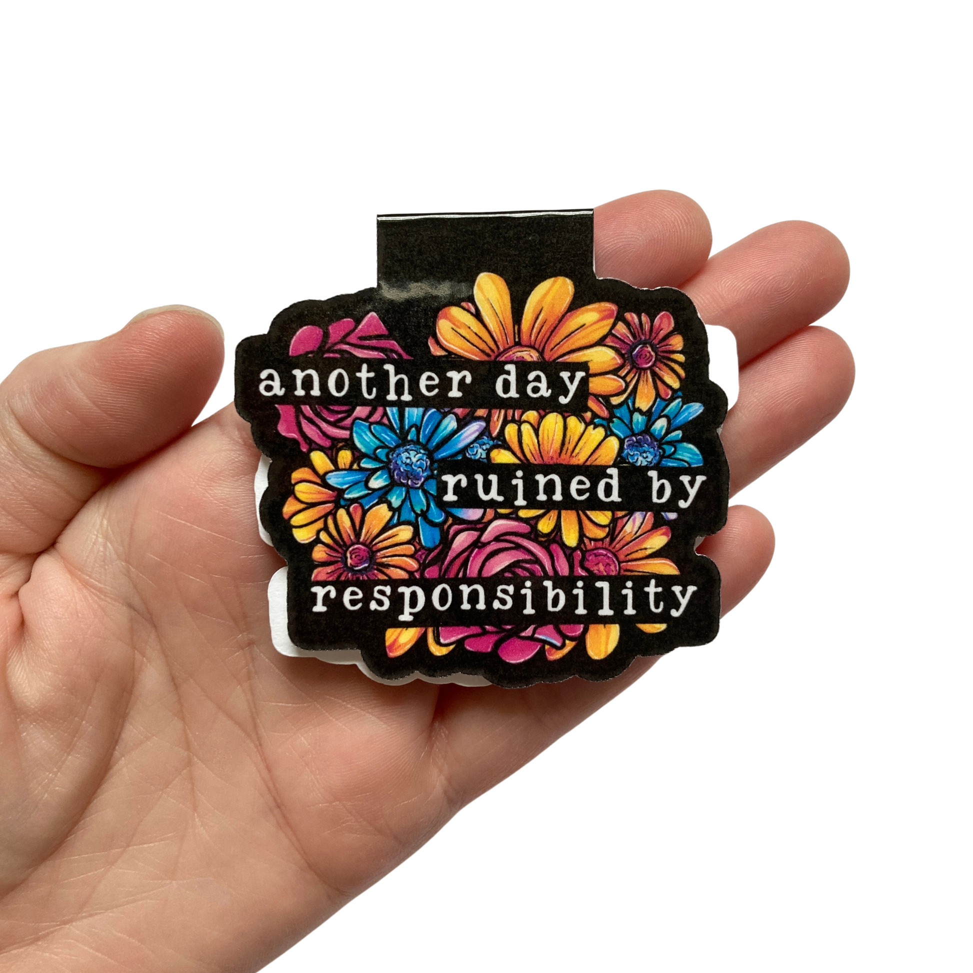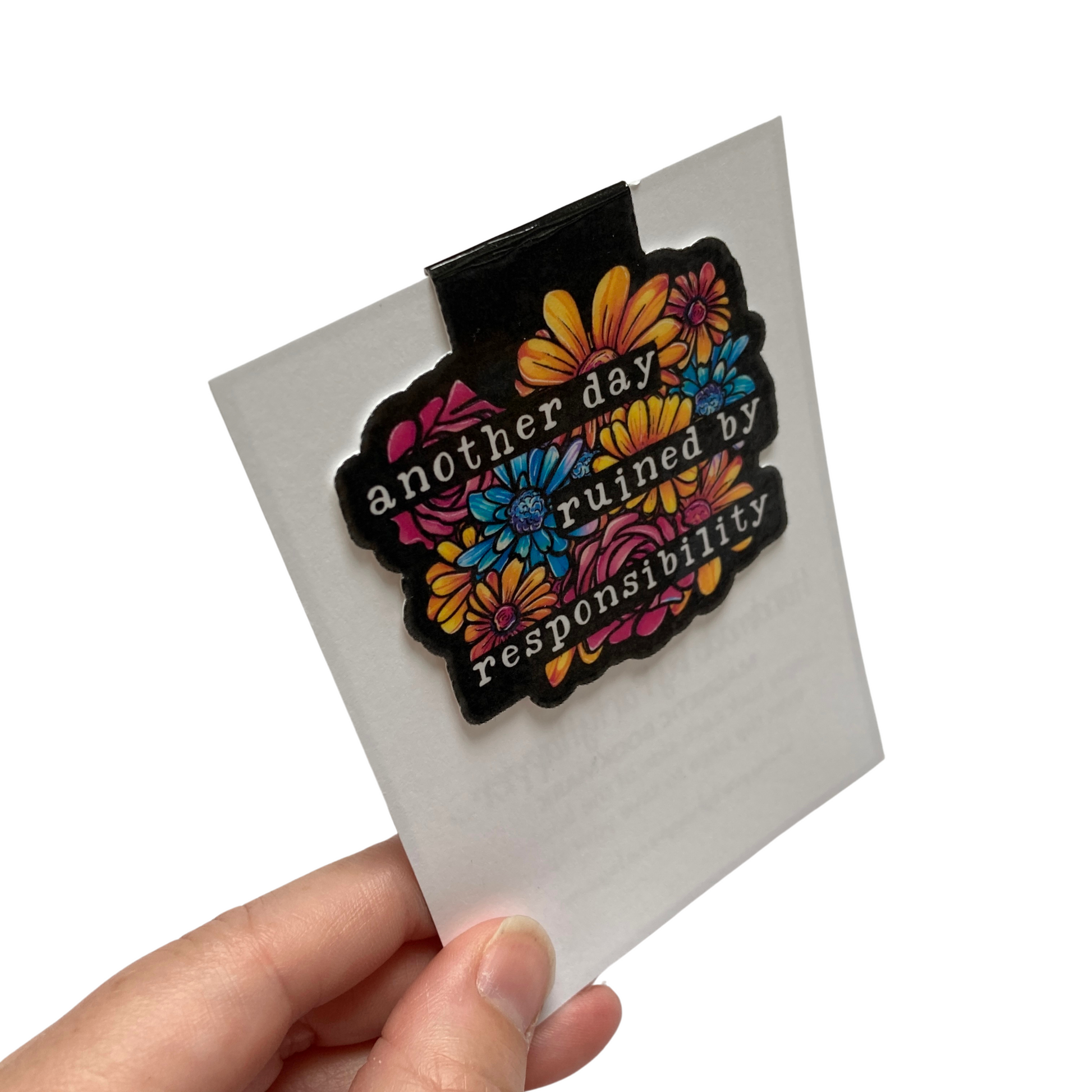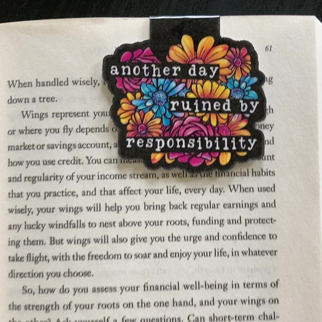 This listing is for one magnetic bookmark that says, "Another Day Ruined By Responsibility" It's perfect for holding your place just about anywhere! Use it in your favorite book, planner, notebook, or wherever your heart desires!