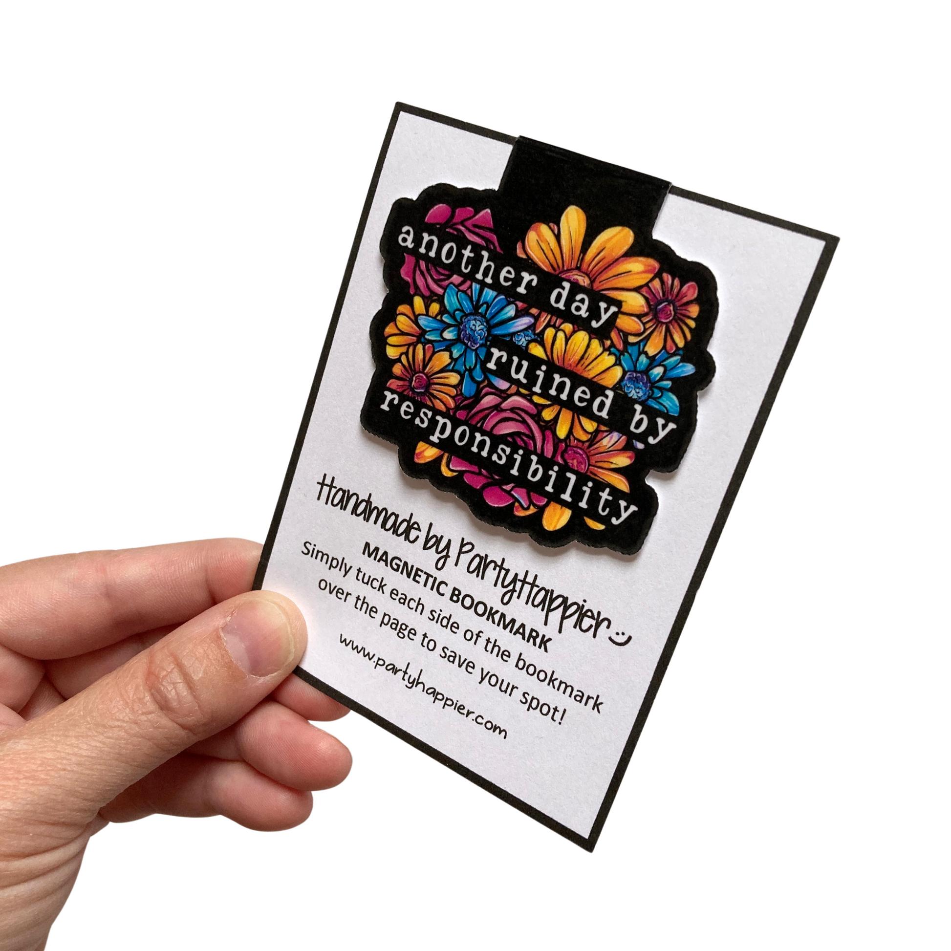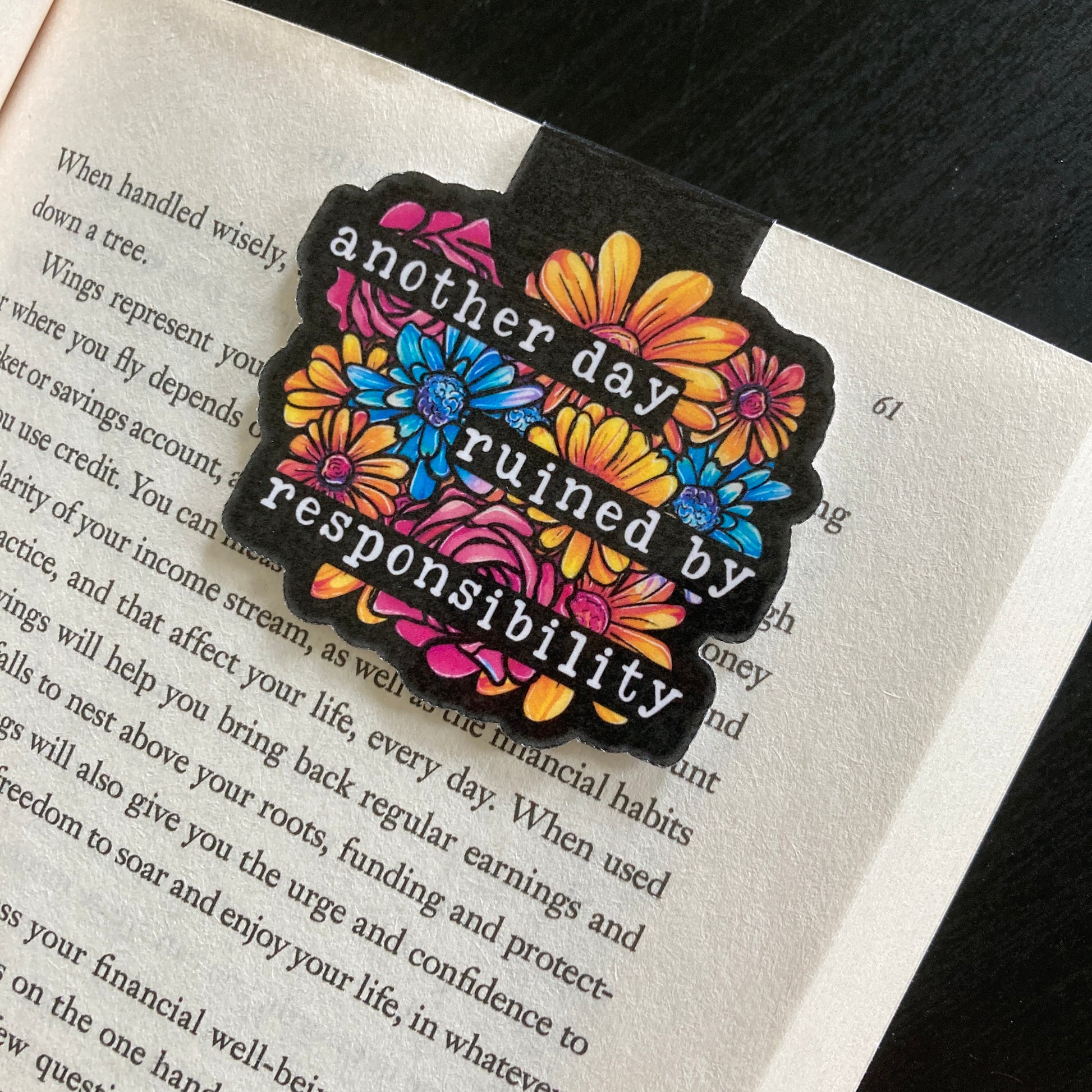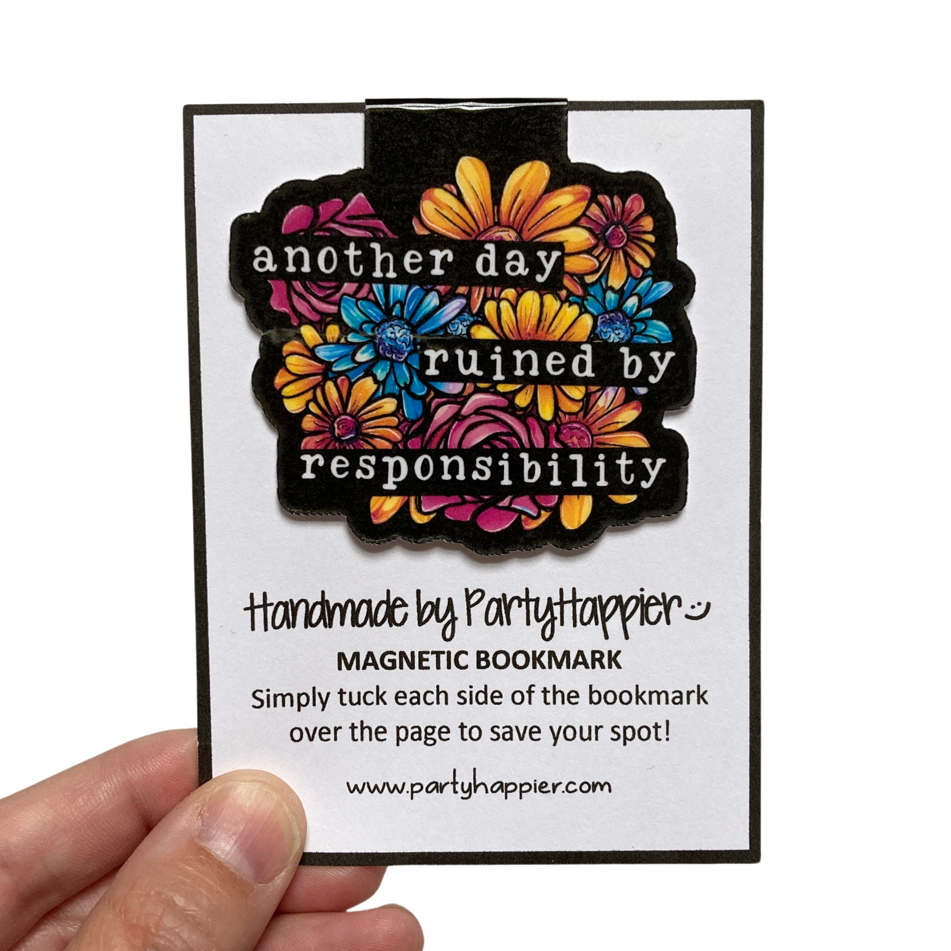 This listing is for one magnetic bookmark that says, "Another Day Ruined By Responsibility" It's perfect for holding your place just about anywhere! Use it in your favorite book, planner, notebook, or wherever your heart desires!