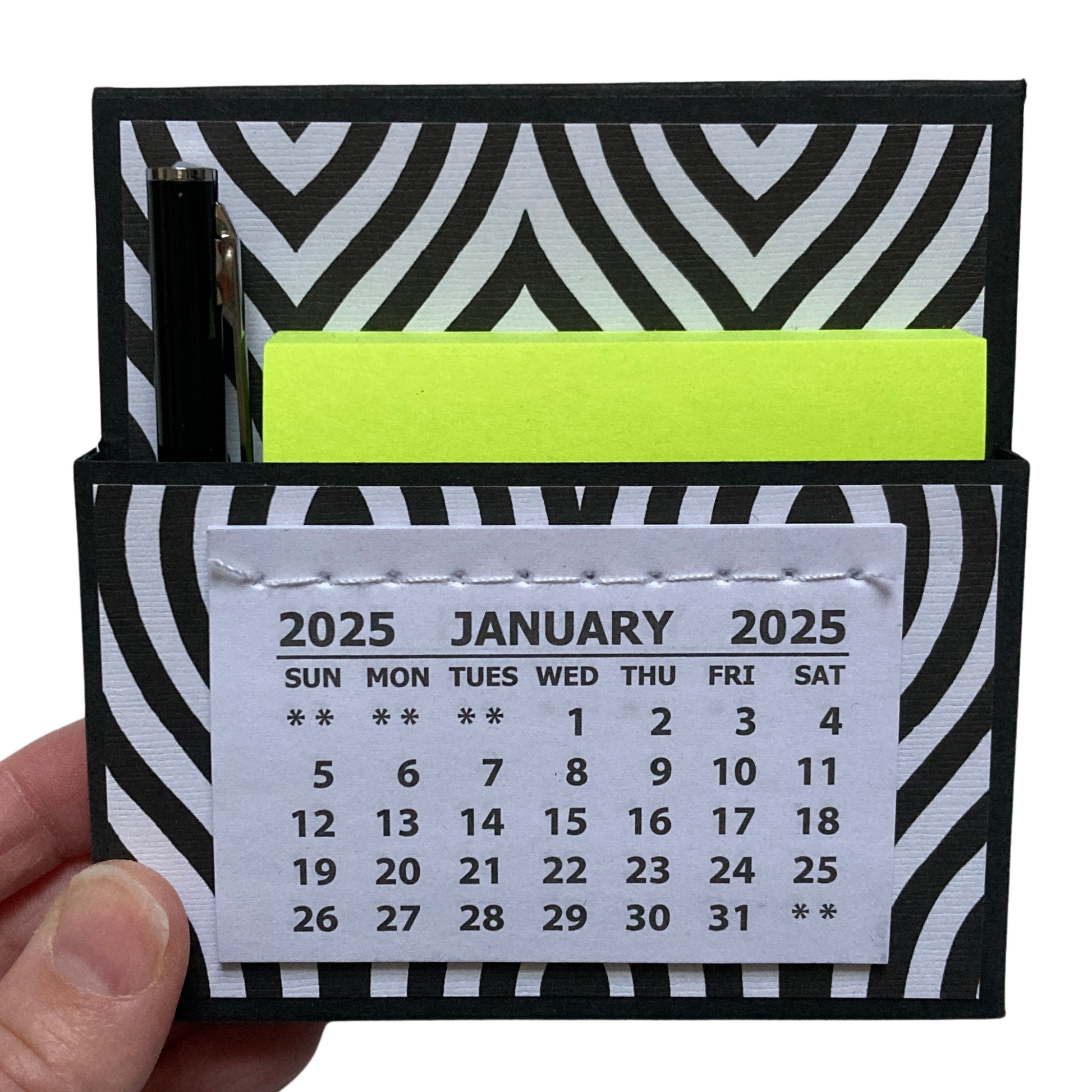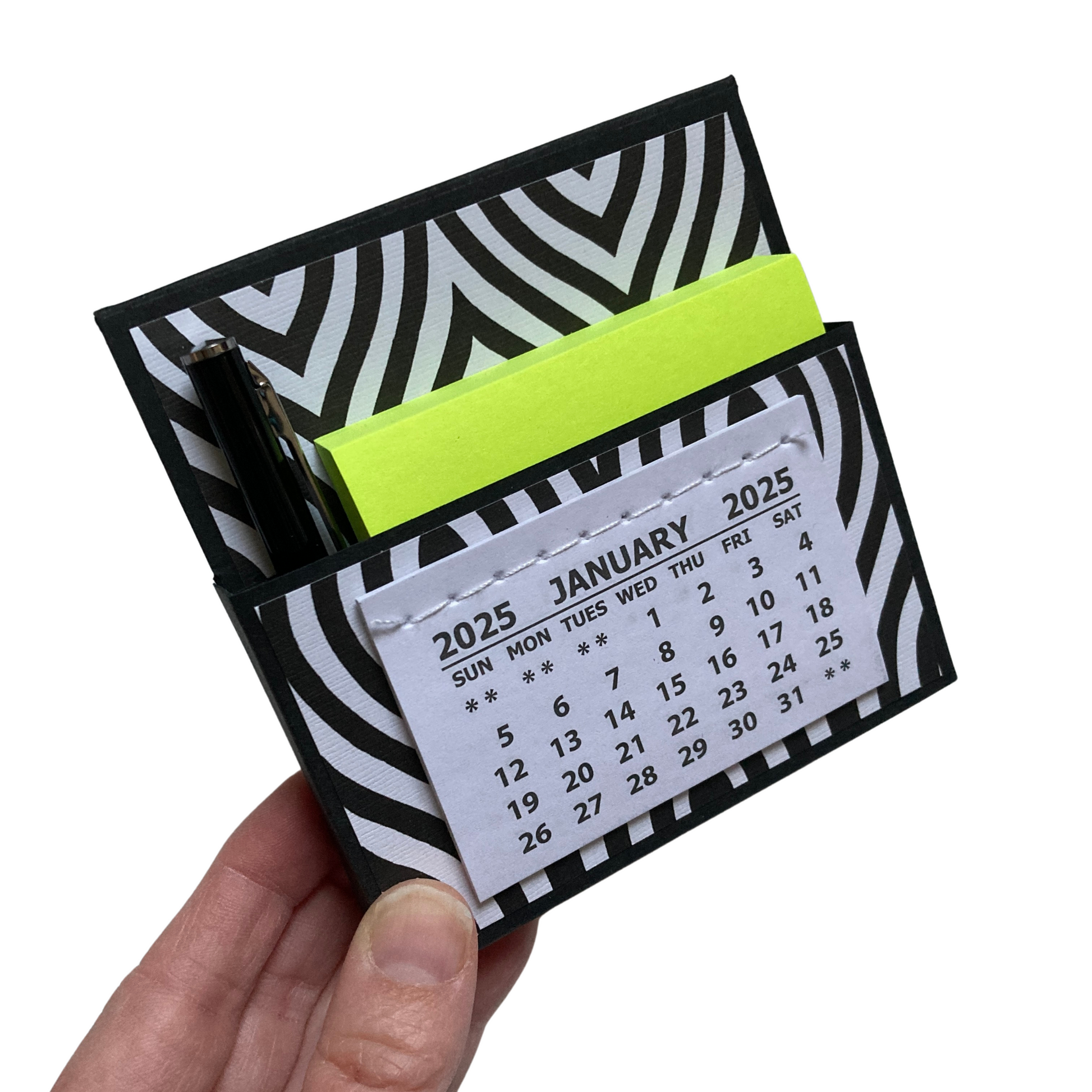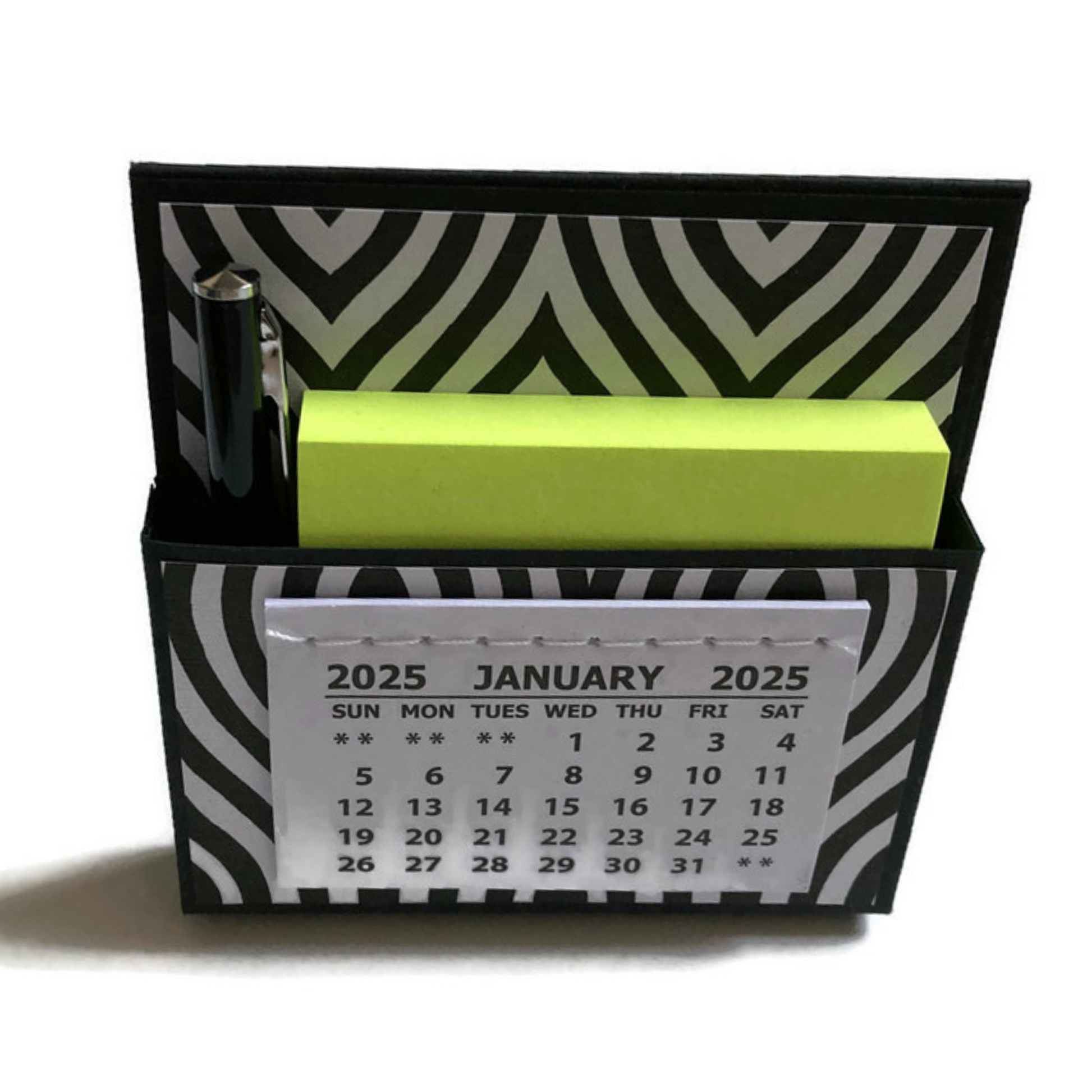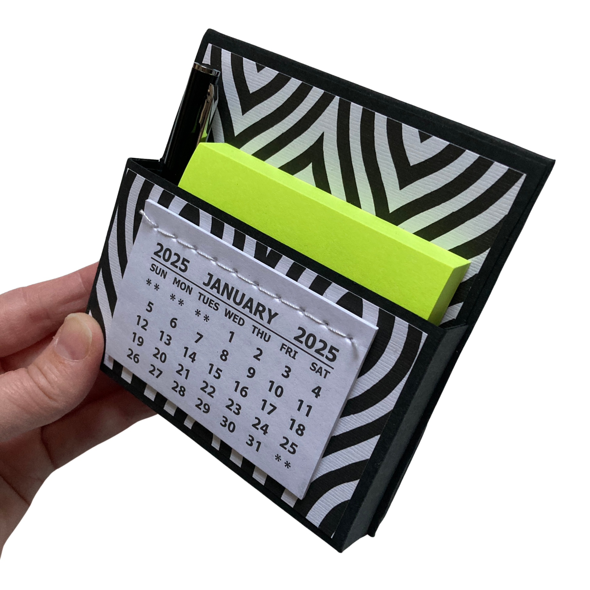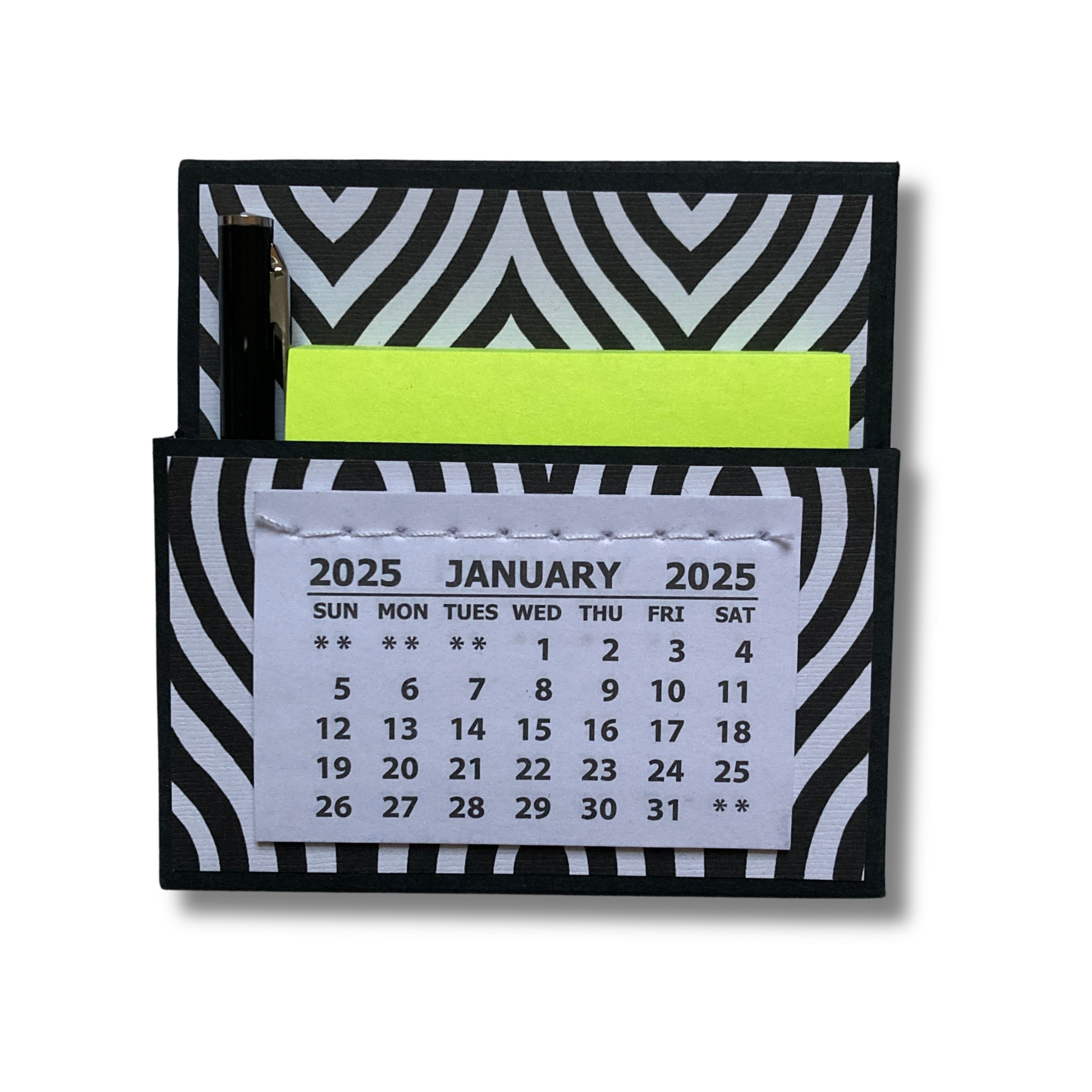 Want a way to add some adorable flair to your home or office? Look no further than this cute little 2025 standing desk calendar! Not only is it a calendar, but it also contains a pocket filled with a sticky note pack and mini pen. It's perfect for keeping yourself organized or giving as a gift!