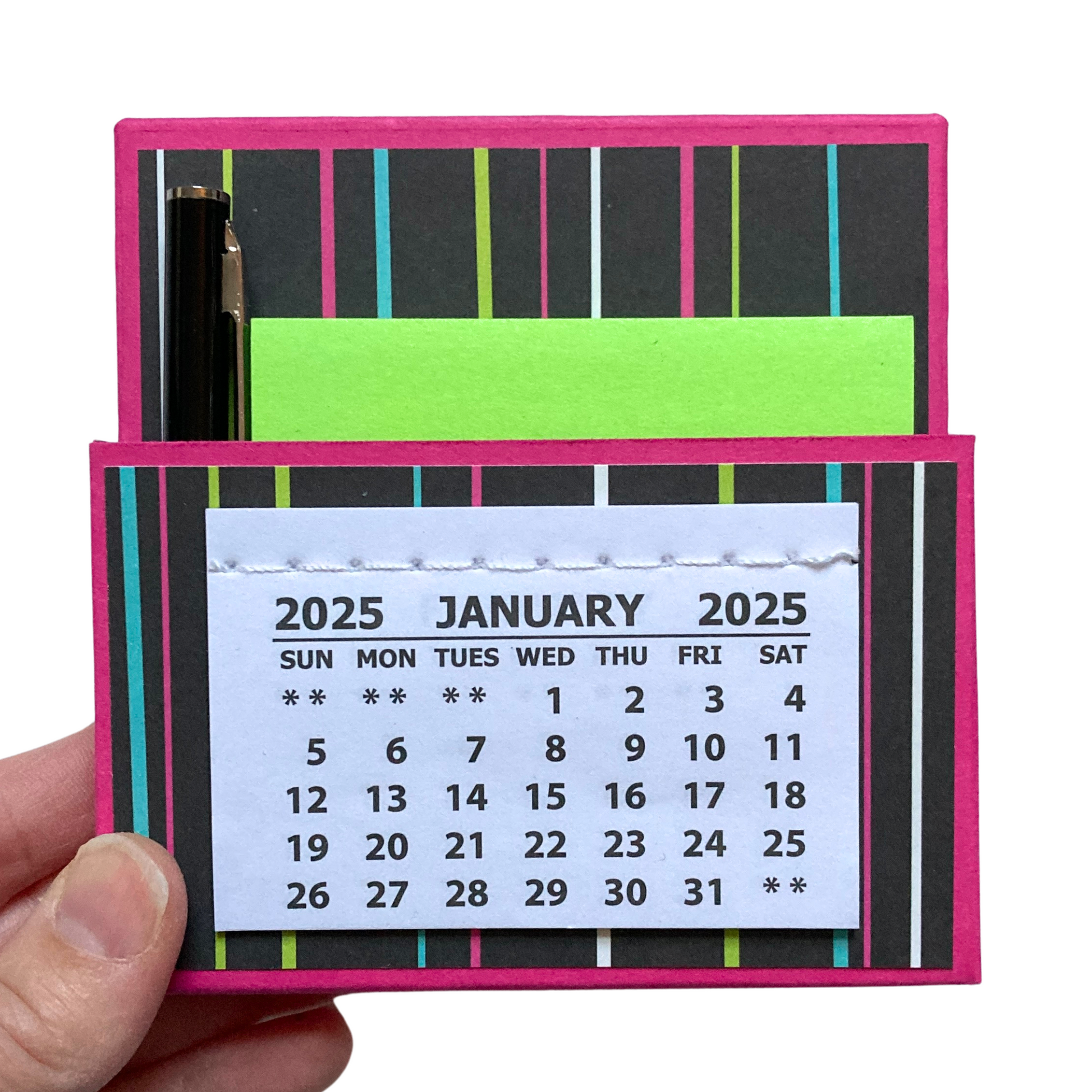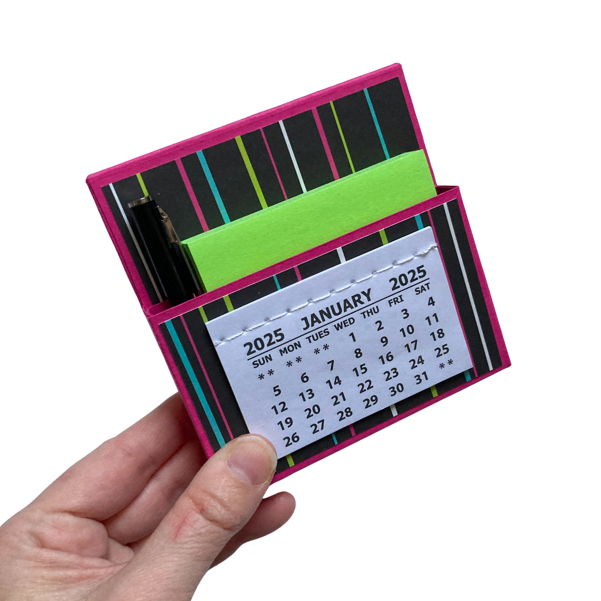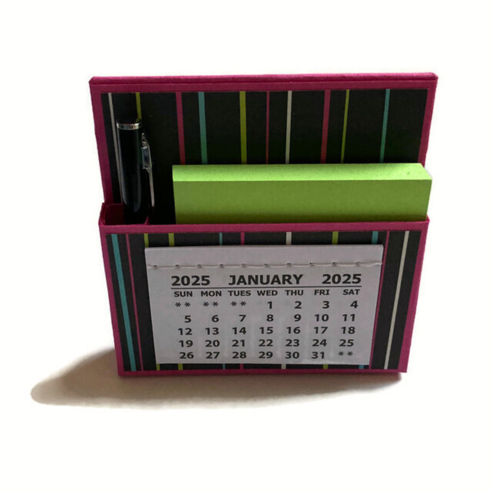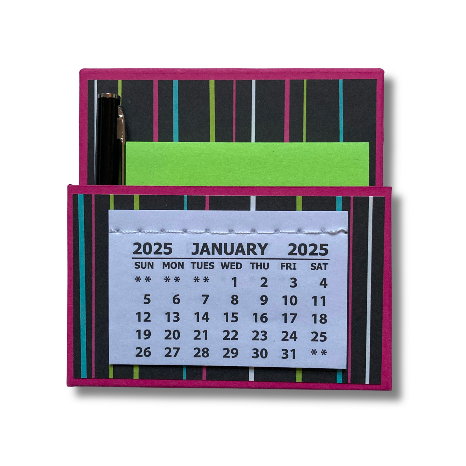 Want a way to add some adorable flair to your home or office? Look no further than this cute little 2025 standing desk calendar! Not only is it a calendar, but it also contains a pocket filled with a sticky note pack and mini pen. It's perfect for keeping yourself organized or giving as a gift!