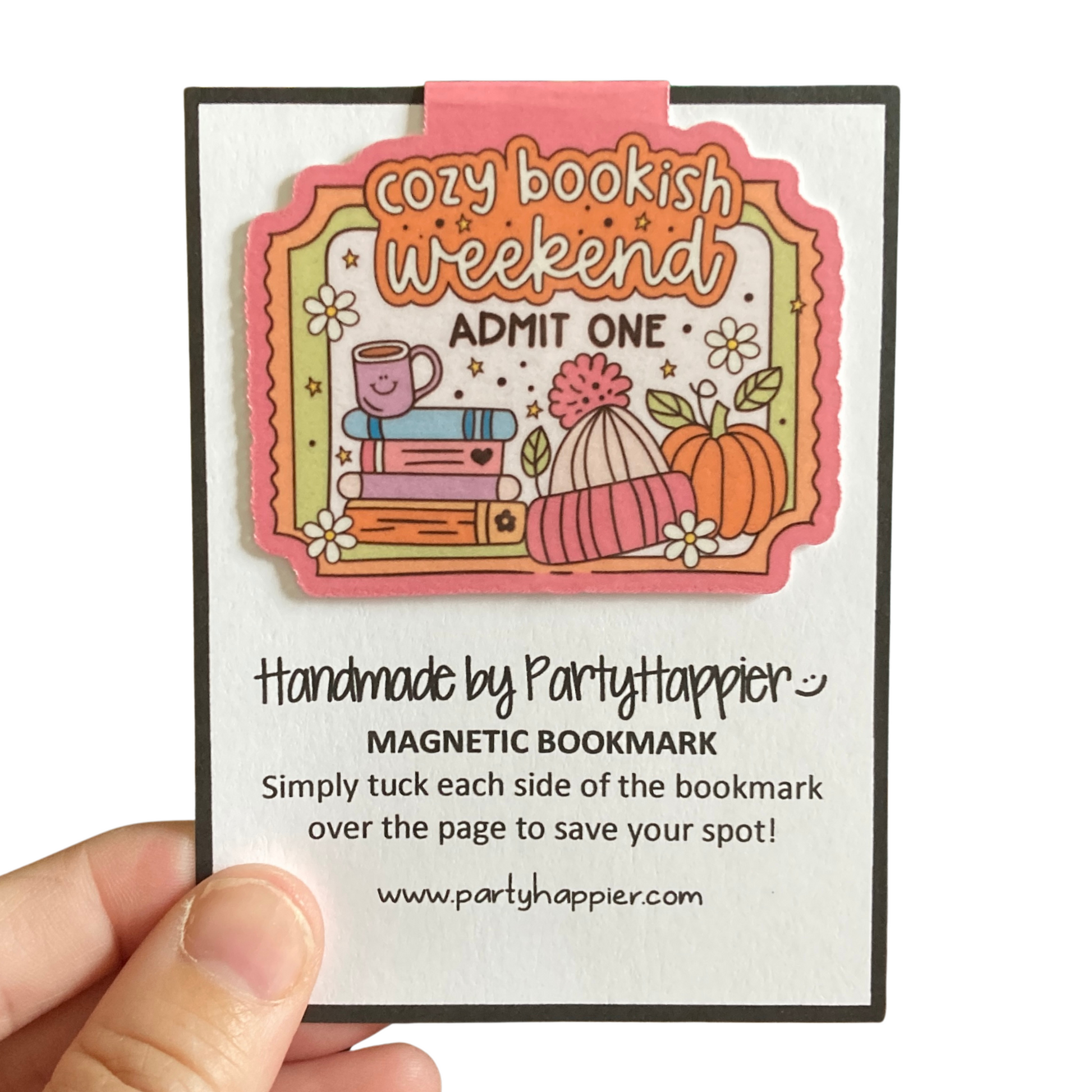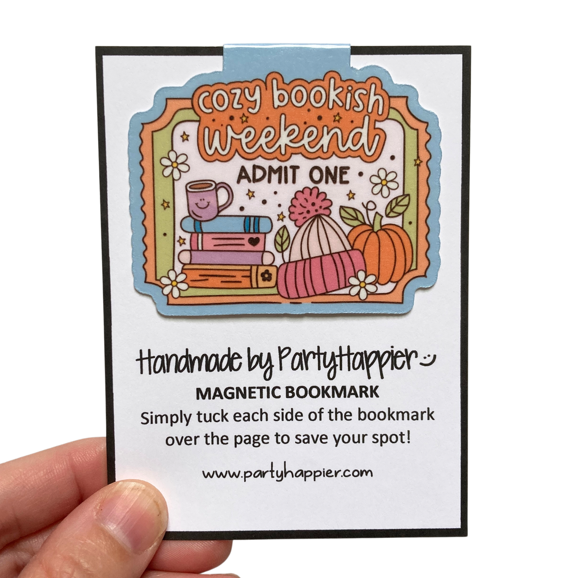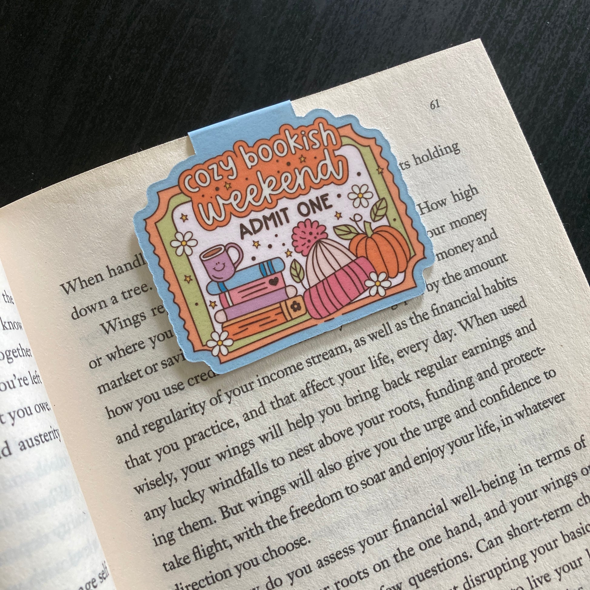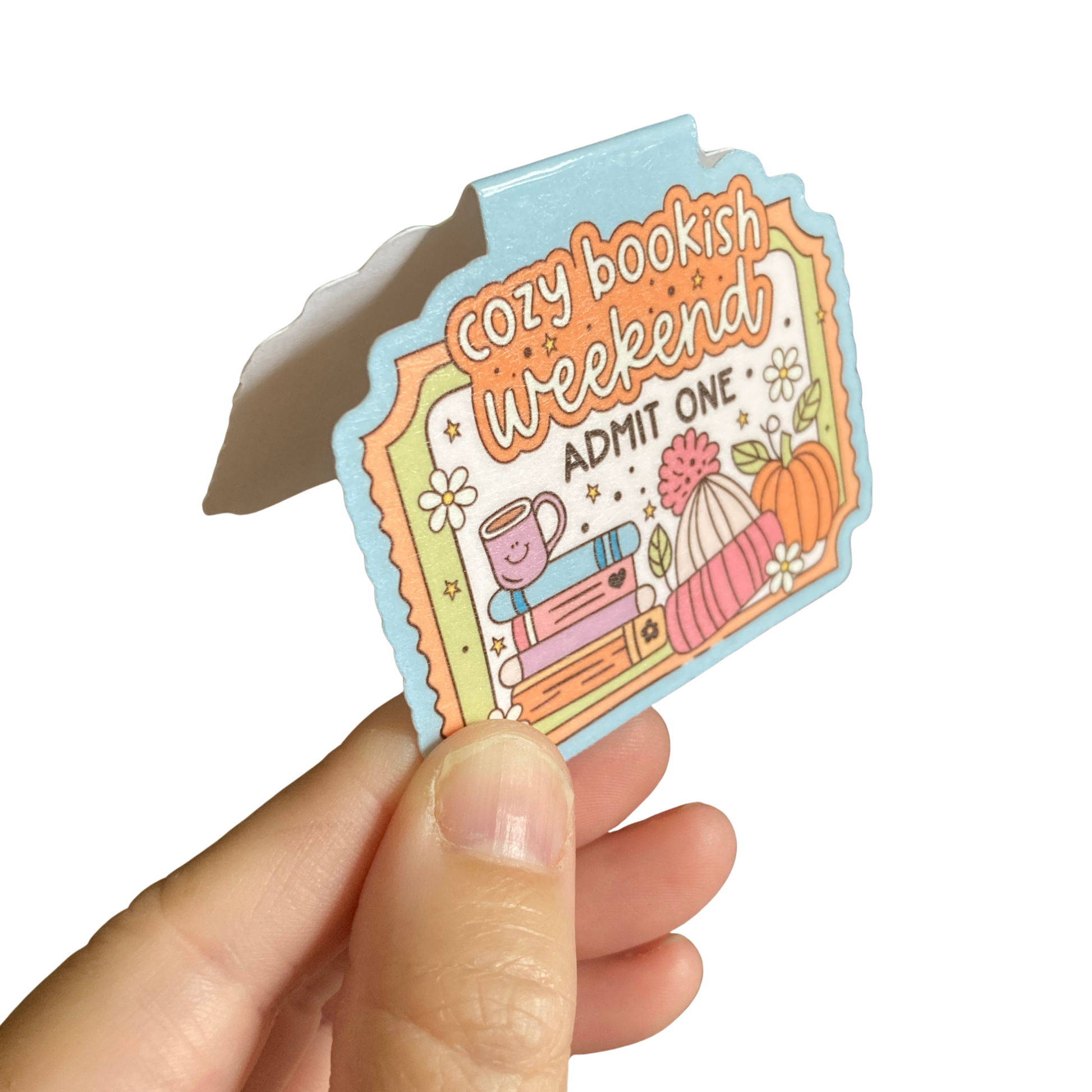 This listing is for one magnetic bookmark that says, "Cozy Bookish Weekend - Admit One." It's perfect for holding your place just about anywhere! Use it in your favorite book, planner, notebook, or wherever your heart desires!
