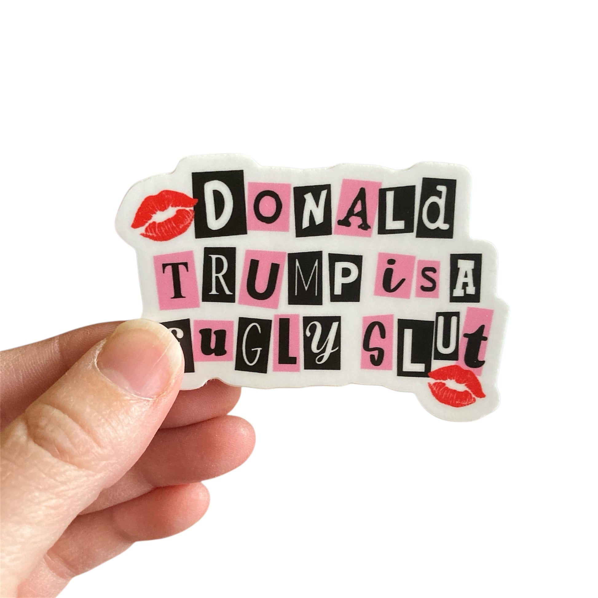 This listing is for one "Donald Trump Is A Fugly Slut" sticker. How relatable is this to Mean Girls fans?! It is the perfect addition to your water bottle, computer, notebook, or any surface your heart desires!