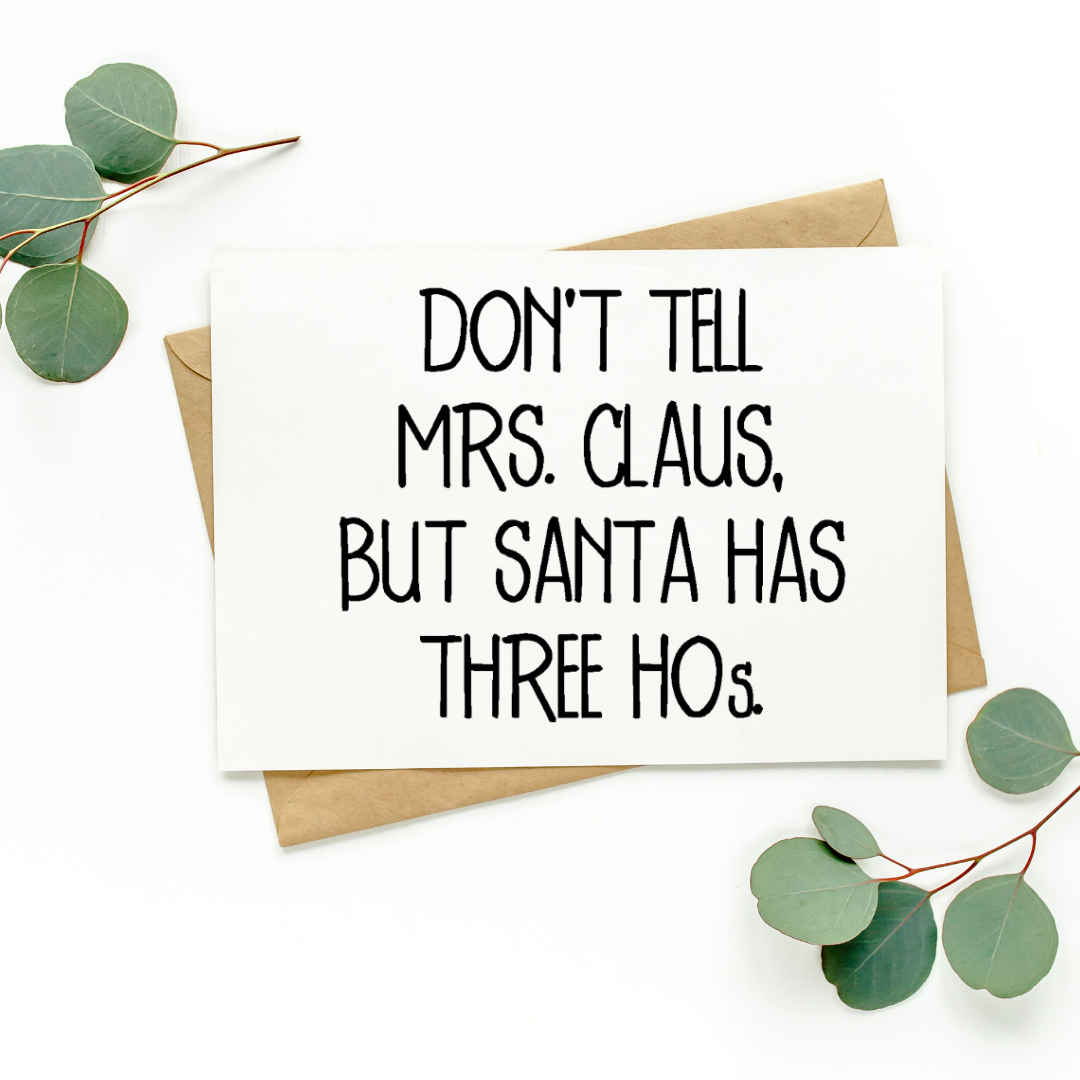 This listing is for one blank greeting card that says, "Don't Tell Mrs. Claus, But Santa Has Three Hos." You know someone in your life will get a total kick out of this card for the holidays!
