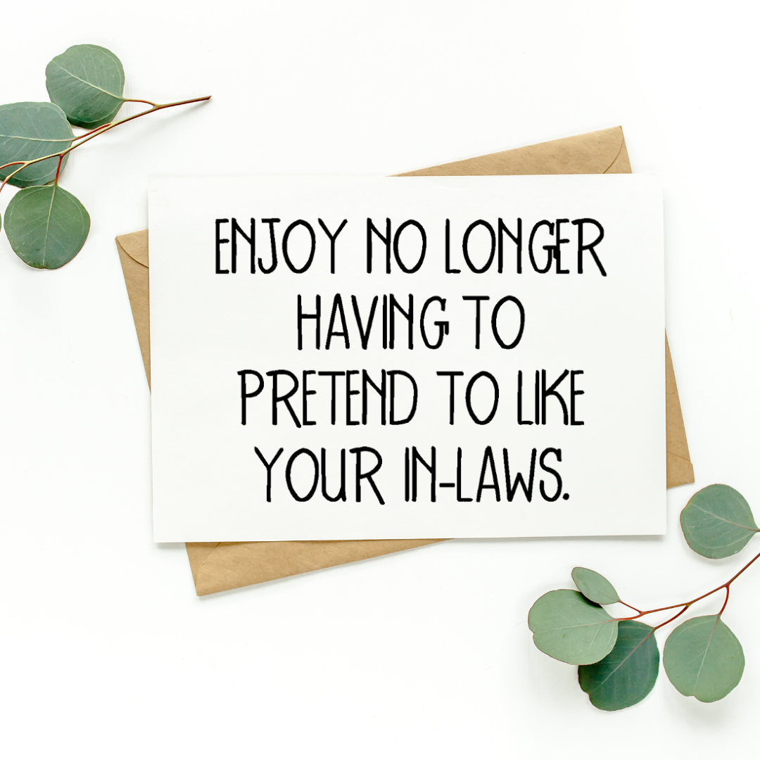 This listing is for one blank greeting card that says, "Enjoy No Longer Having To Pretend To Like Your In-Laws." It is a hilarious way to celebrate someone's divorce.