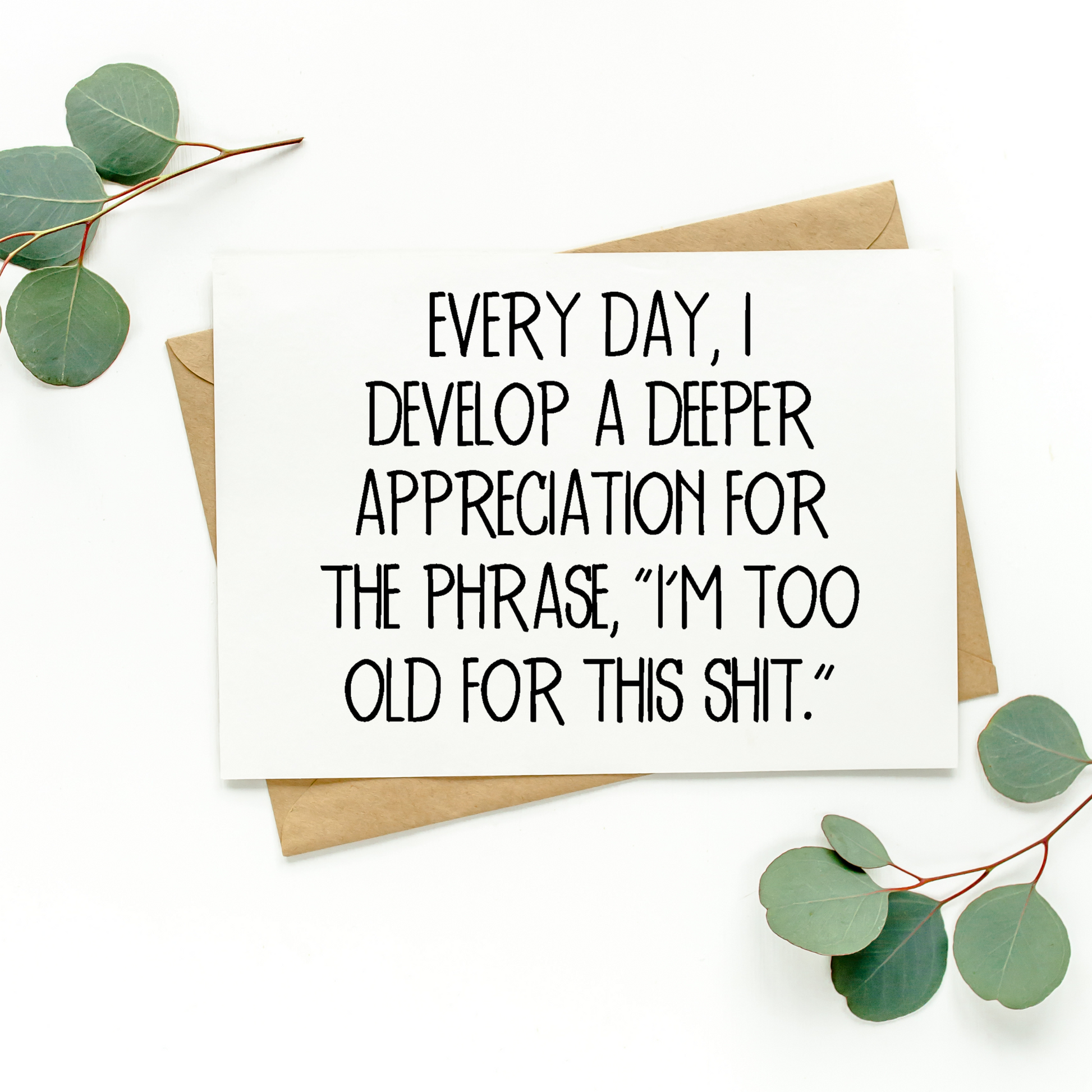 This listing is for one blank greeting card that says, "Every Day, I Develop A Deeper Appreciation For The Phrase, "I'm Too Old For This Shit.'" The card is a hilarious way to celebrate someone's birthday or any fun occasion!