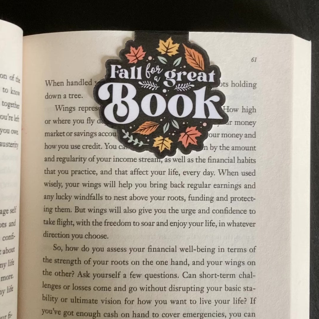 This listing is for one magnetic bookmark that says, "Fall for a Great Book." It's perfect for holding your place just about anywhere! Use it in your favorite book, planner, notebook, or wherever your heart desires!