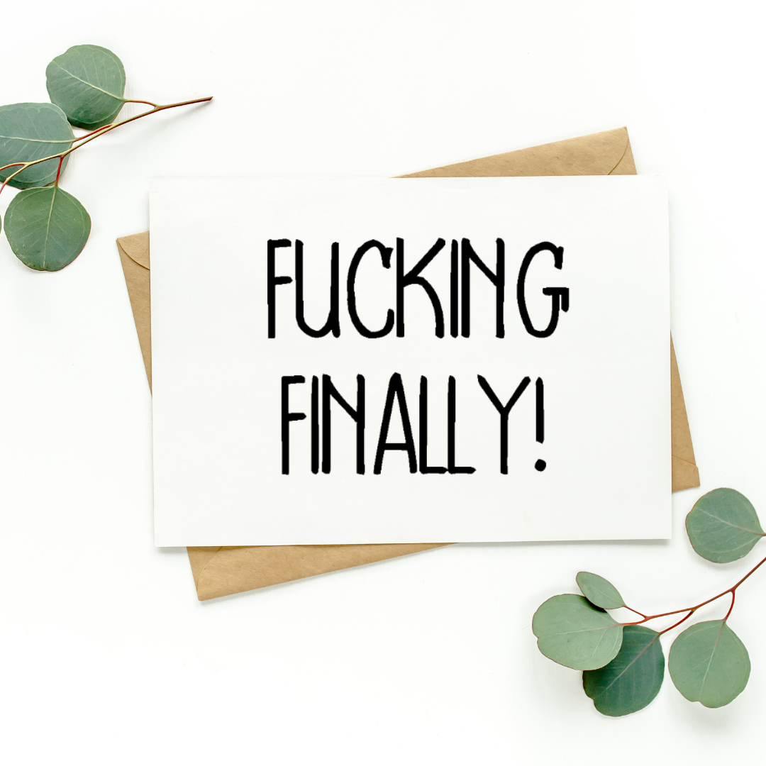 This listing is for one blank greeting card that says, "Fucking Finally!" It's simple yet perfect for so many celebratory occasions!