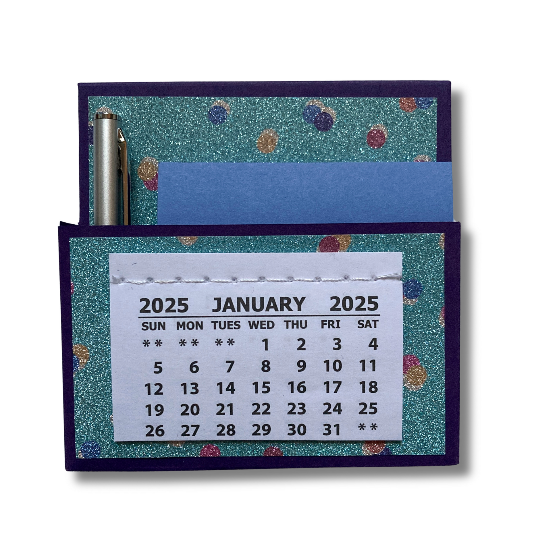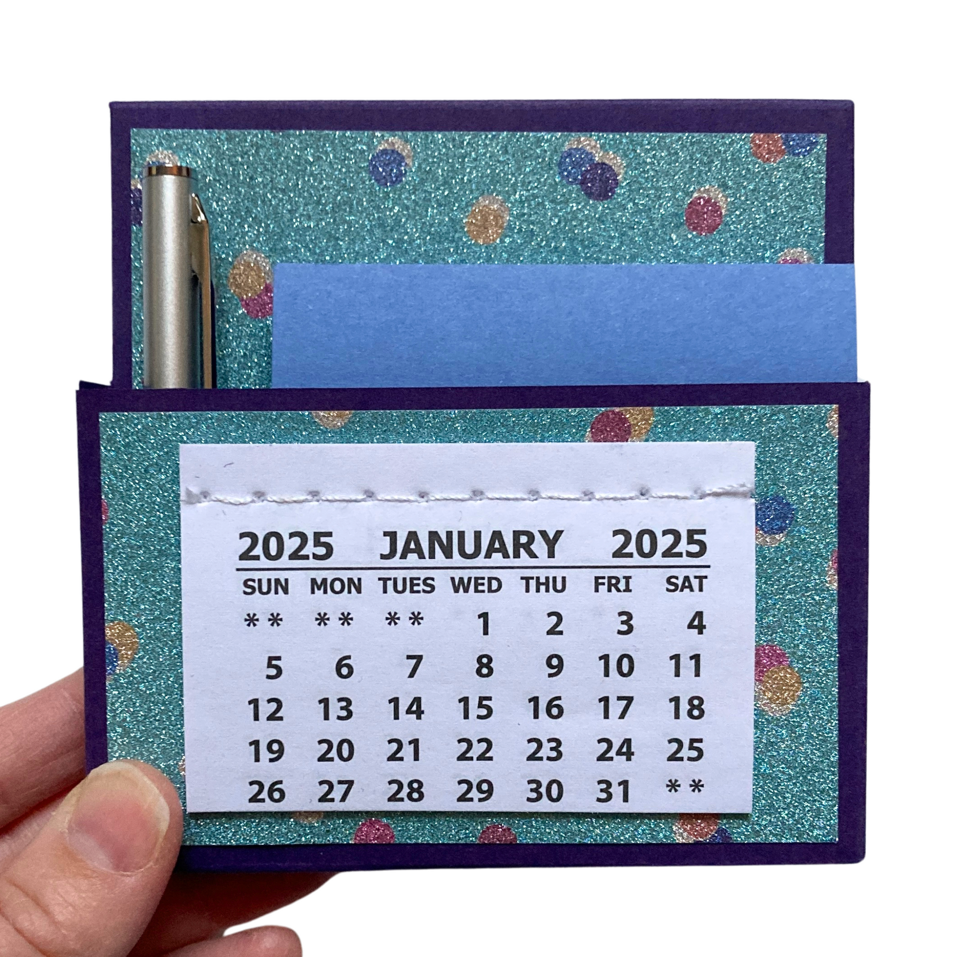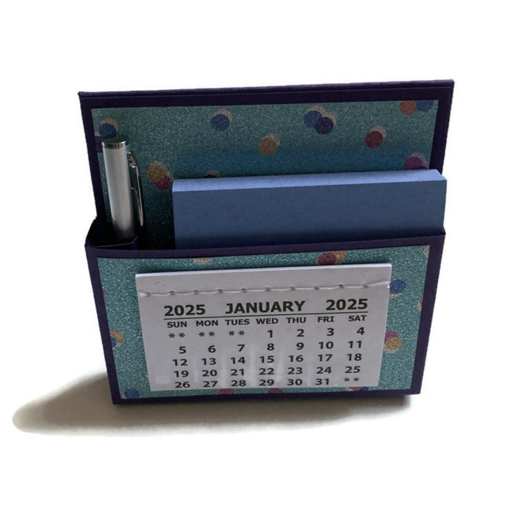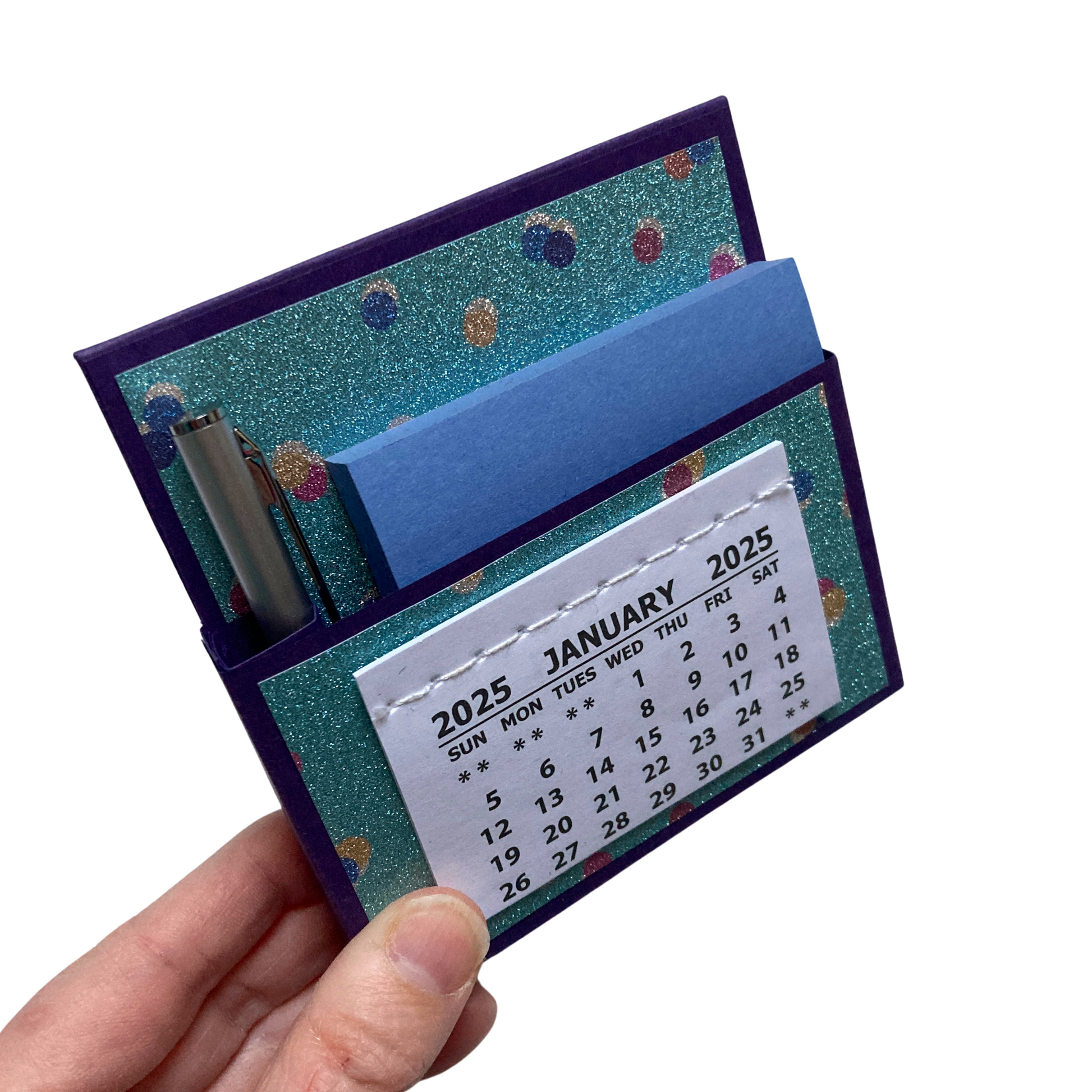 Want a way to add some adorable flair to your home or office? Look no further than this cute little 2025 standing desk calendar! Not only is it a calendar, but it also contains a pocket filled with a sticky note pack and mini pen. It's perfect for keeping yourself organized or giving as a gift!