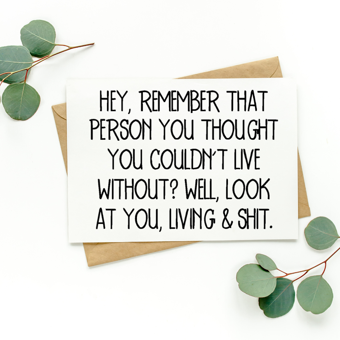 This listing is for one blank greeting card that says, "Hey, Remember That Person You Thought You Couldn't Live Without? Well, Look At You, Living & Shit." The card is the great way to encourage someone going through a breakup.