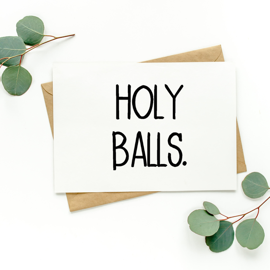 This listing is for one blank greeting card that says, "Holy Balls." From celebrating something awesome to dealing with a tough situation, and everything in between, this is the perfect card for so many occasions!