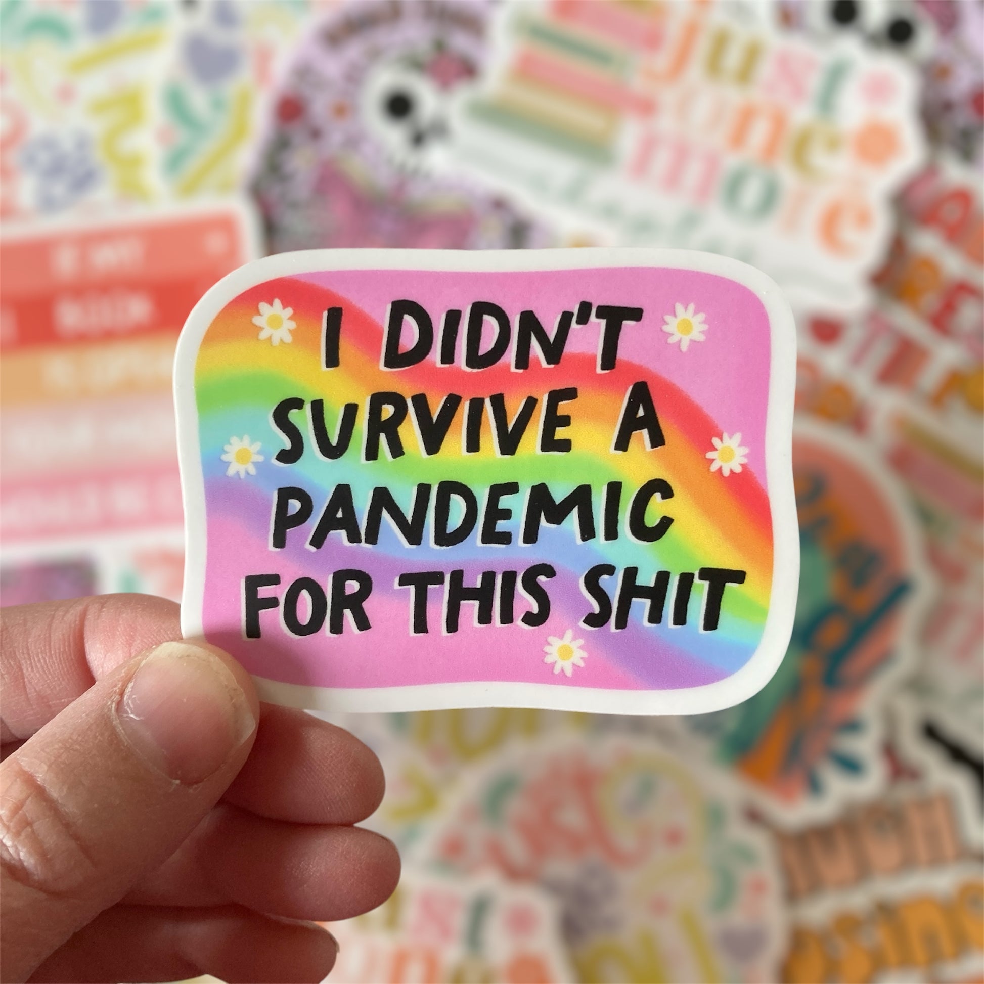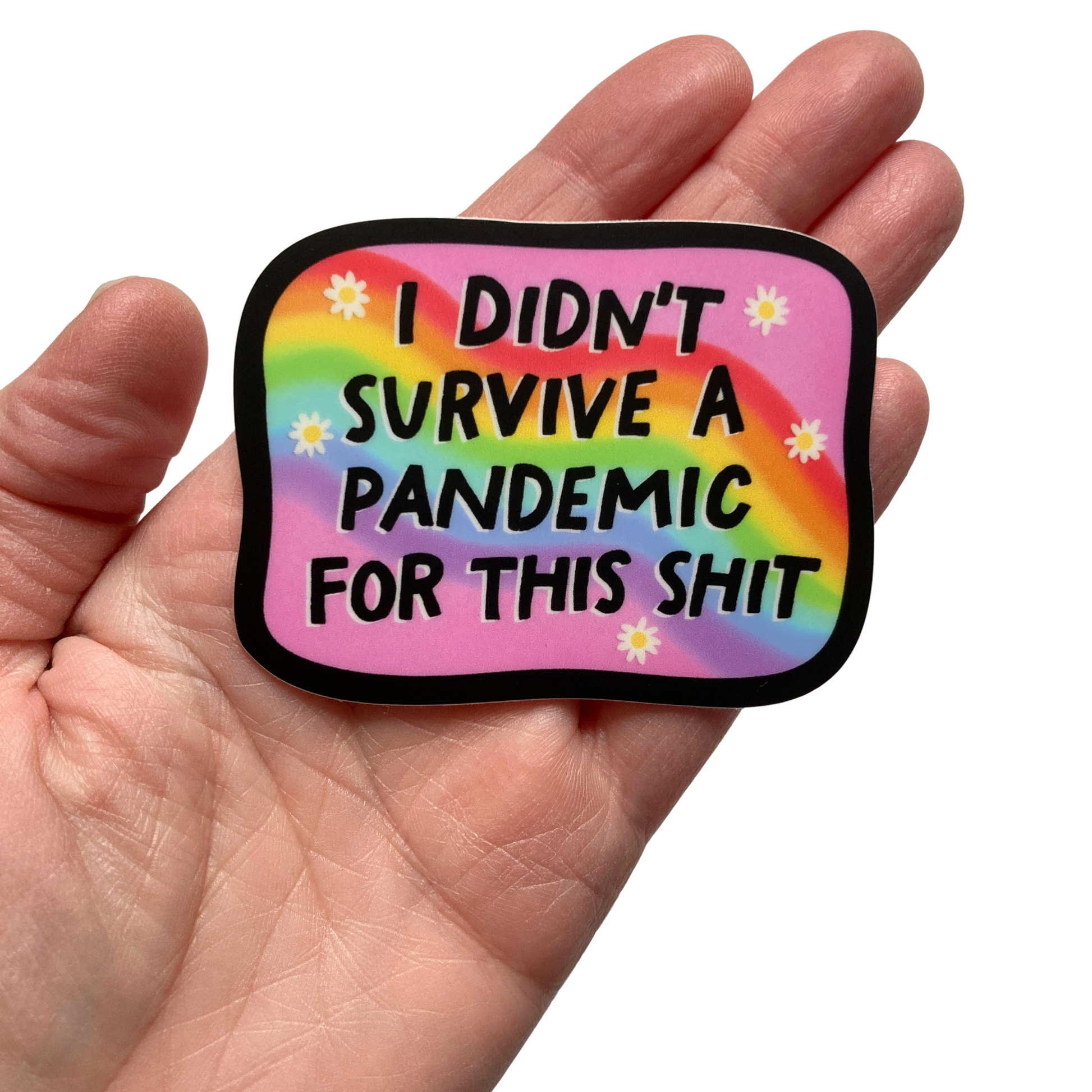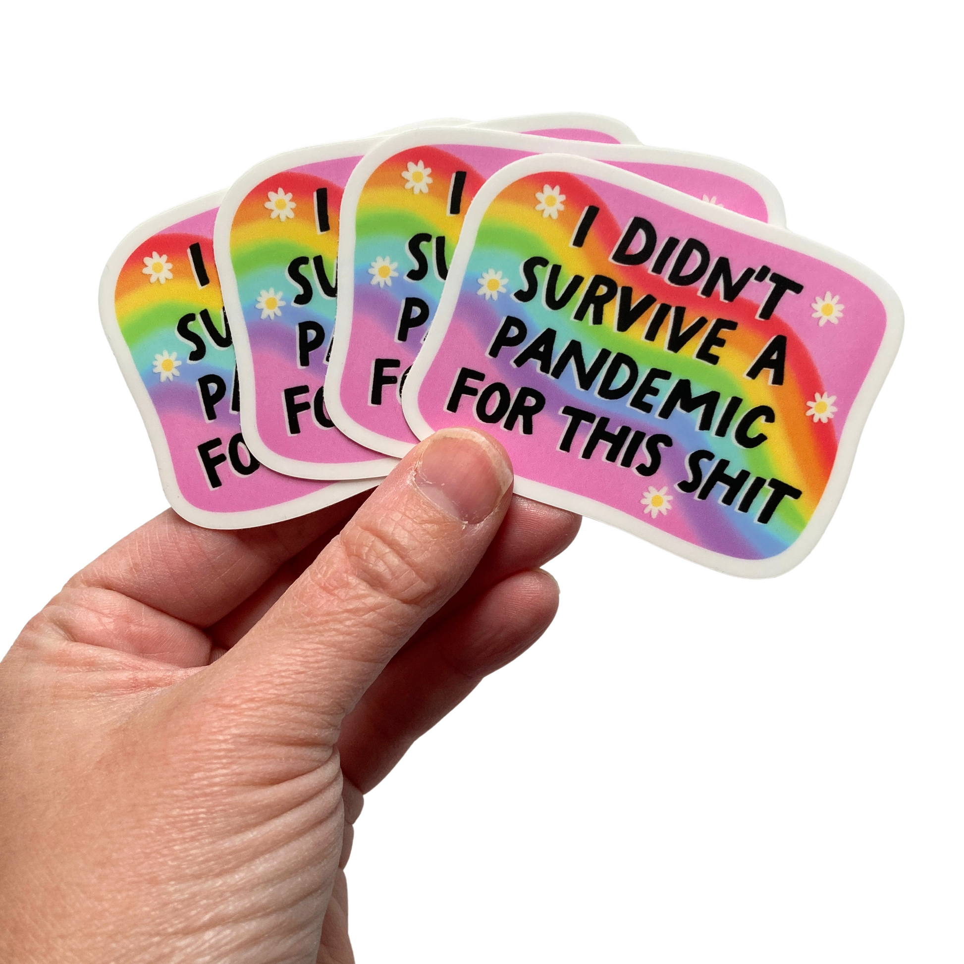 This listing is for one "I Didn't Survive A Pandemic For This Shit" sticker. It is the perfect addition to your water bottle, computer, notebook, or any surface your heart desires!