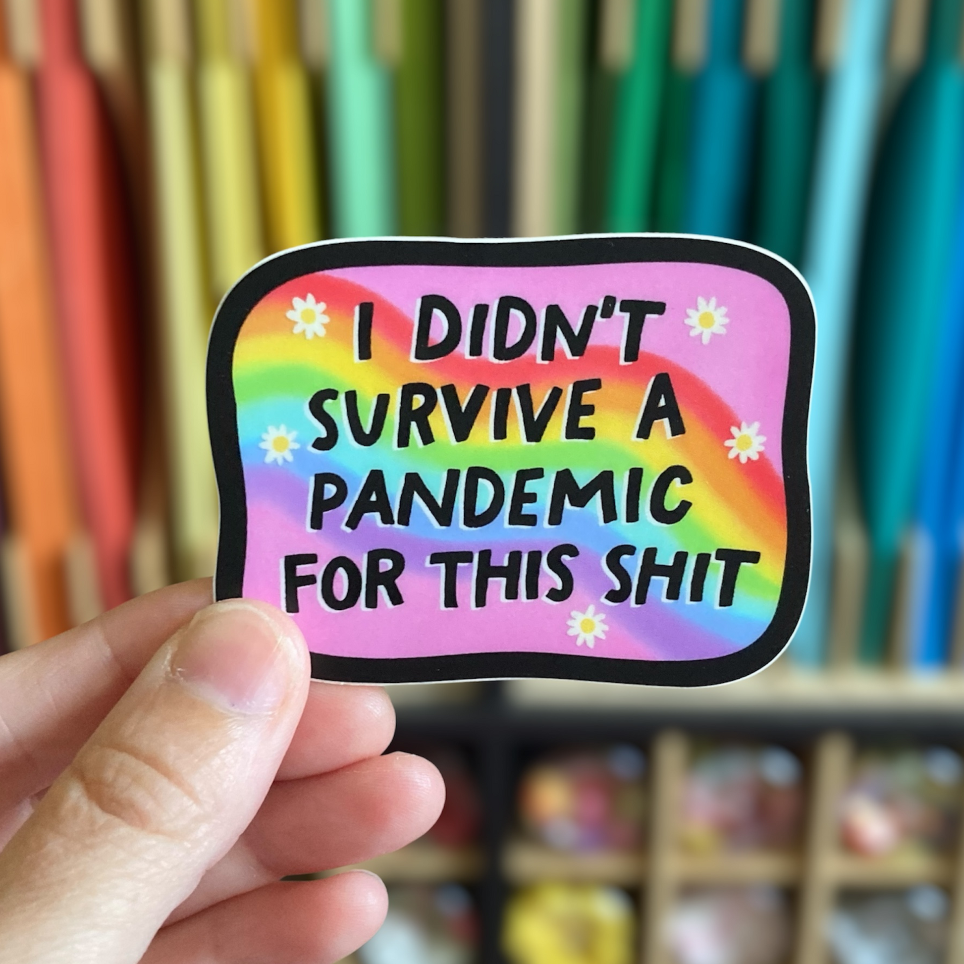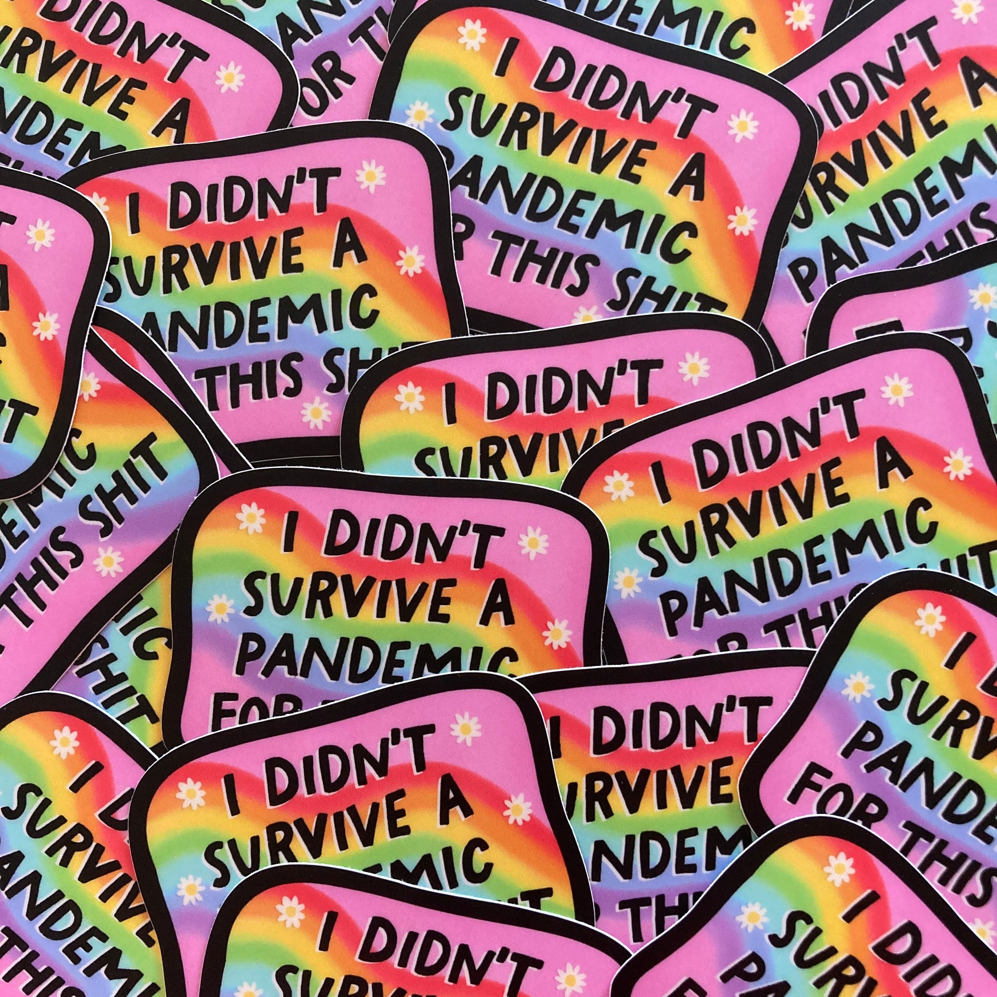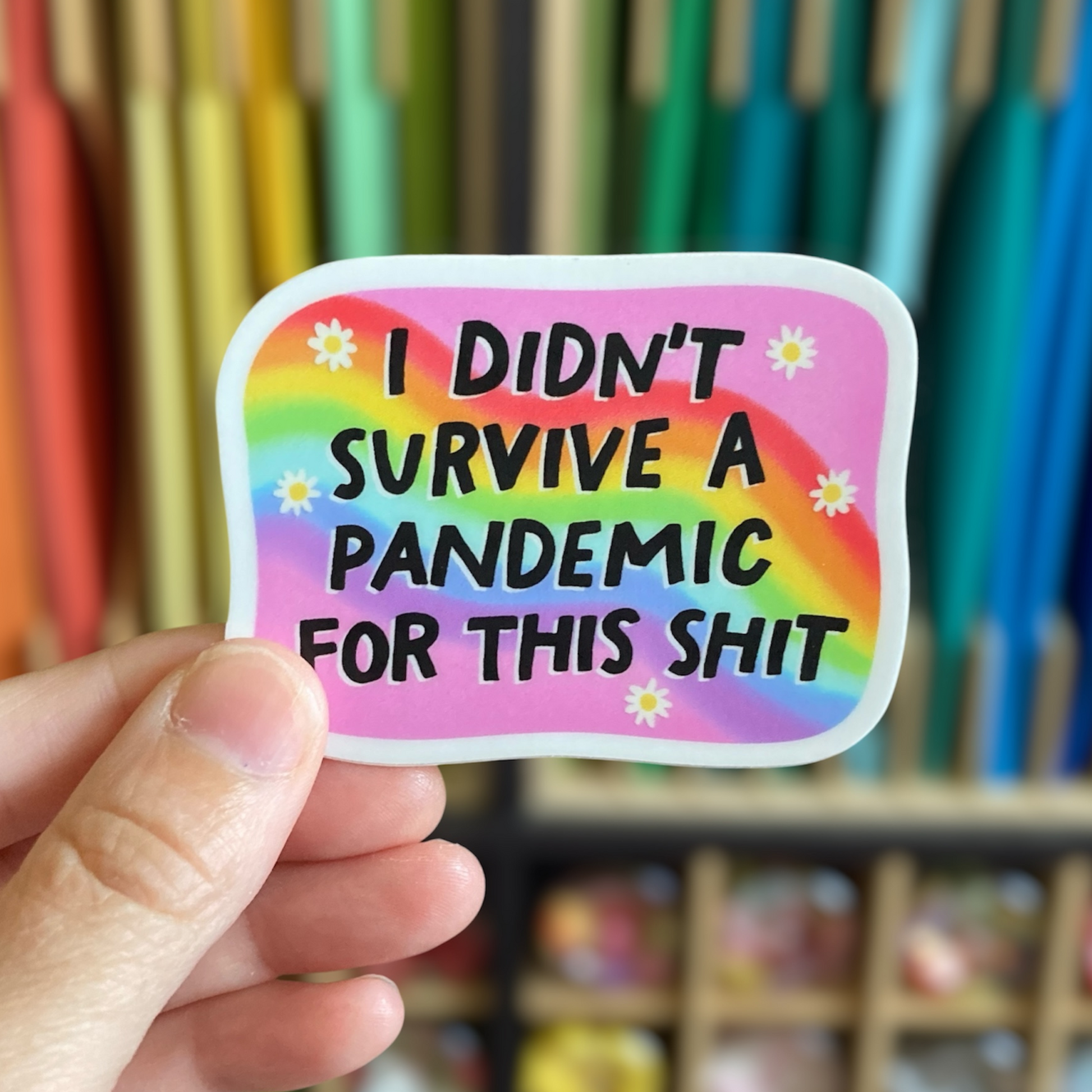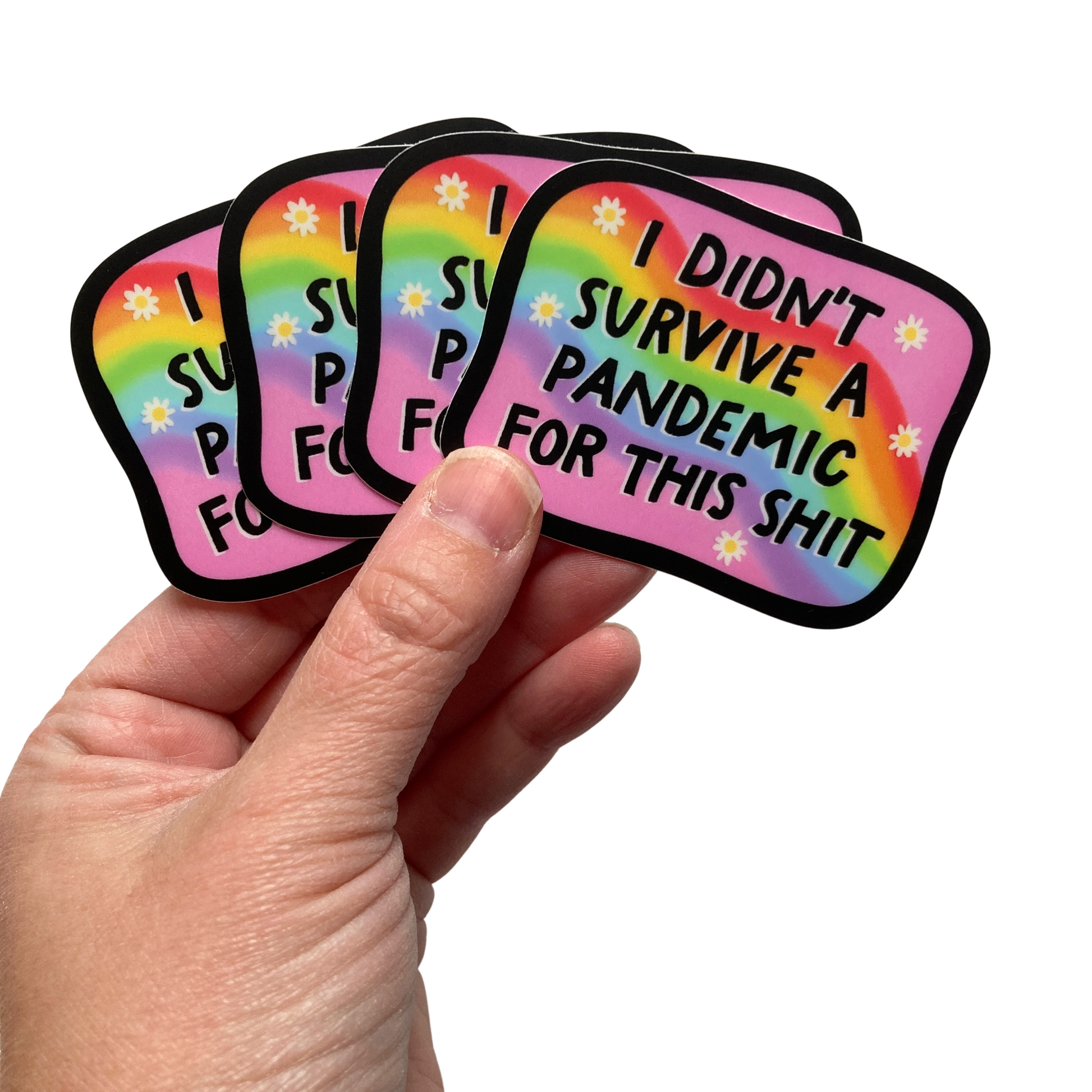 This listing is for one "I Didn't Survive A Pandemic For This Shit" sticker. It is the perfect addition to your water bottle, computer, notebook, or any surface your heart desires!