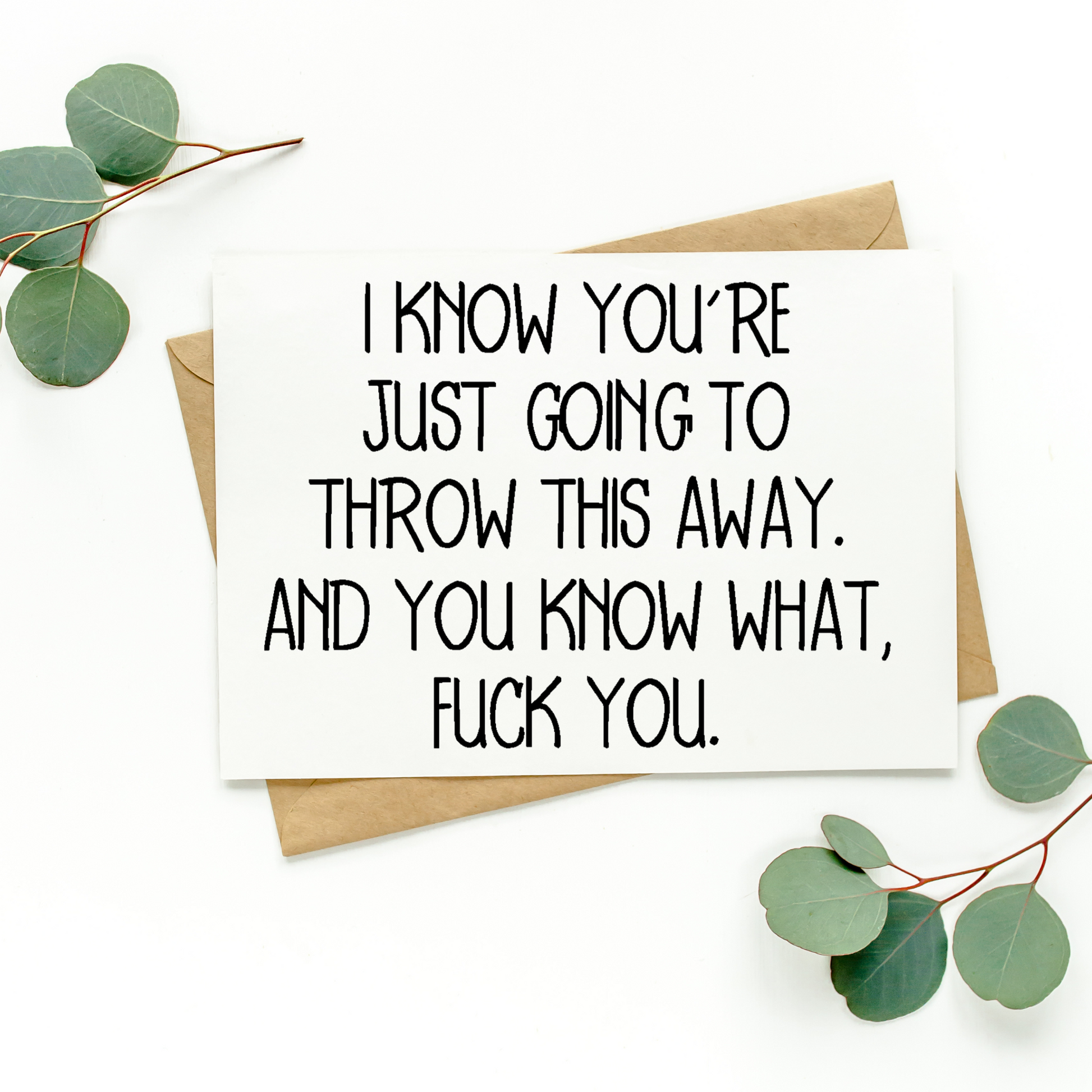 This listing is for one blank greeting card that says "I Know You're Just Going To Throw This Away. And You Know What, Fuck You." It takes a special person in your life to appreciate the snarky humor this card offers;)
