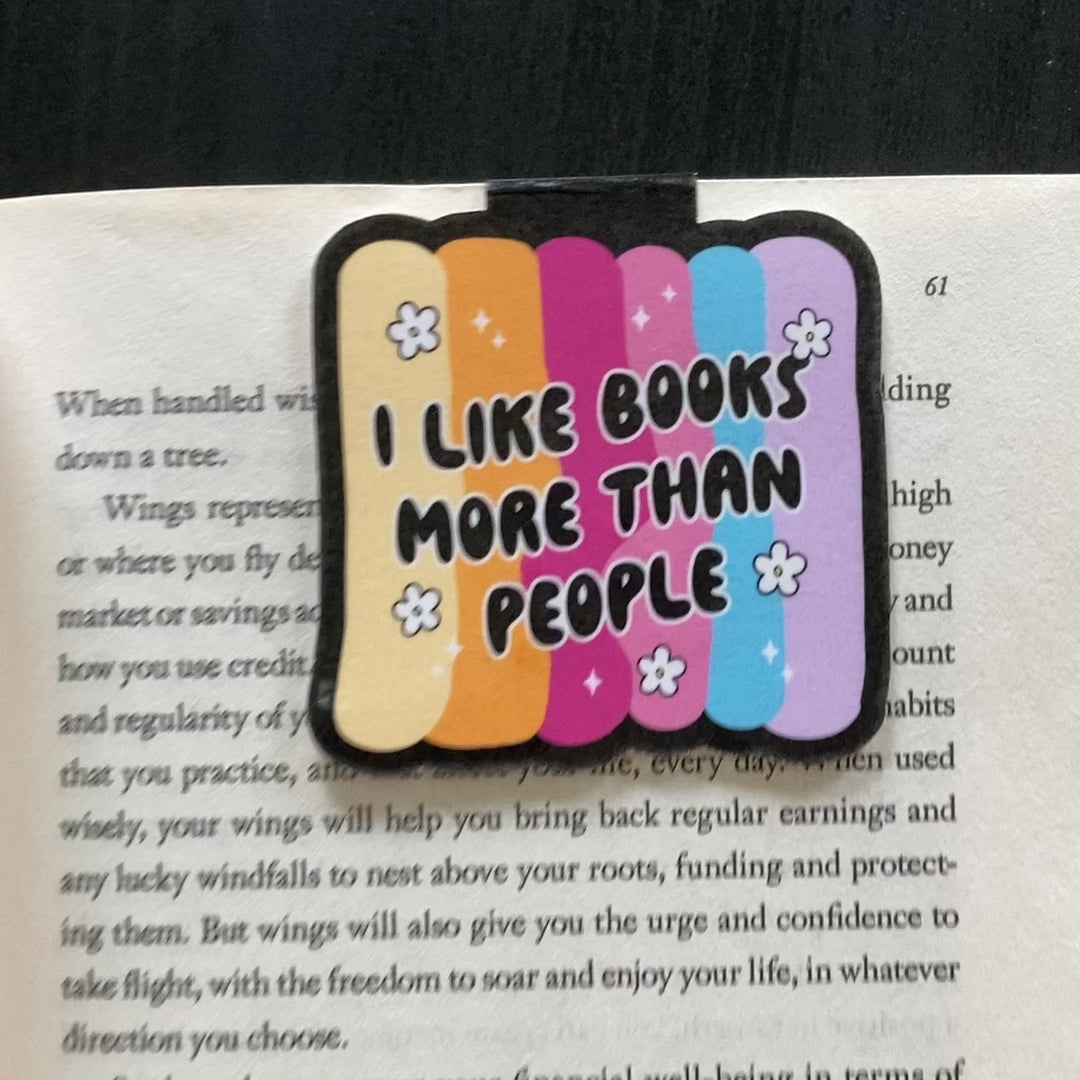 This listing is for one magnetic bookmark that says, "I Like Books More Than People." It's perfect for holding your place just about anywhere! Use it in your favorite book, planner, notebook, or wherever your heart desires!