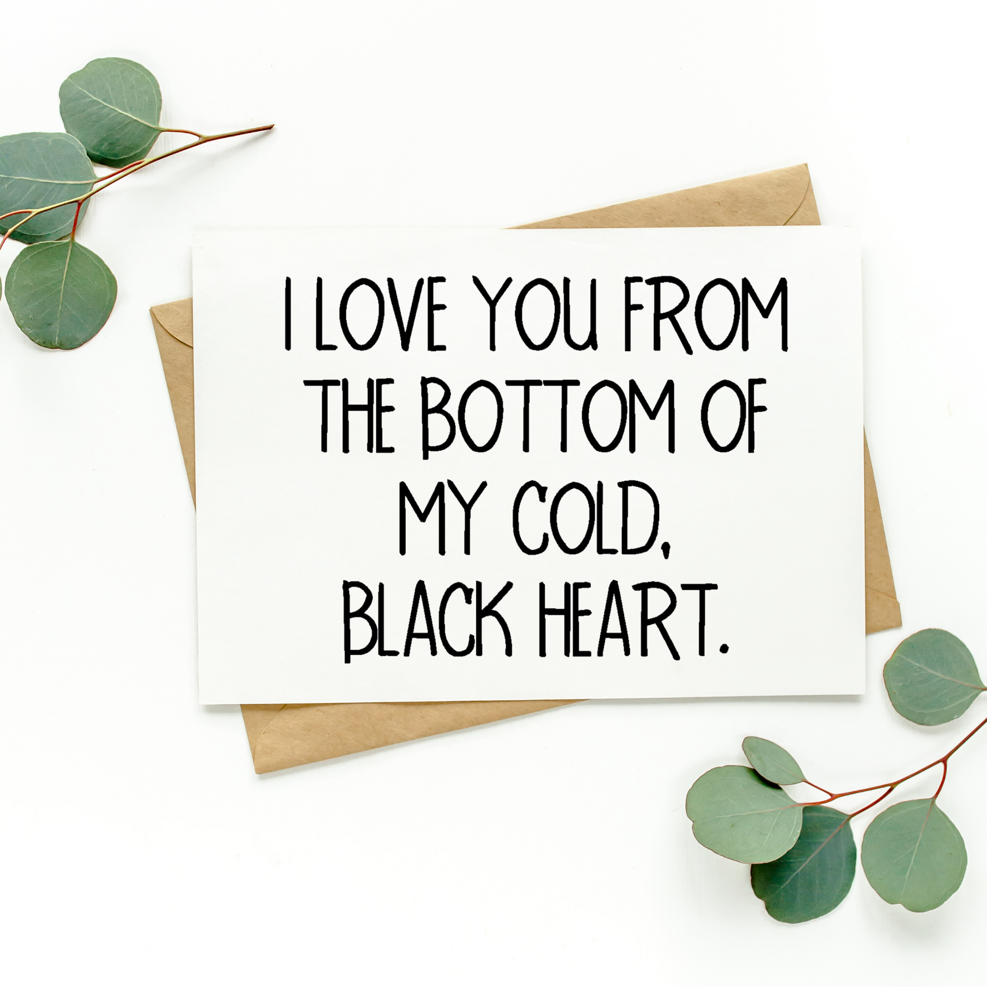 This listing is for one blank greeting card that says, "I Love You From The Bottom Of My Cold Black Heart." Nothing like getting straight to the point with this one;)