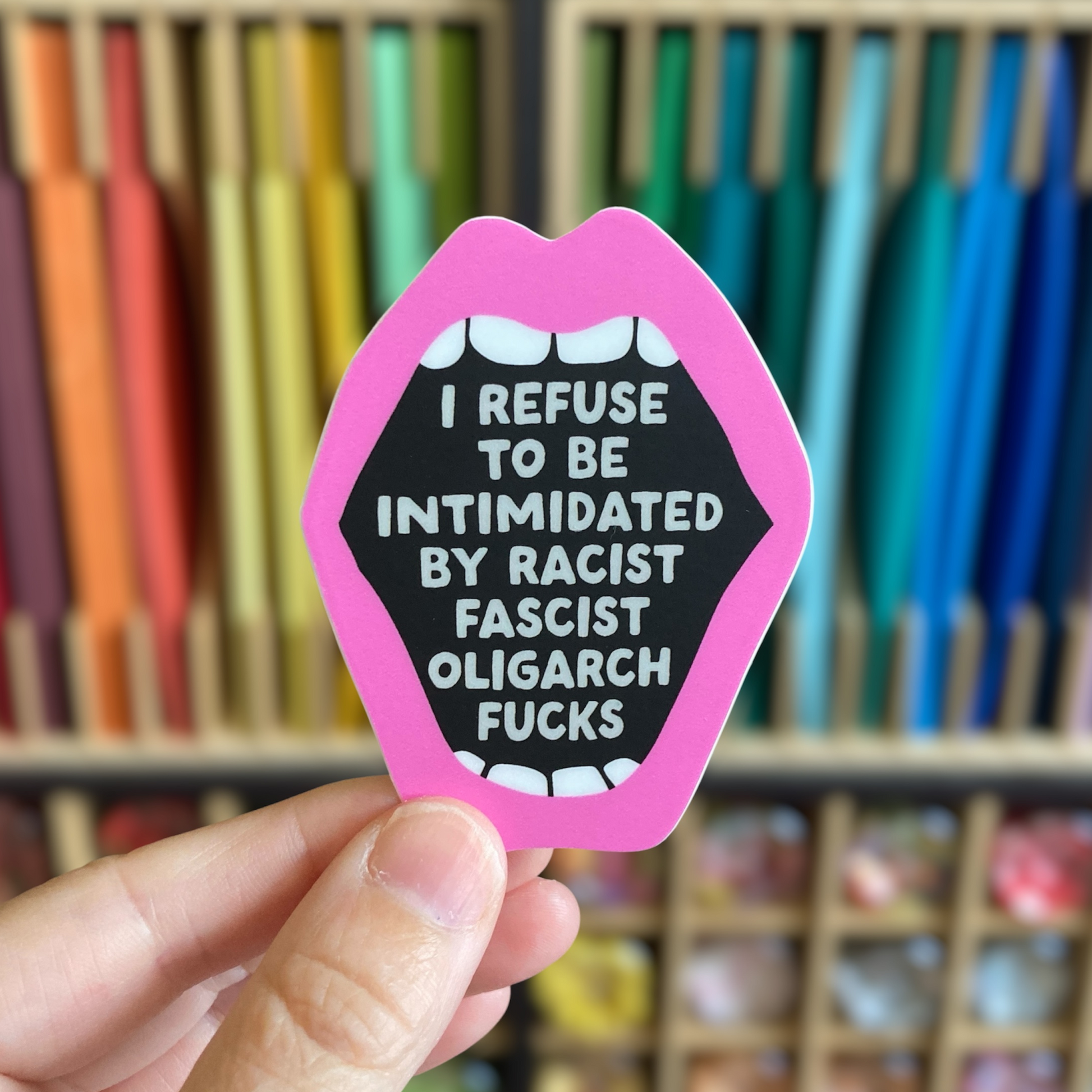 This listing is for one "I Refuse To Be Intimidated By Racist Fascist Oligarch Fucks" sticker. It is the perfect addition to your water bottle, computer, notebook, or any surface your heart desires!