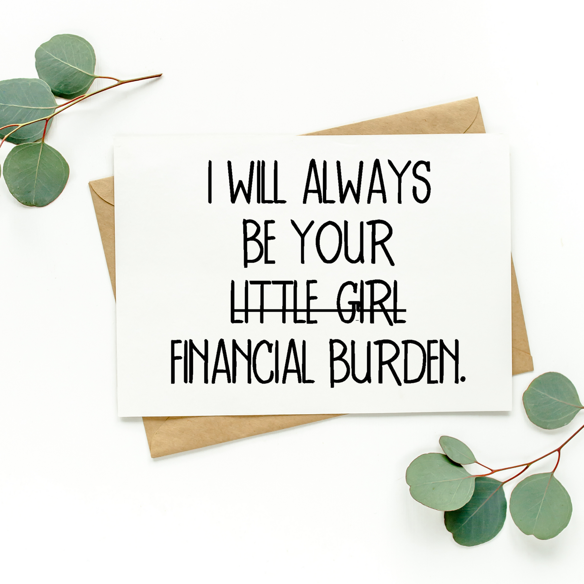 This listing is for one blank greeting card that says "I Will Always Be Your [Little Girl] Financial Burden." It's a hilarious card to show your parents how much you appreciate them!