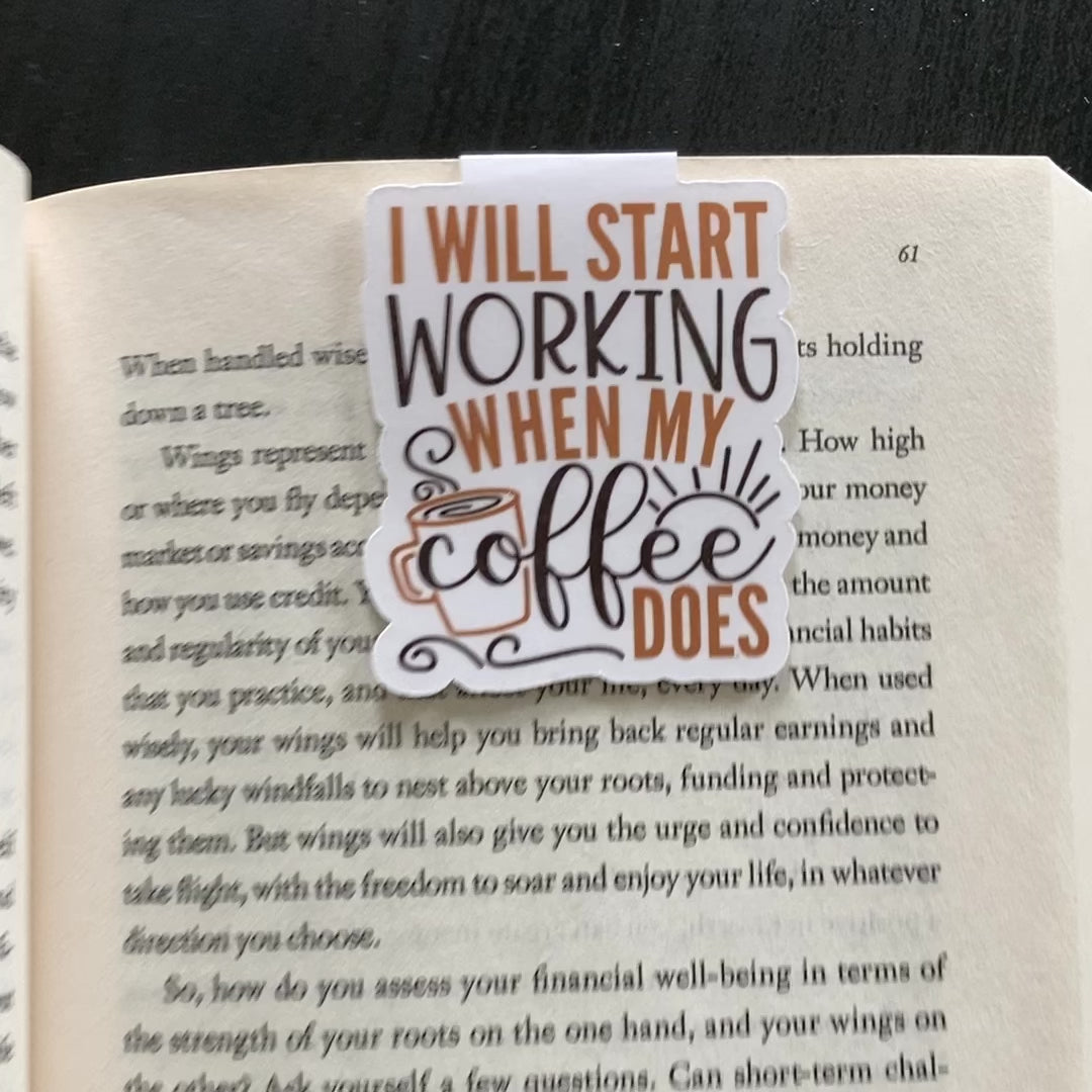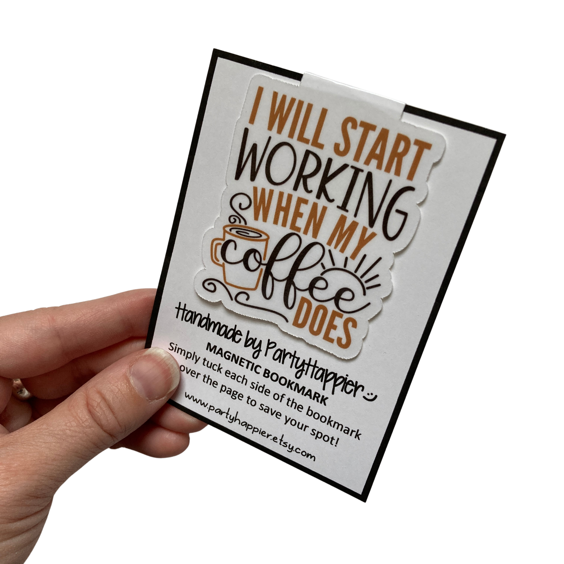 This listing is for one magnetic bookmark that says "I Will Start Working When My Coffee Does." It's perfect for holding your place just about anywhere! Use it in your favorite book, planner, notebook, or wherever your heart desires!