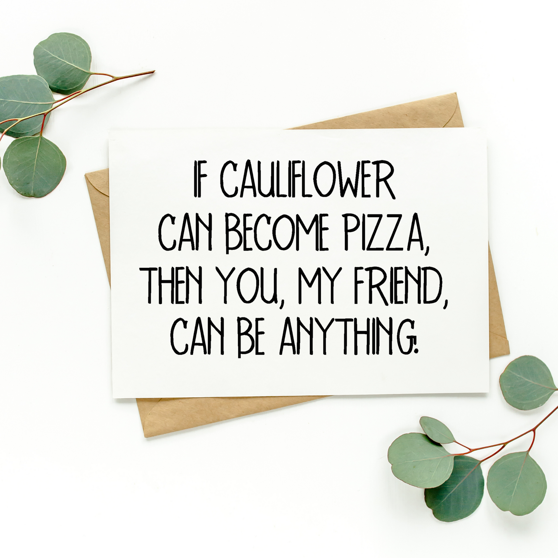 This listing is for one blank greeting card that says, "If Cauliflower Can Become Pizza, Then You, My Friend, Can Be Anything." Something tells us your friends will get a total kick out of this card!