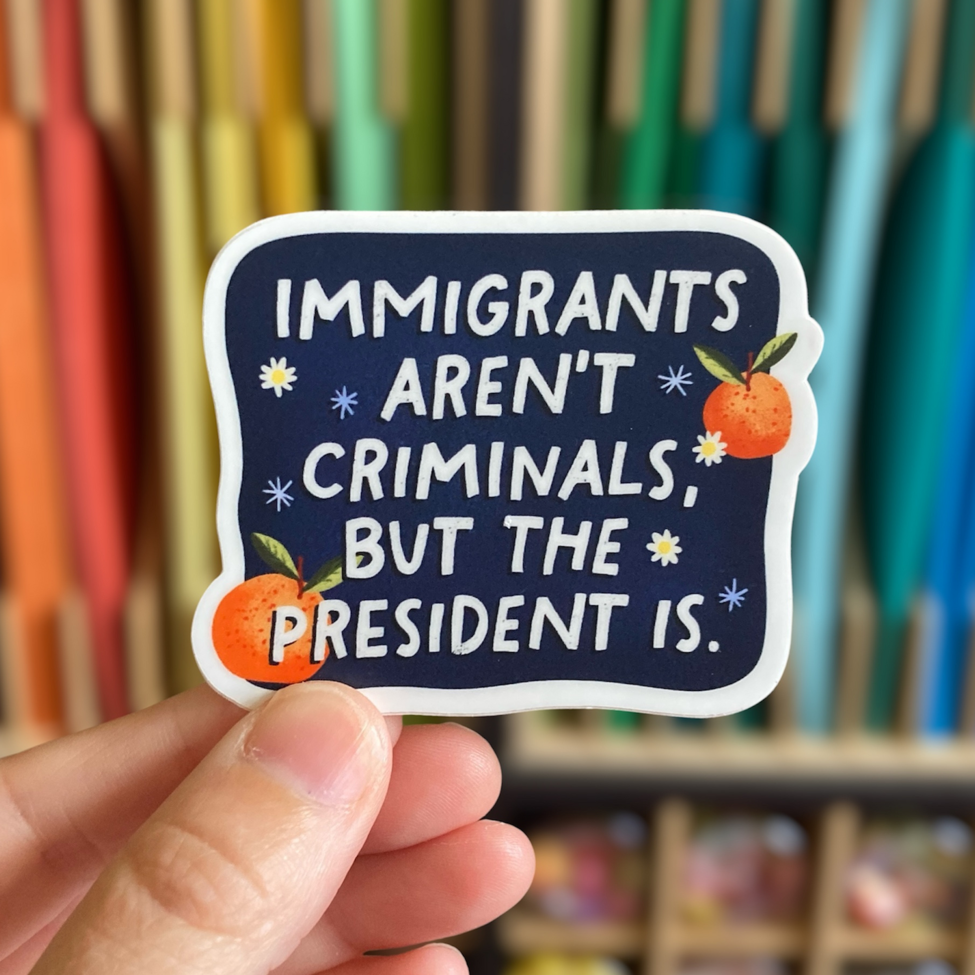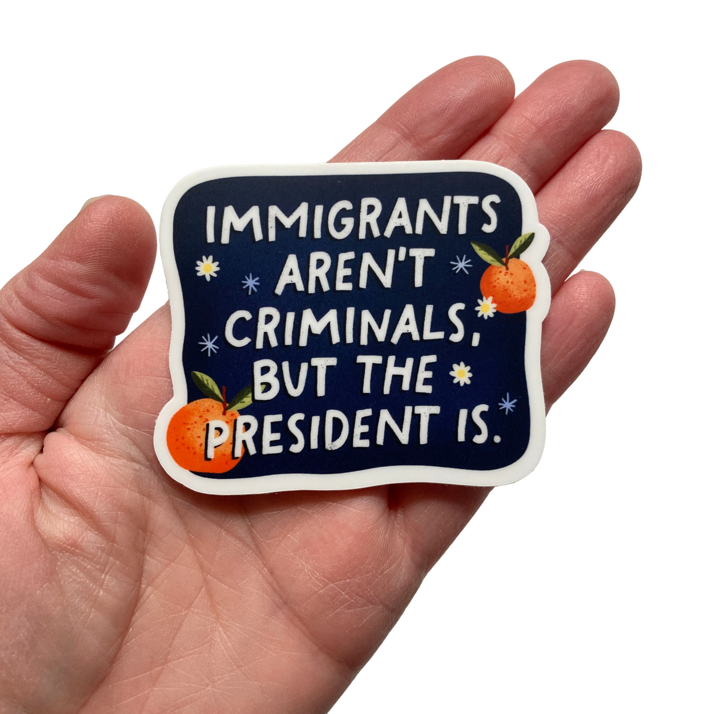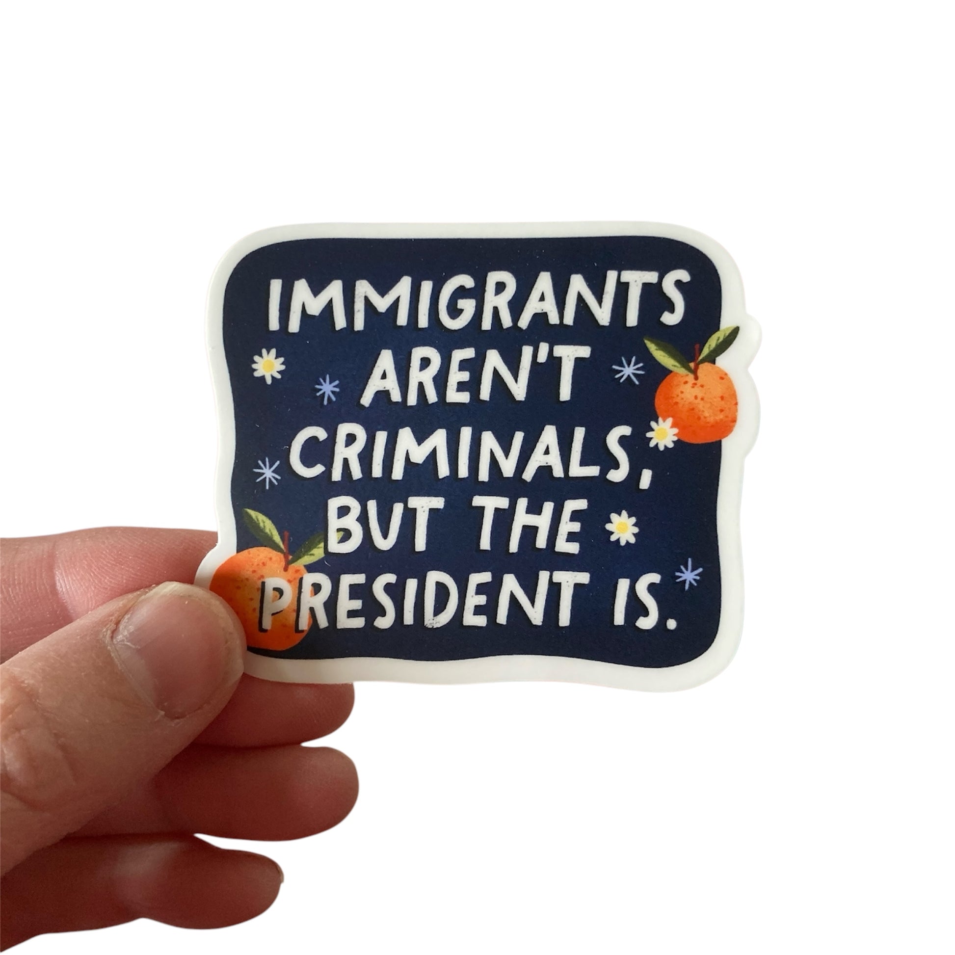 This listing is for one "Immigrants Aren't Criminals But The President Is" sticker. It is the perfect addition to your water bottle, computer, notebook, or any surface your heart desires!