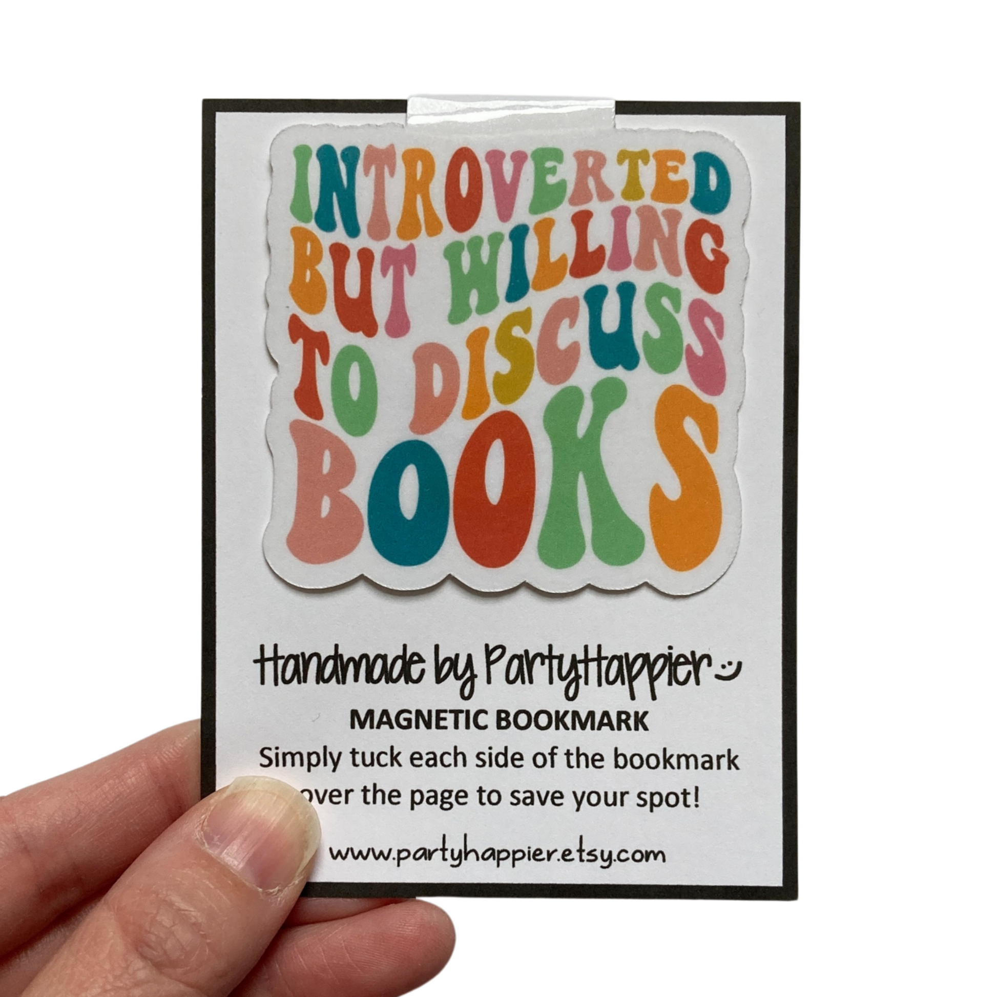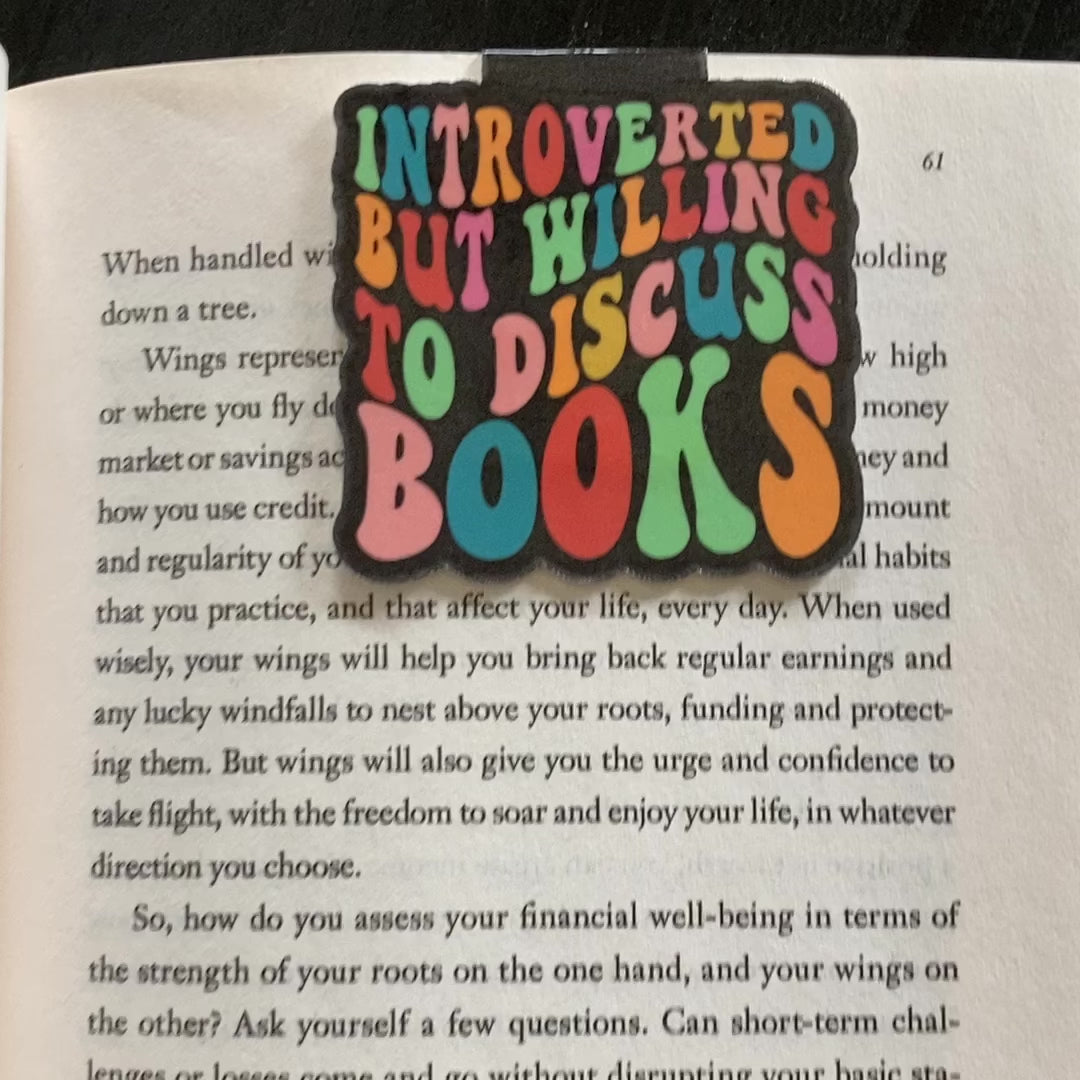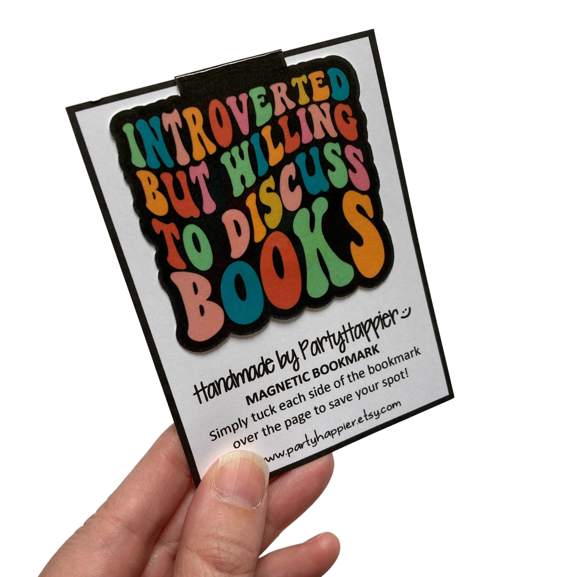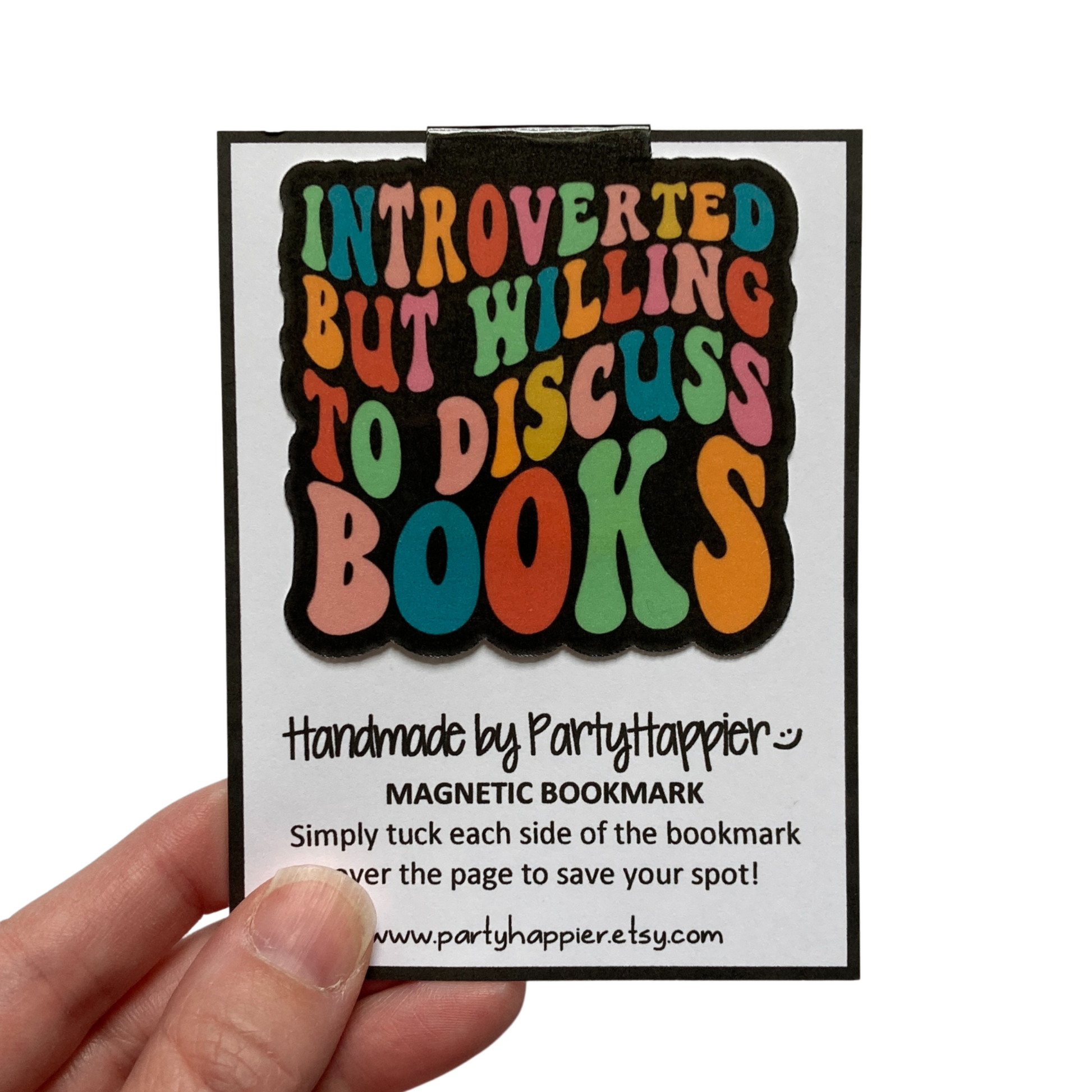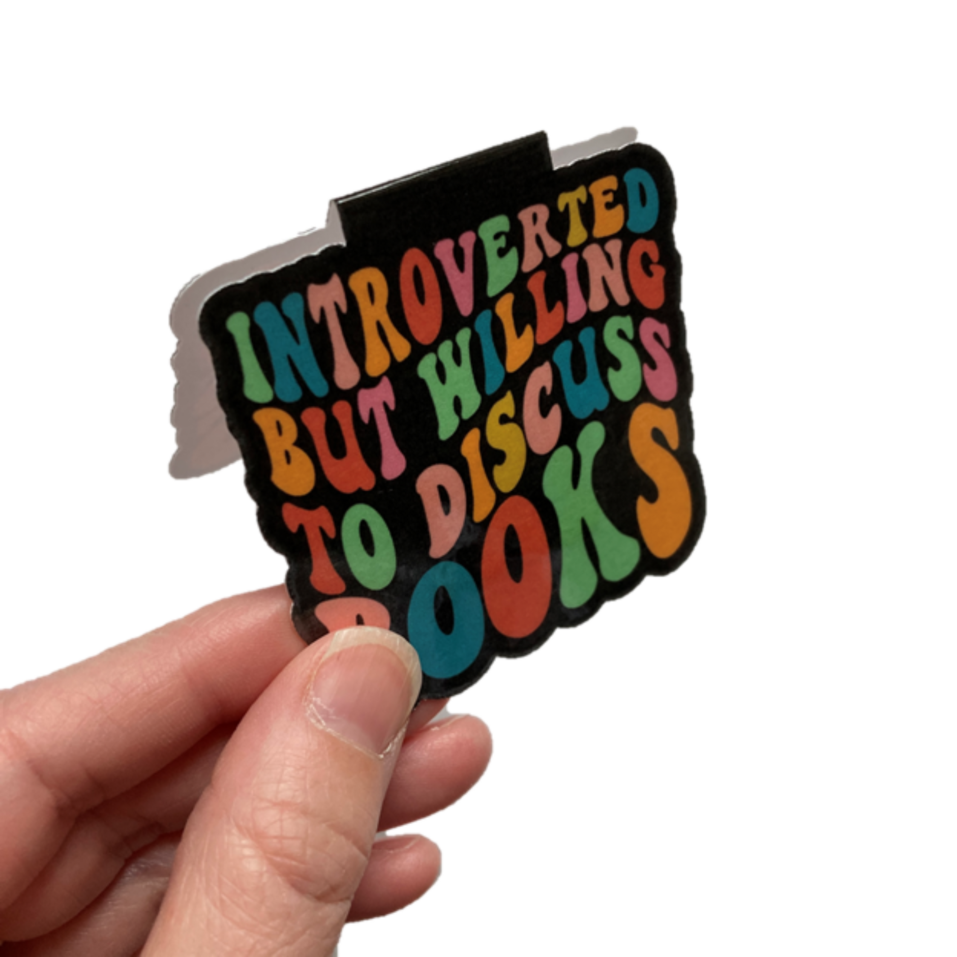 This listing is for one magnetic bookmark that says, "Introverted But Willing To Discuss Books." It's perfect for holding your place just about anywhere! Use it in your favorite book, planner, notebook, or wherever your heart desires!