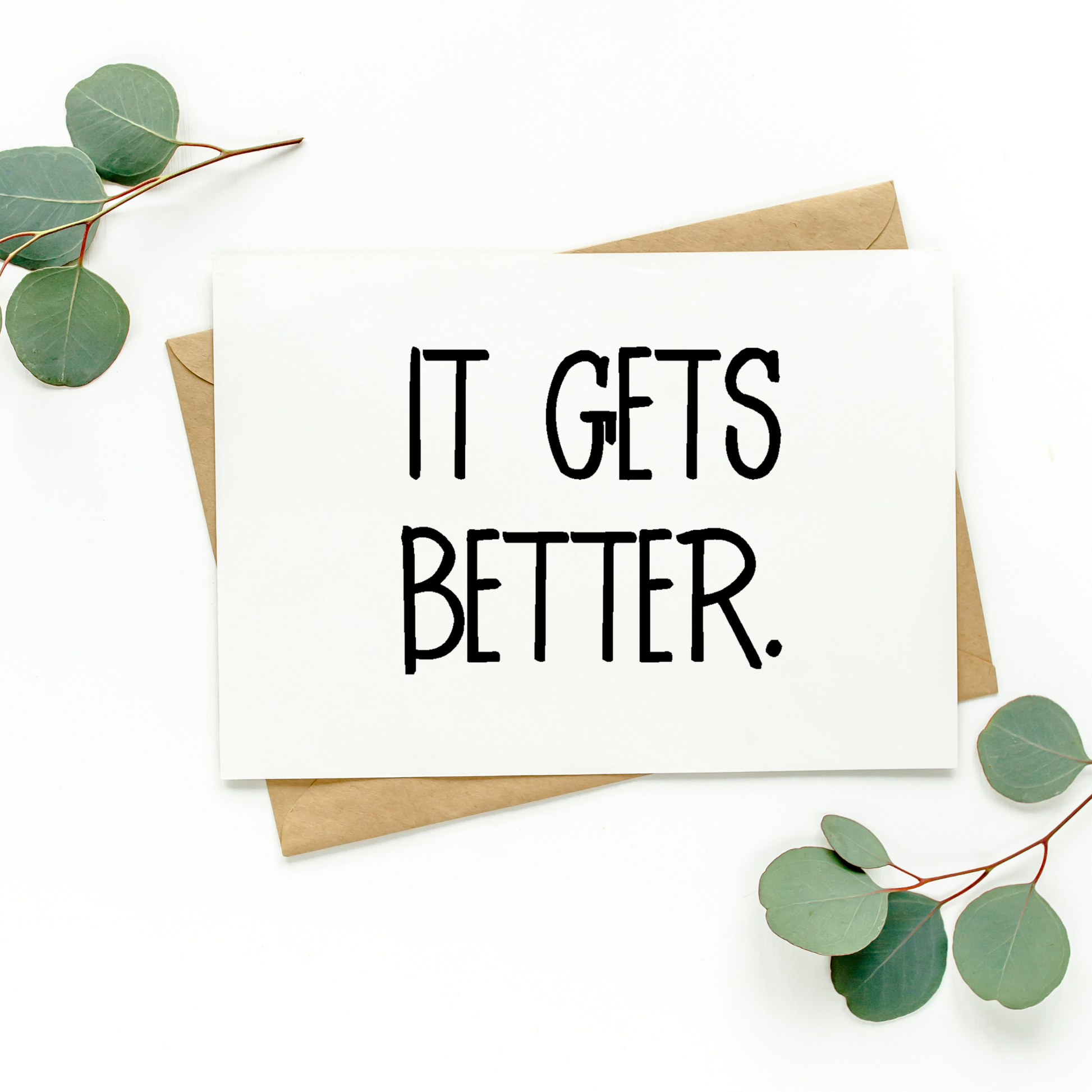 This listing is for one blank greeting card that says, "It Gets Better." Sometimes there are just no other words to say.