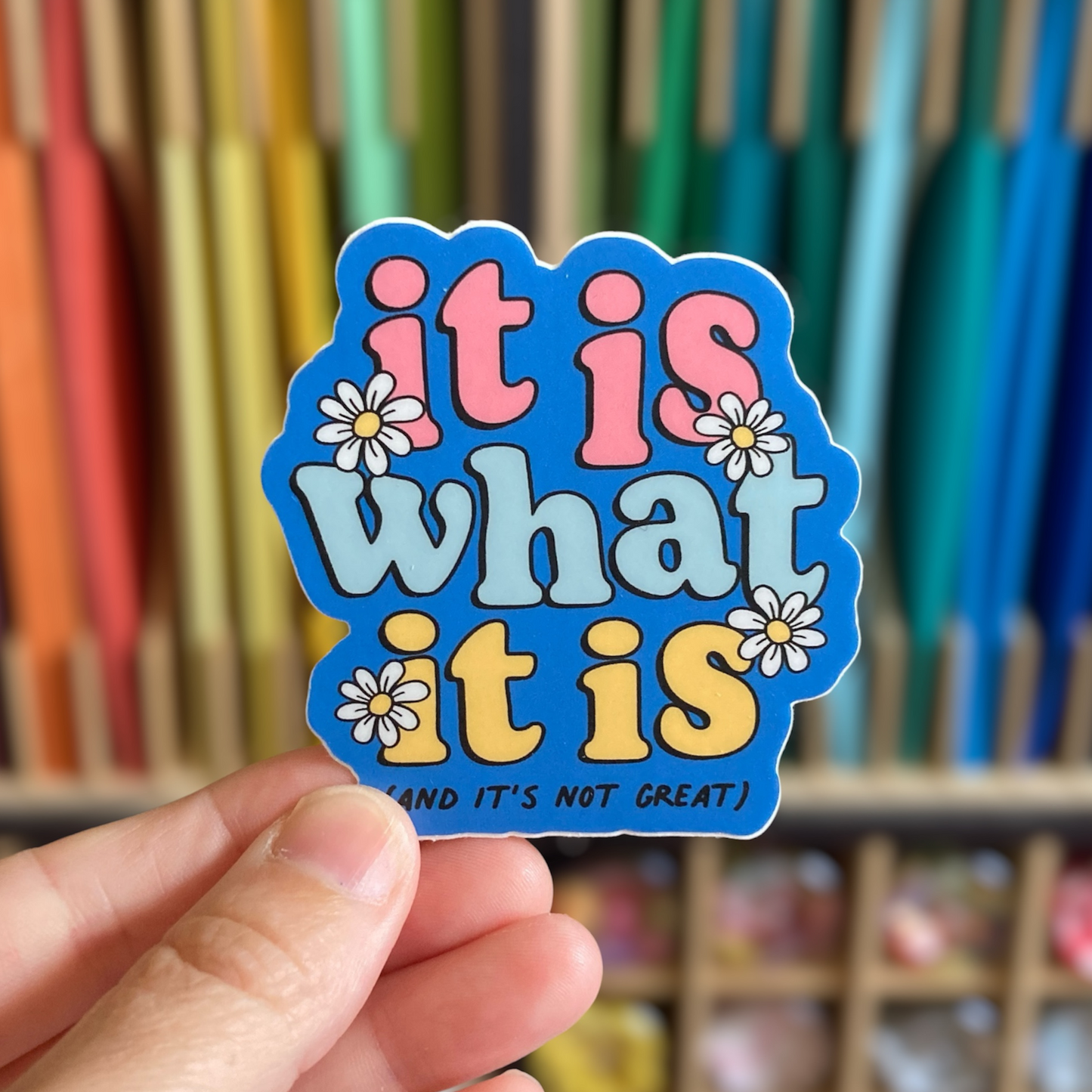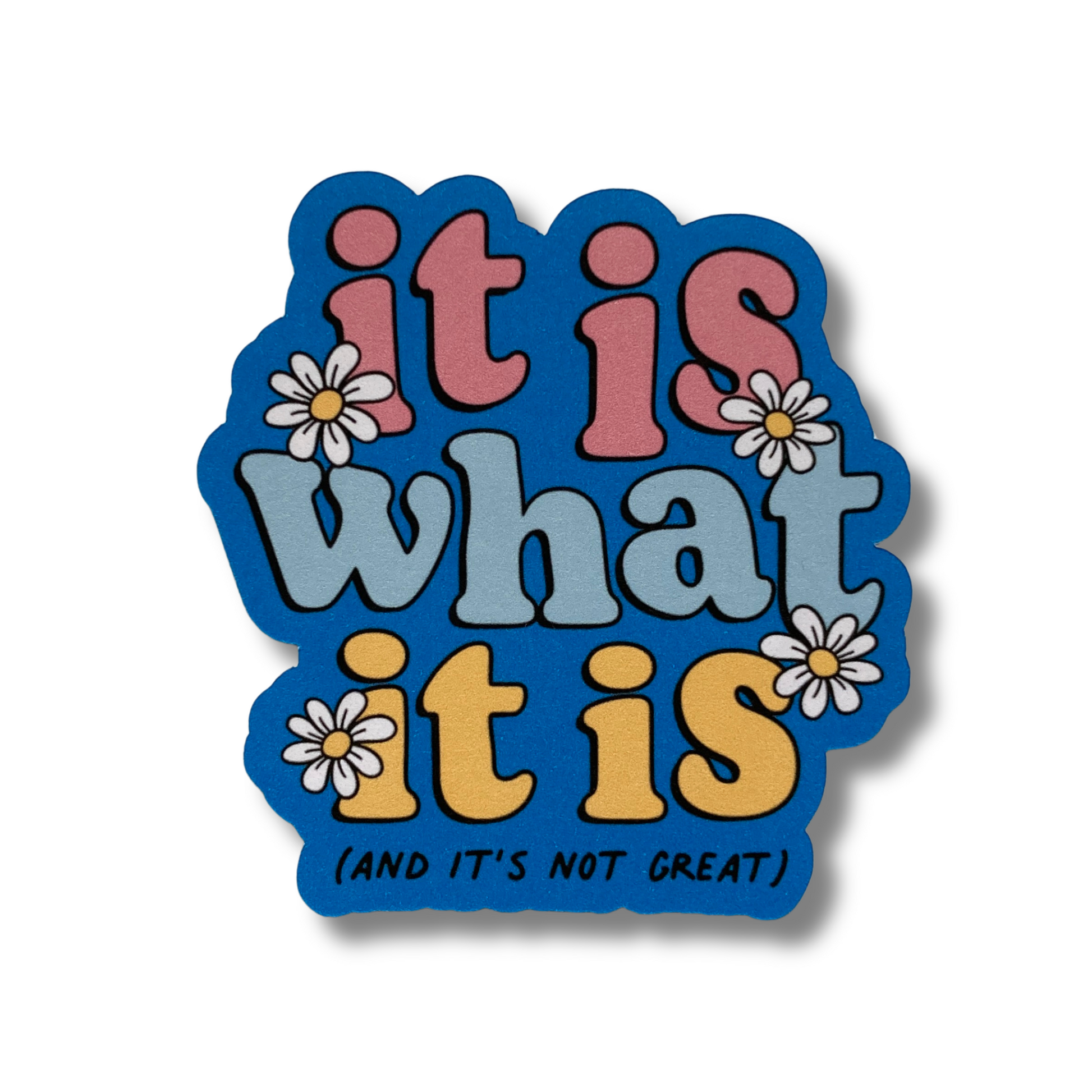This listing is for one "It Is What It Is (And It's Not Great)" sticker. It is the perfect addition to your water bottle, computer, notebook, or any surface you desire!