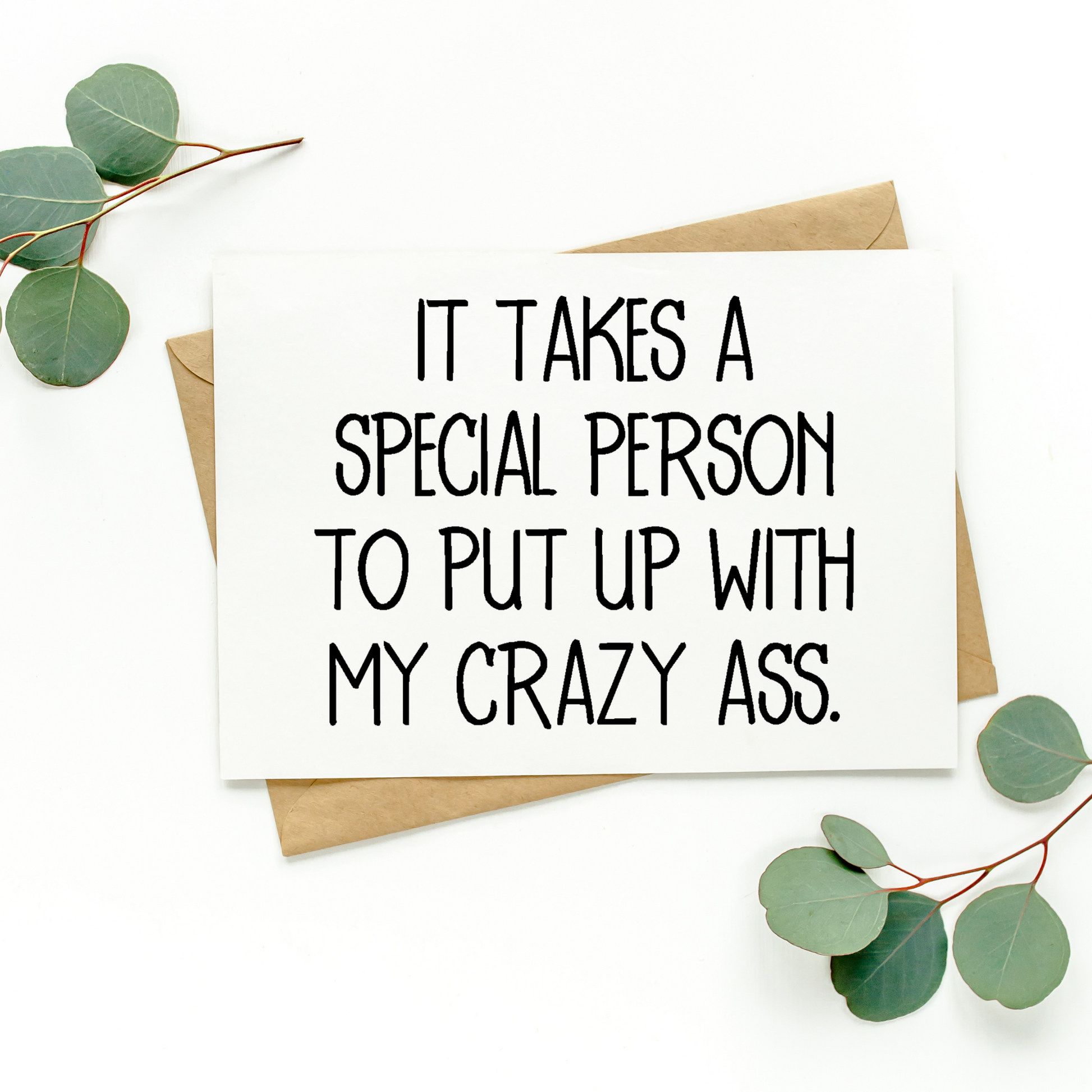 This listing is for one blank greeting card that says, "It Takes A Special Person To Put Up With My Crazy Ass." It's a perfectly funny card for your partner or best friend!