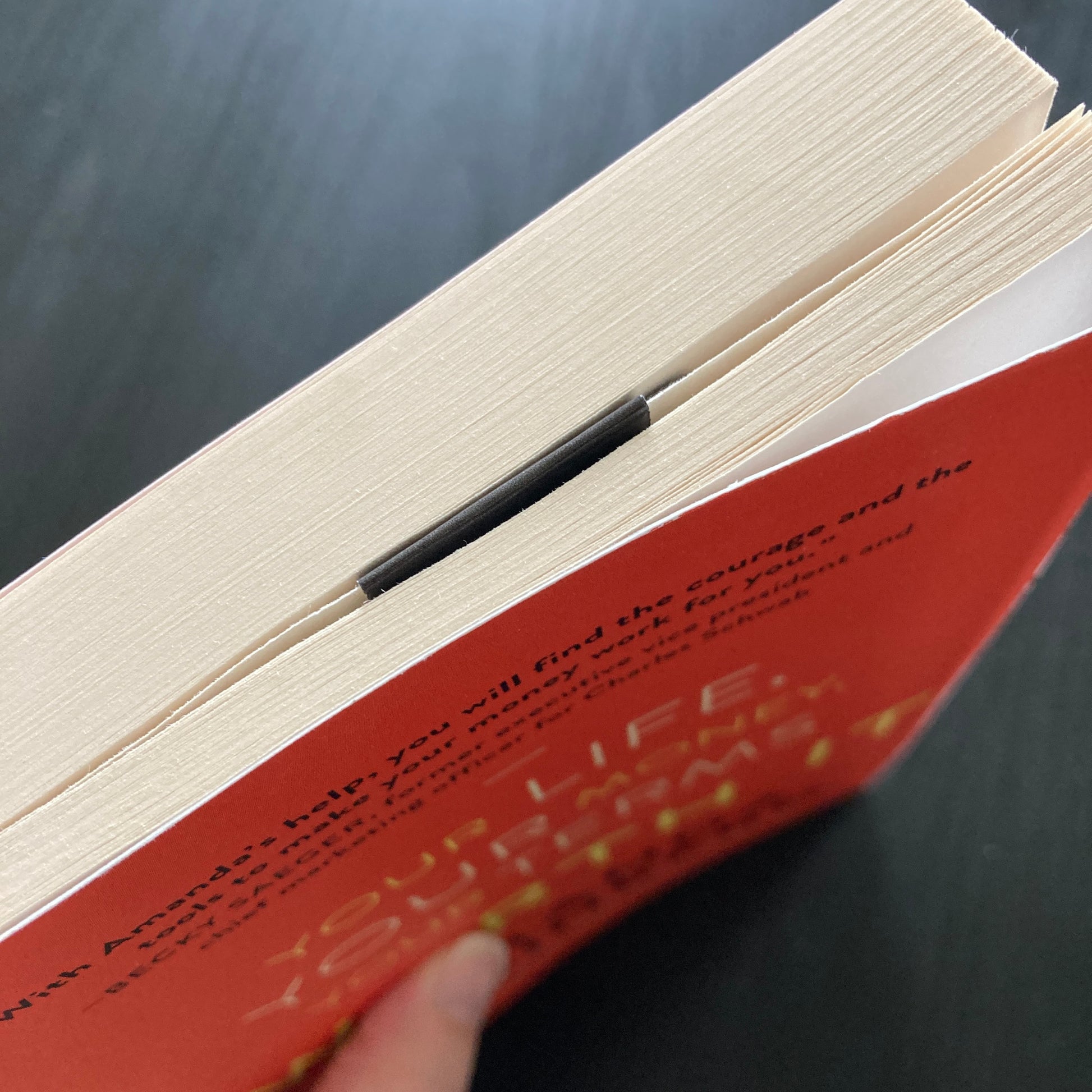 This bookmark is intended to fit securely around the desired page you want to save. Simply put one side on the front of the page and one side on the back, and the magnets should "click" together to save your spot.