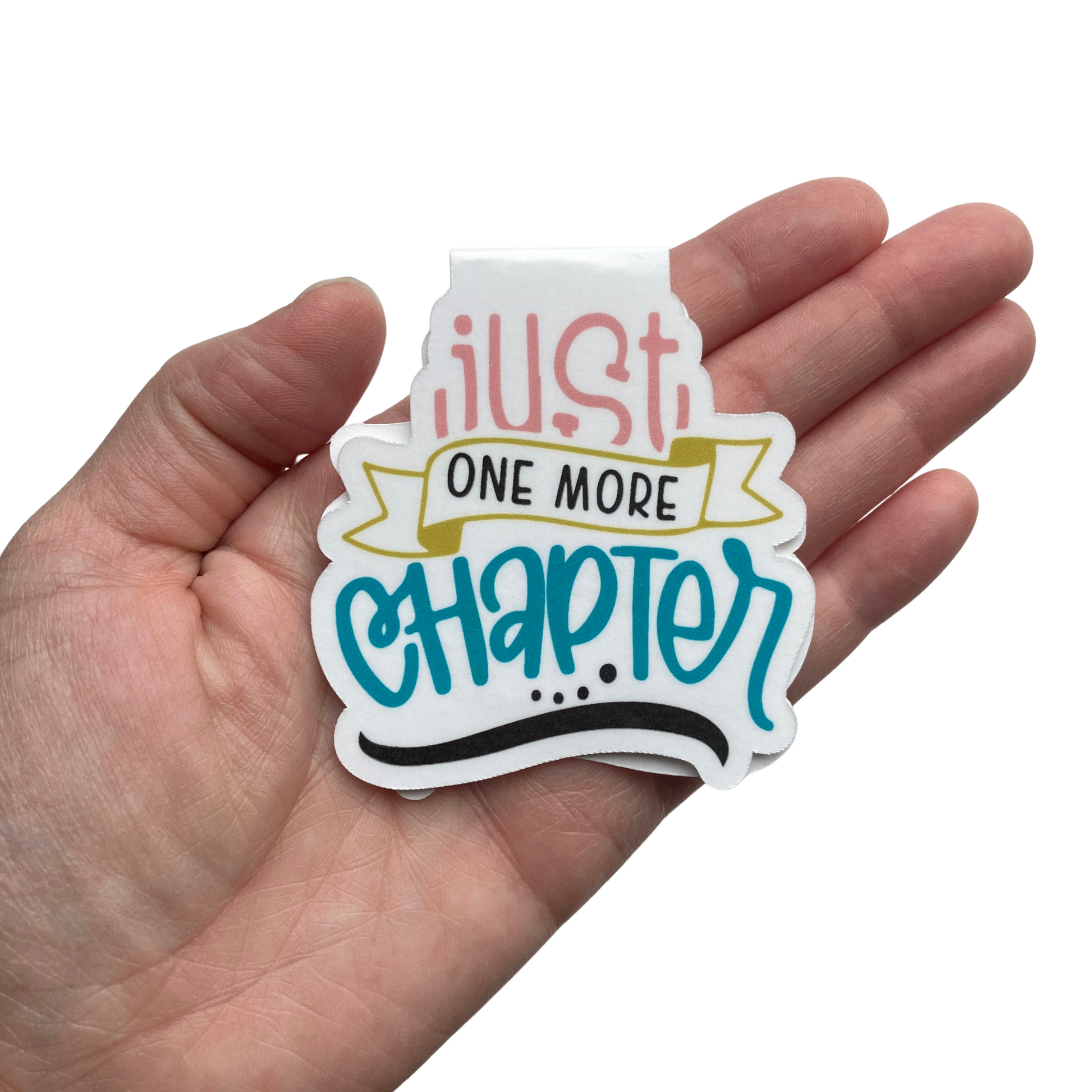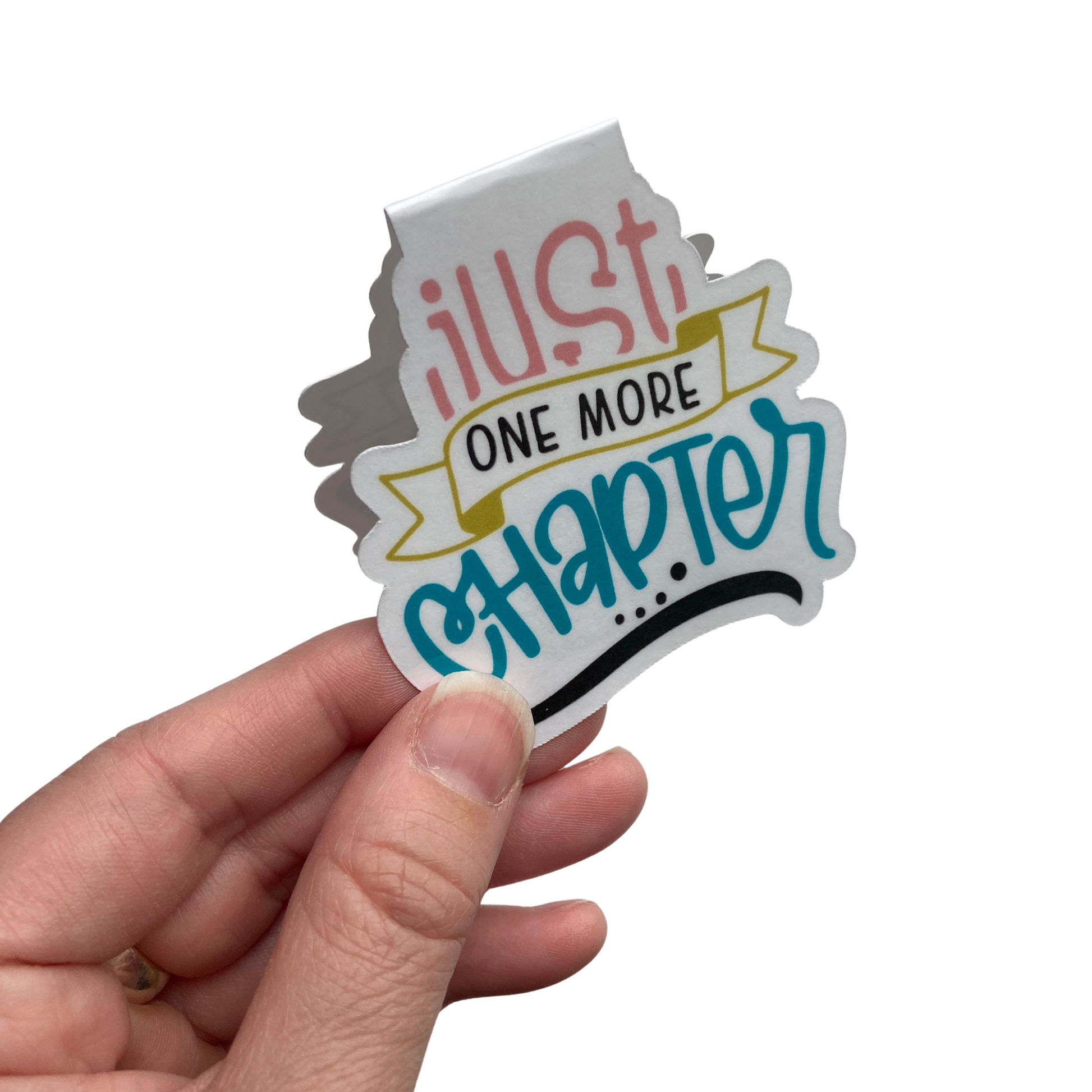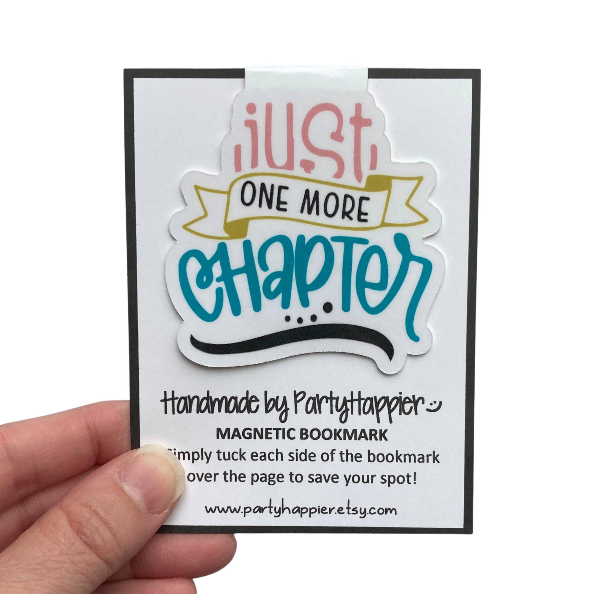 This listing is for one magnetic bookmark that says, "Just One More Chapter." It's perfect for holding your place just about anywhere! Use it in your favorite book, planner, notebook, or wherever your heart desires!