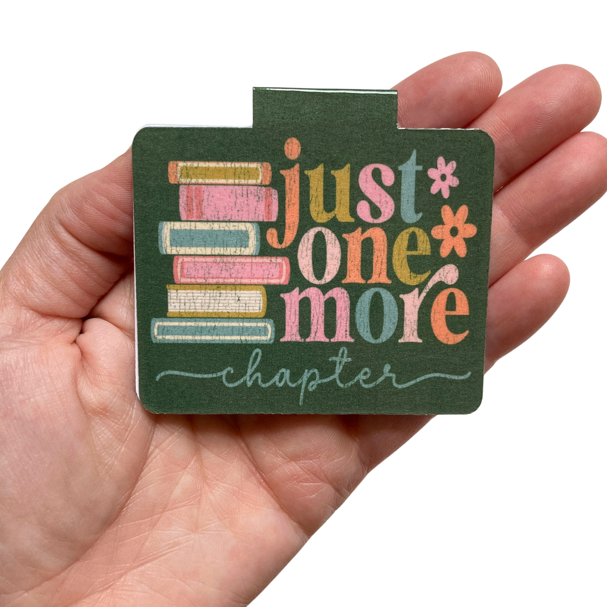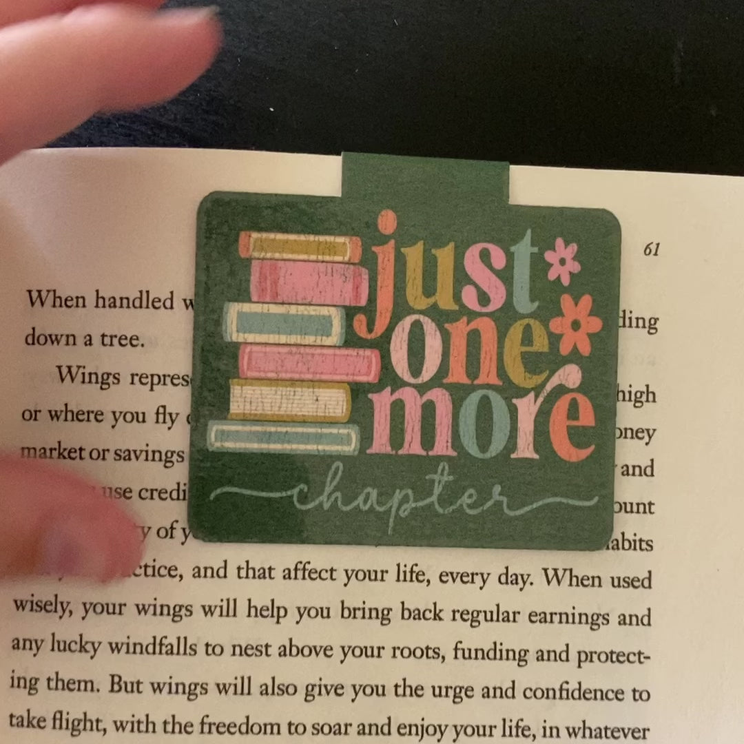 This listing is for one magnetic bookmark that says, "Just One More Chapter." It's perfect for holding your place just about anywhere! Use it in your favorite book, planner, notebook, or wherever your heart desires!