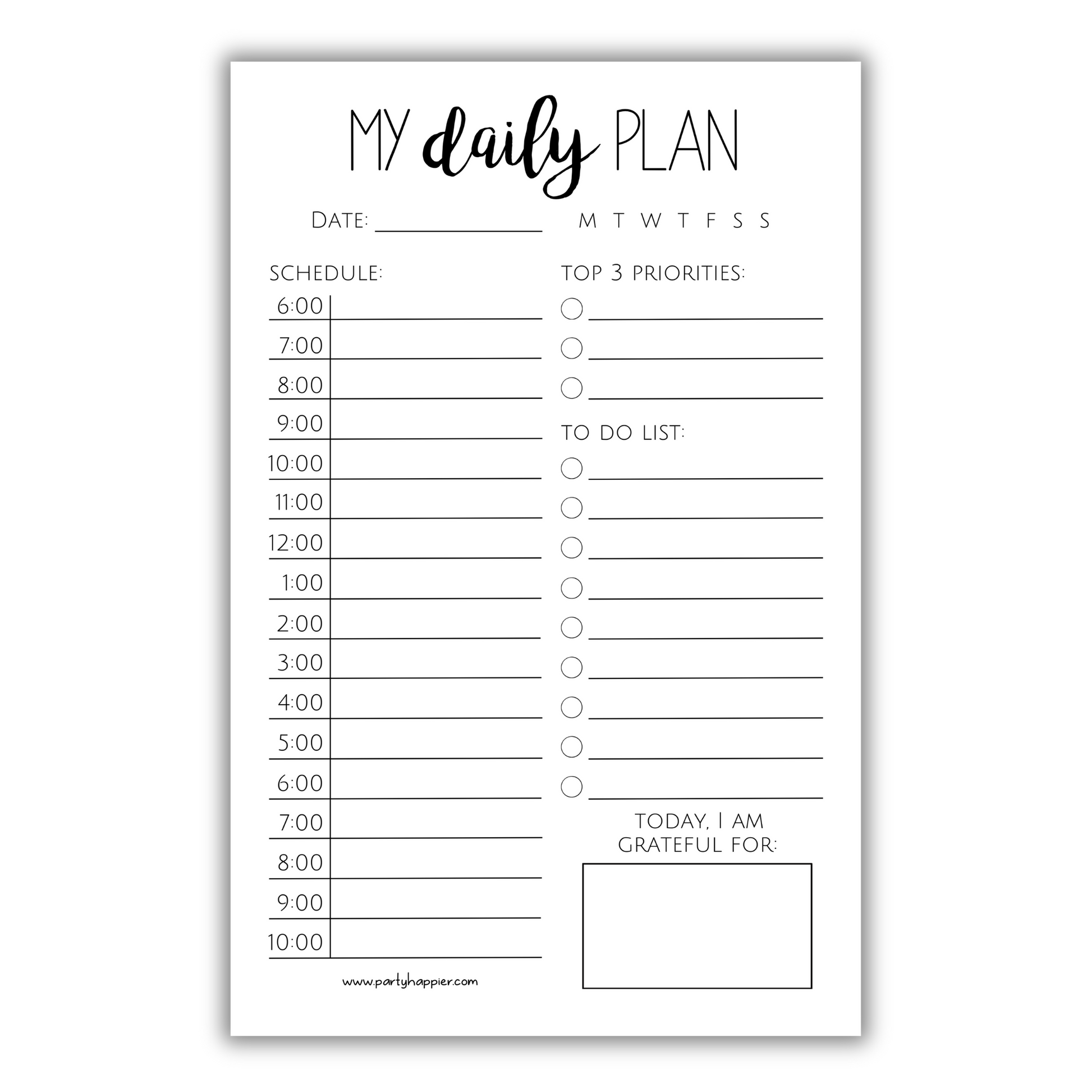 This listing is for one "My Daily Plan" notepad that features an hourly schedule, a priorities list, a to-do list, and space for writing what you're grateful for each day!