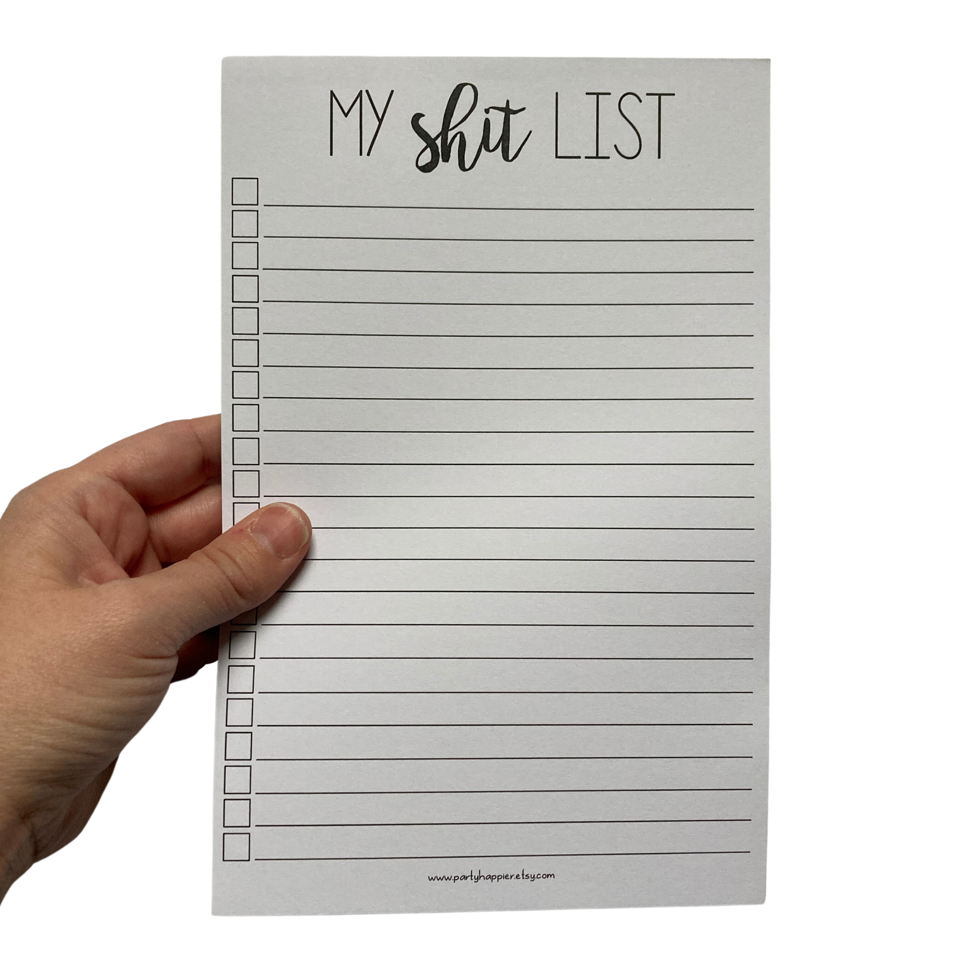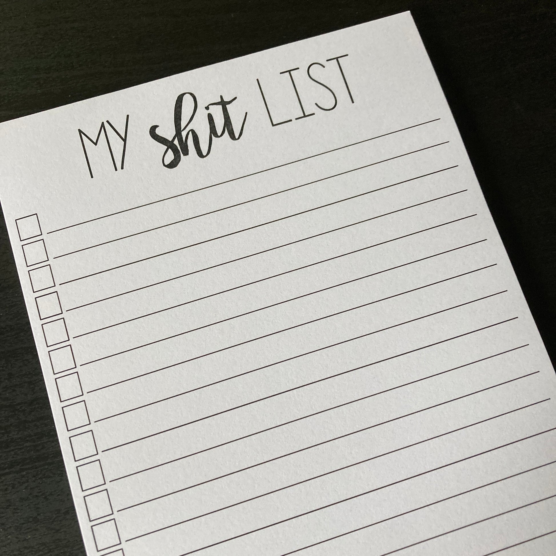 This listing is for one "My Shit List" notepad. It features space to write your to-do's for today, tomorrow, or anytime. A perfect way to keep track of pressing and future tasks, or to write down all the names of those who've crossed you;).