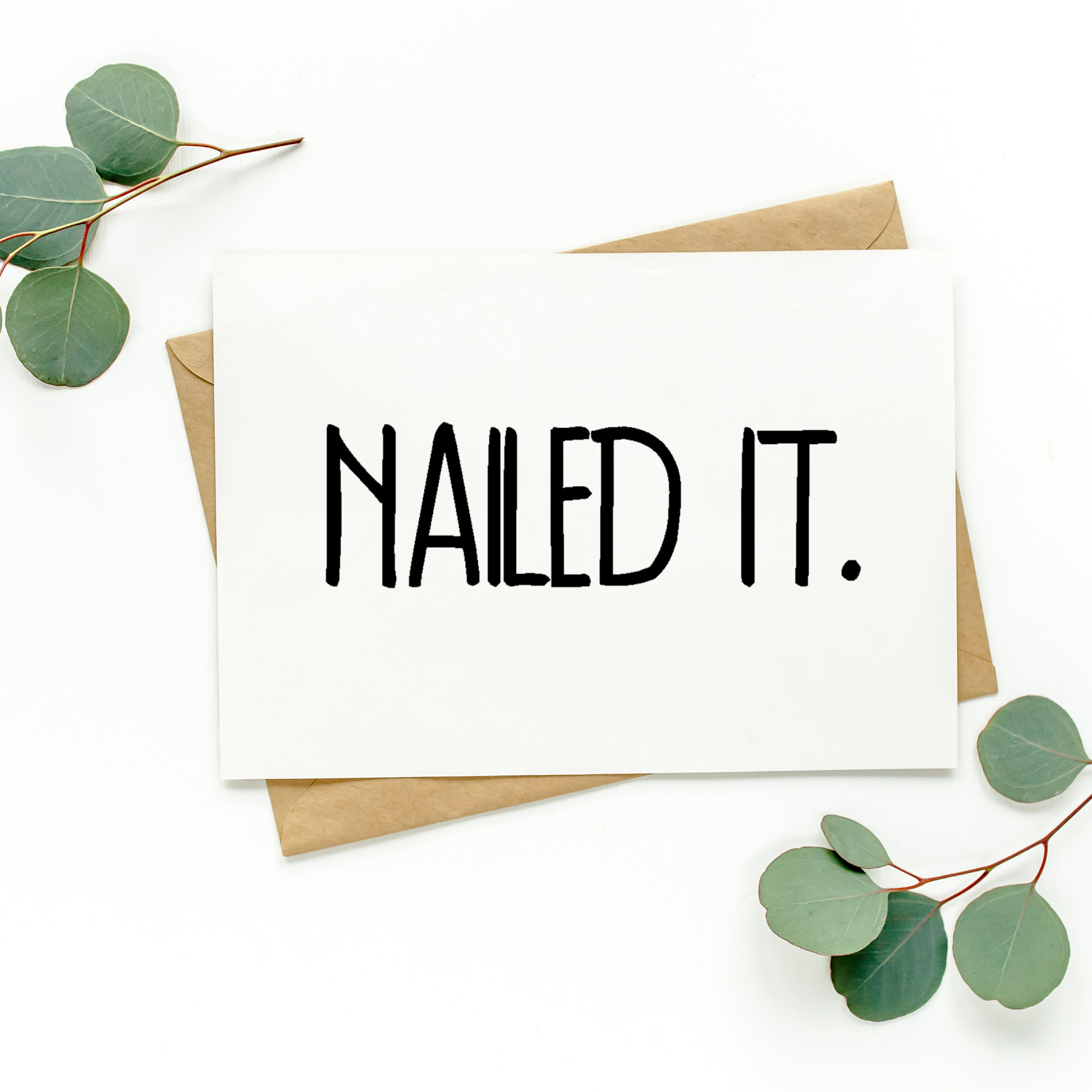 This listing is for one blank greeting card that says, "Nailed It." The card is a simple way to show your excitement for whatever the recipient is celebrating!
