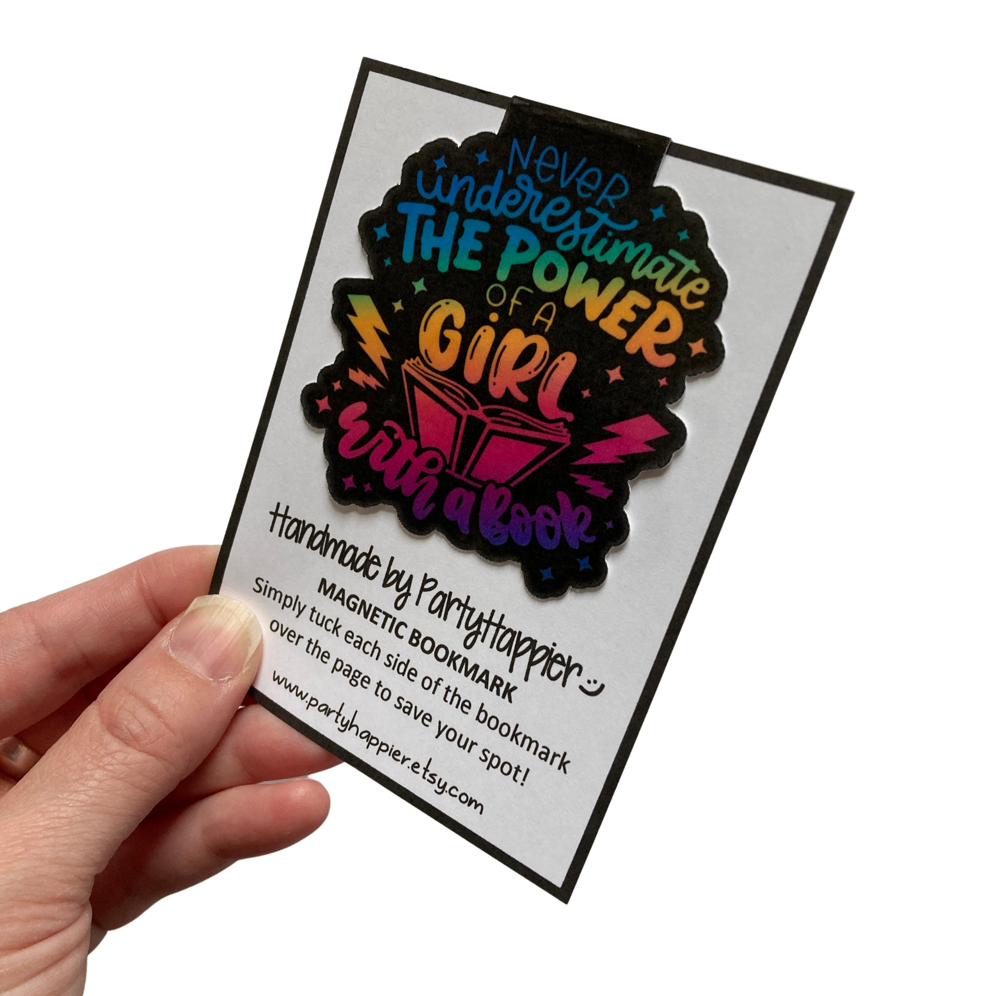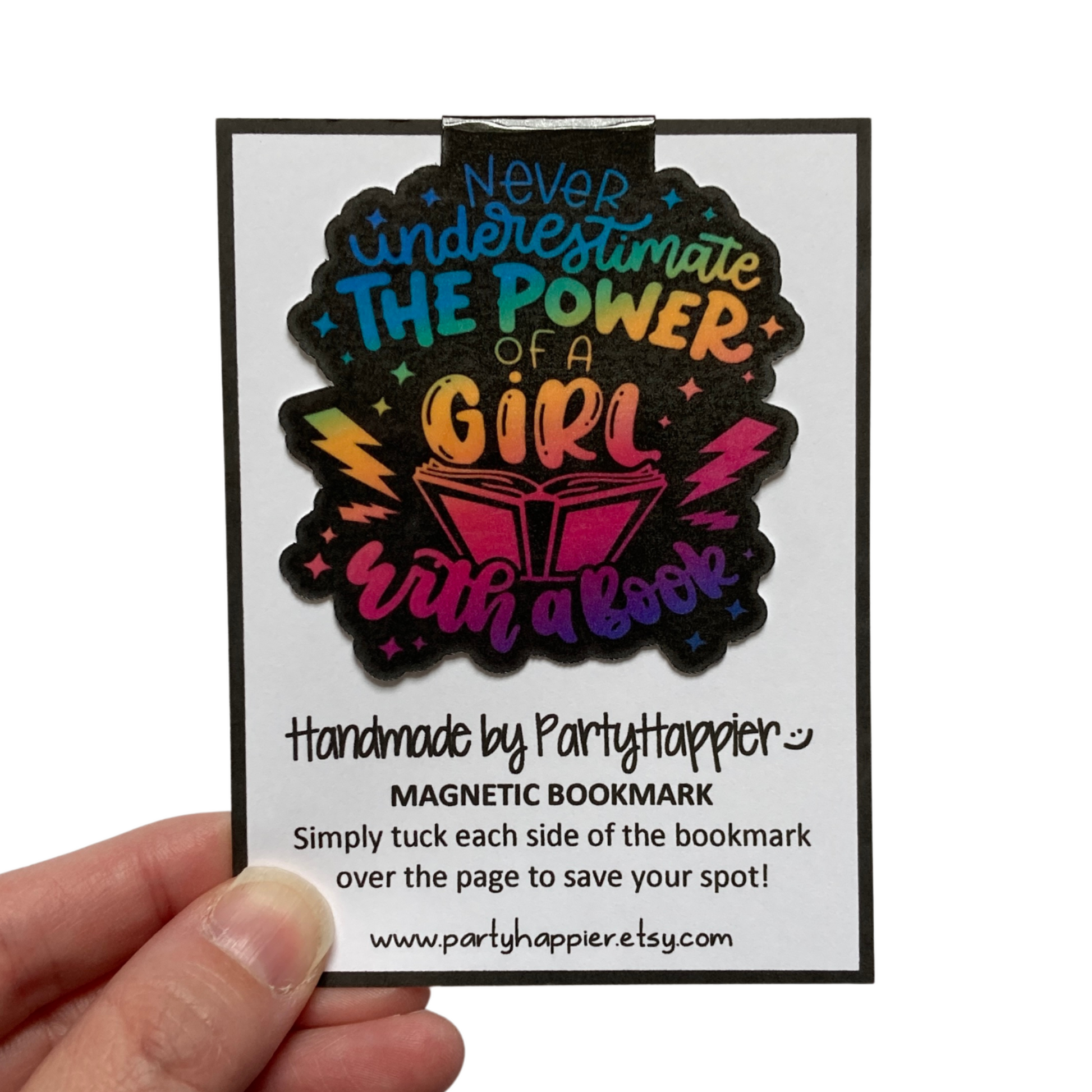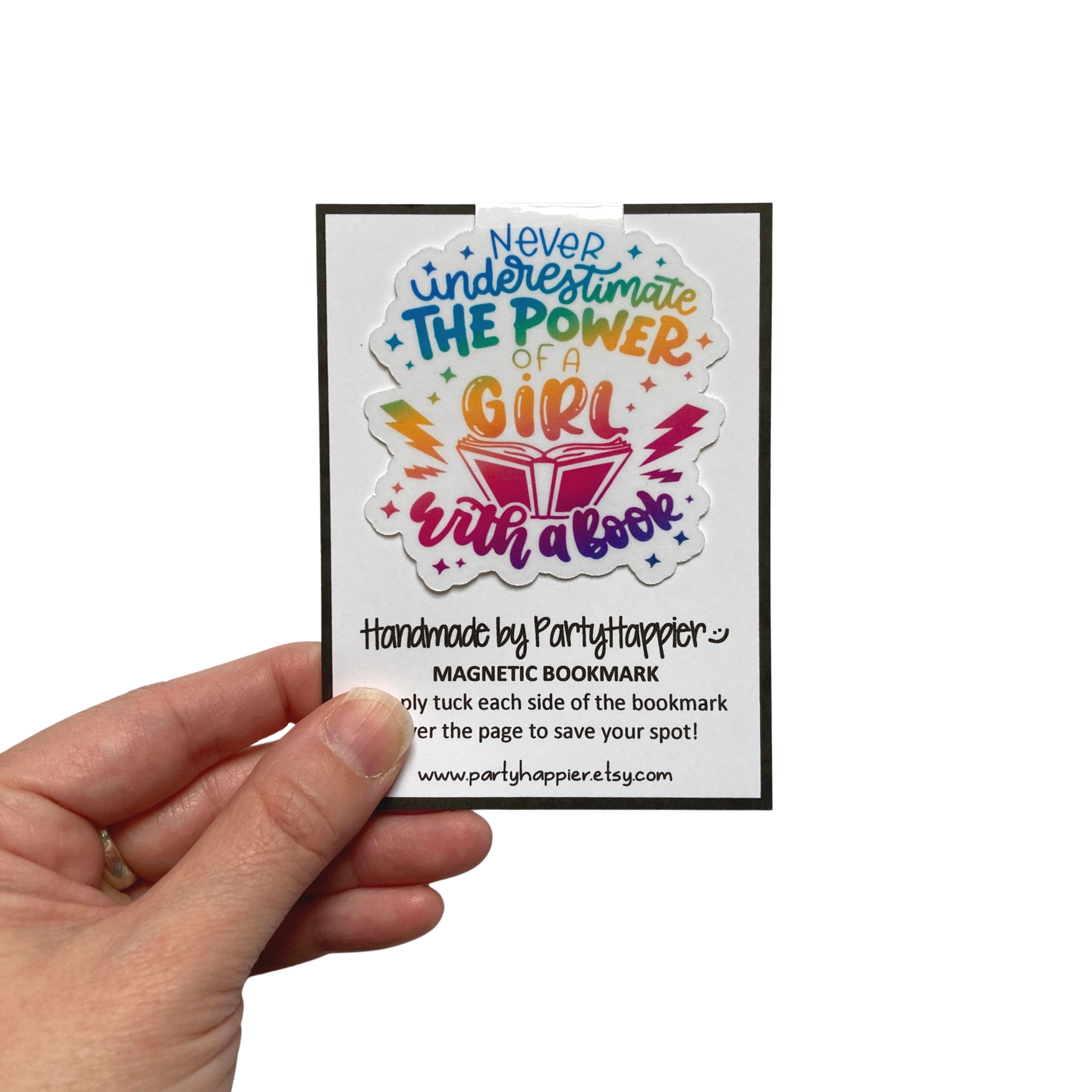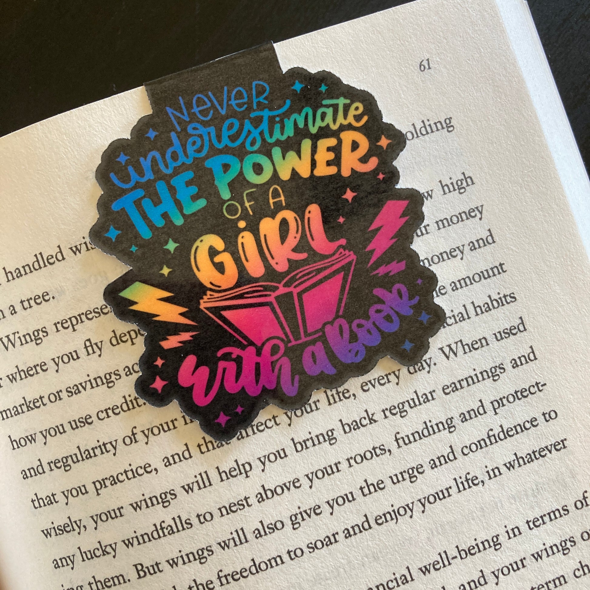 This listing is for one magnetic bookmark that says, "Never Underestimate The Power of a Girl With a Book." It's perfect for holding your place just about anywhere! Use it in your favorite book, planner, notebook, or wherever your heart desires!