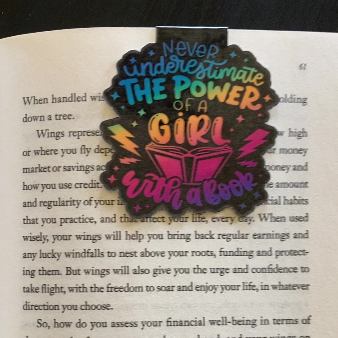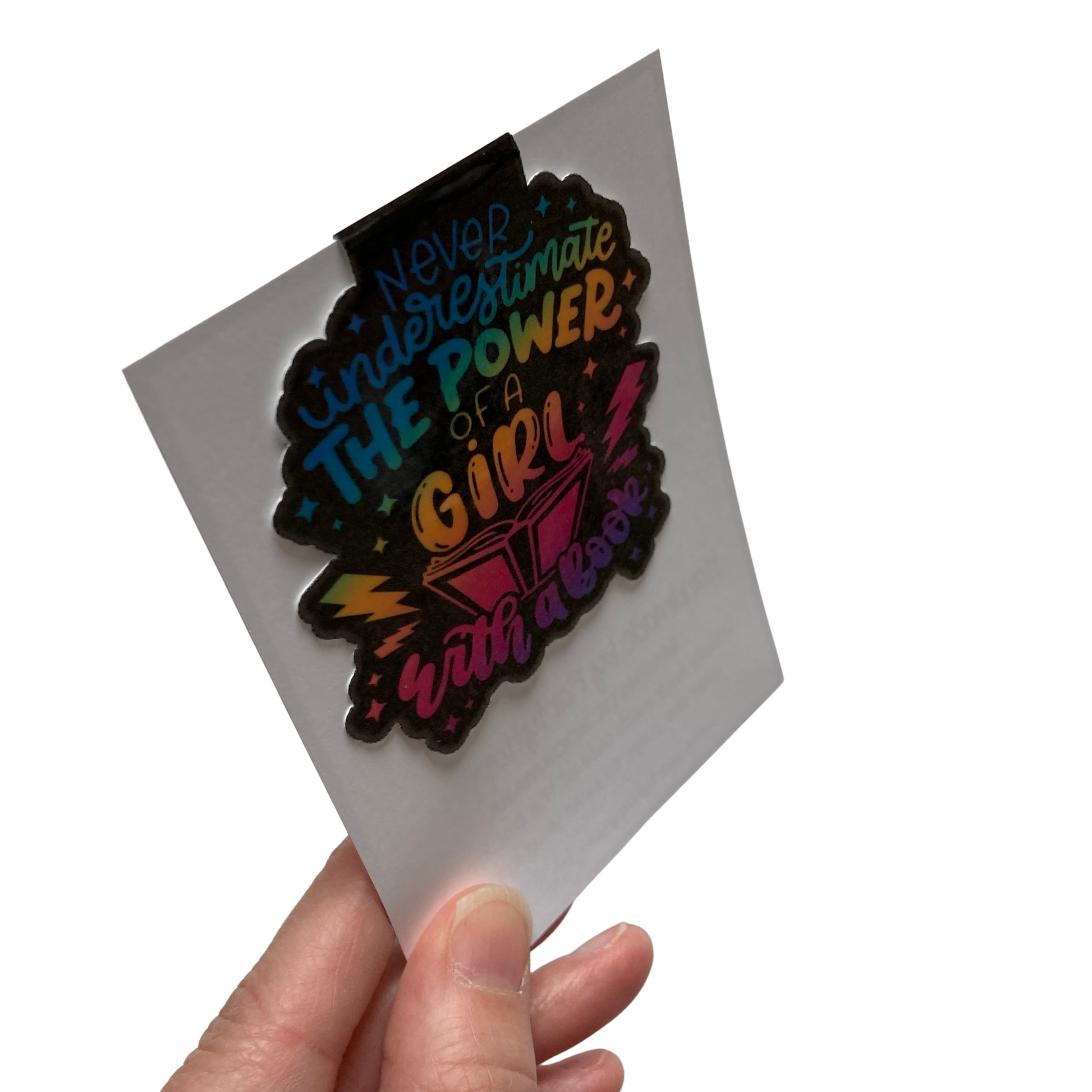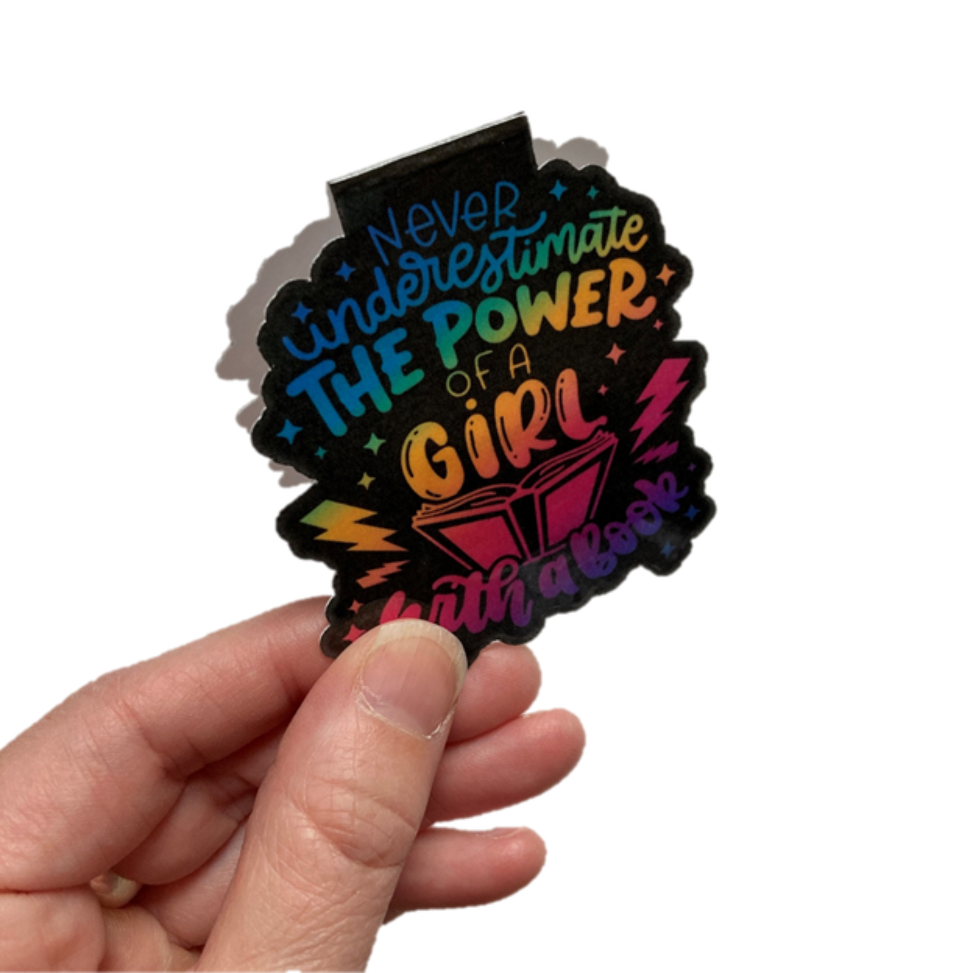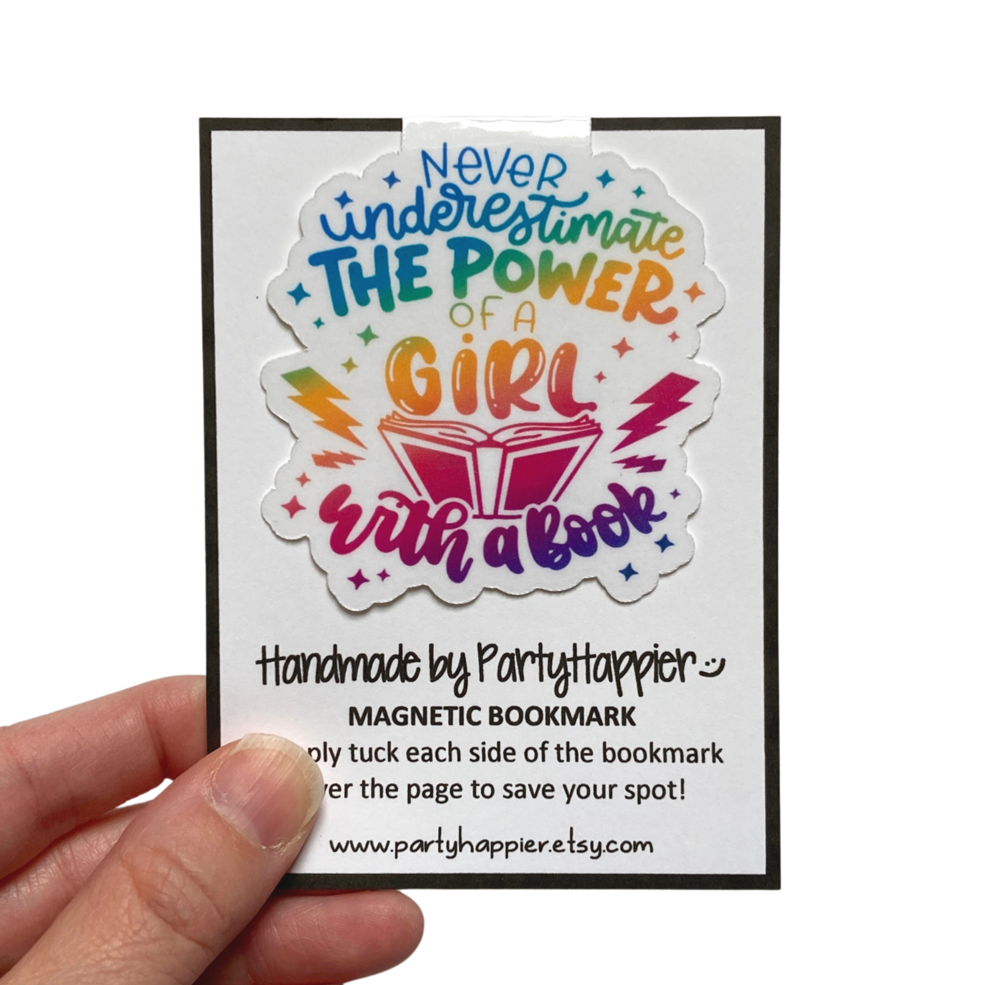 This listing is for one magnetic bookmark that says, "Never Underestimate The Power of a Girl With a Book." It's perfect for holding your place just about anywhere! Use it in your favorite book, planner, notebook, or wherever your heart desires!