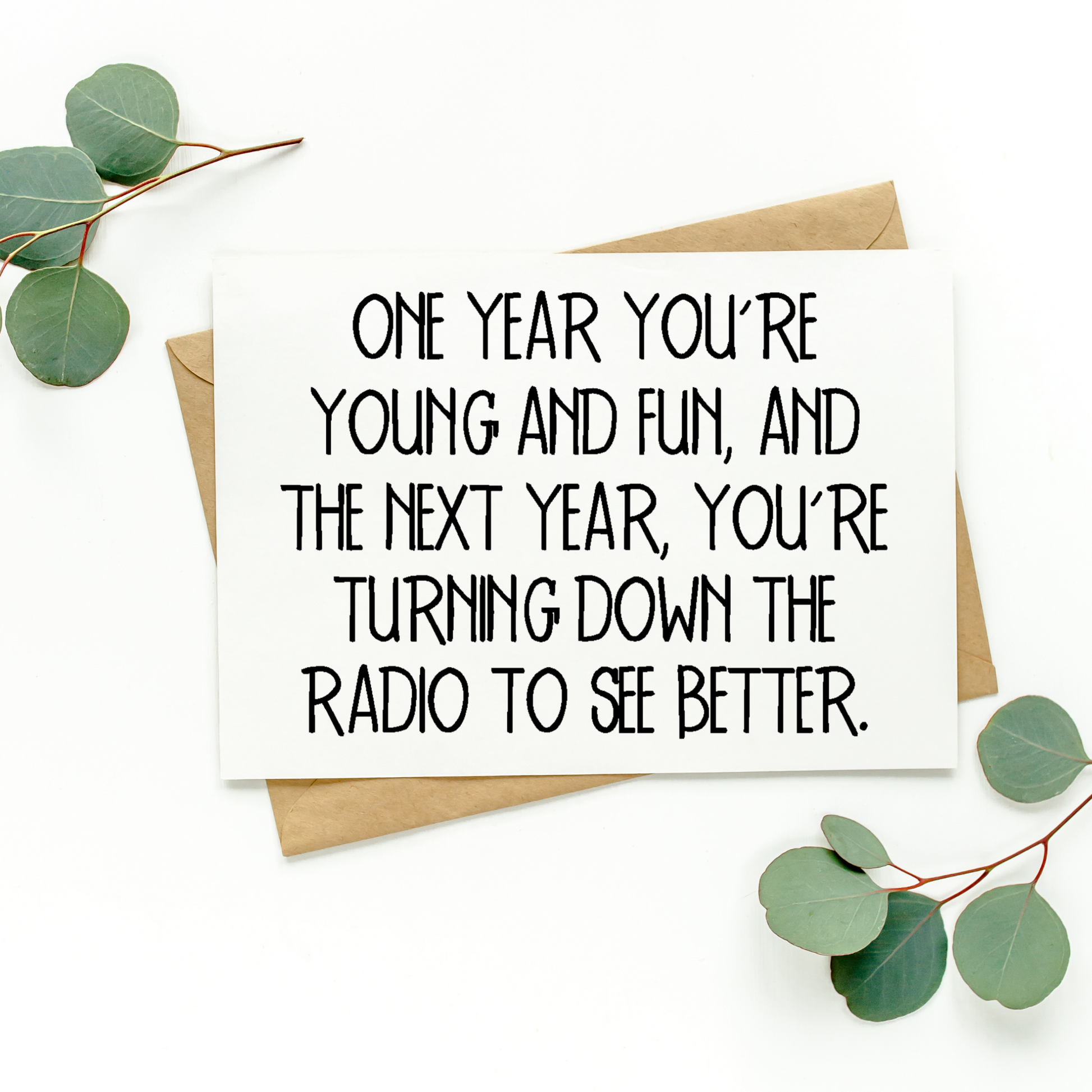 This listing is for one blank greeting card that says, "One Year You're Young And Fun, And The Next Year, You're Turning Down The Radio To See Better." The card is a hilarious way to celebrate someone's birthday!