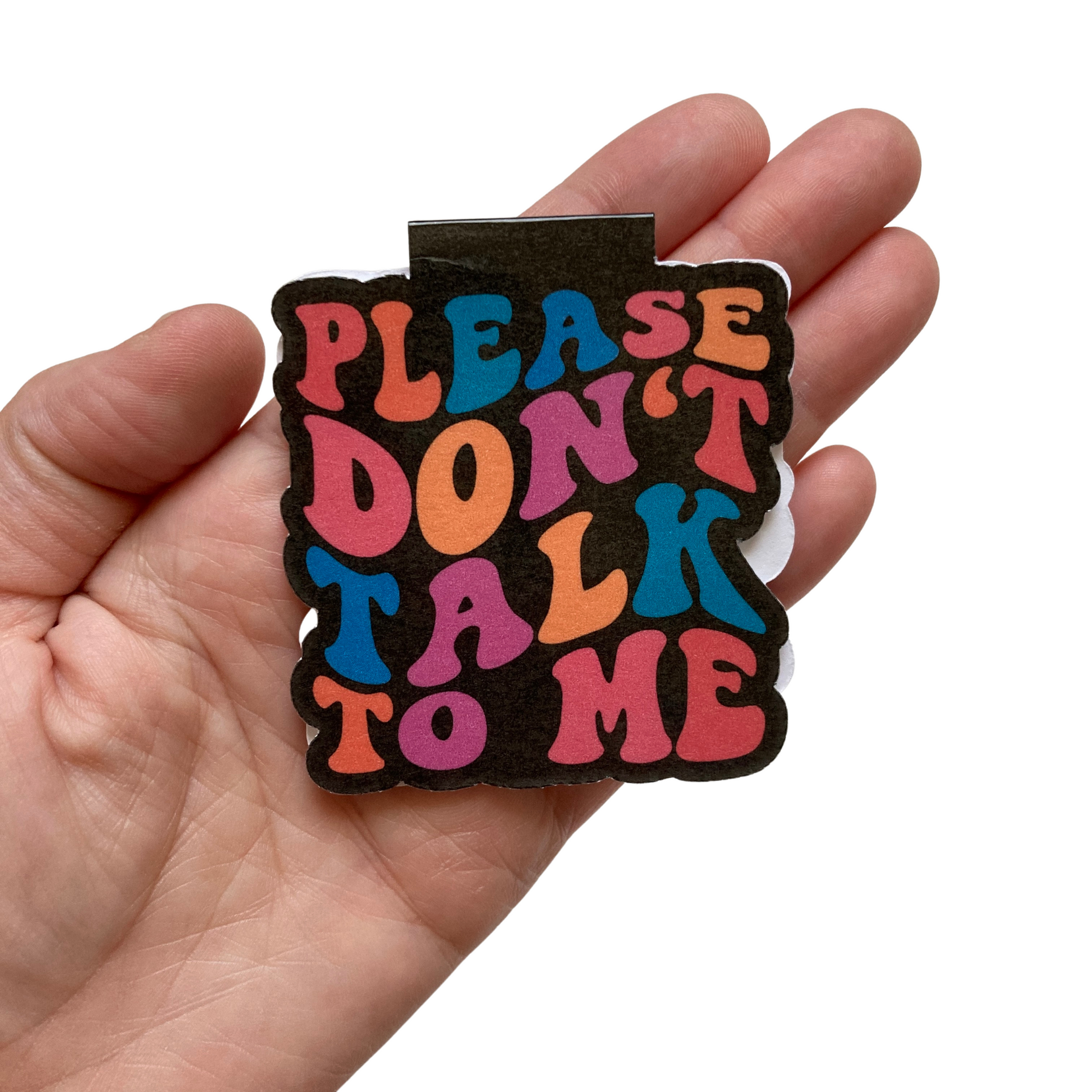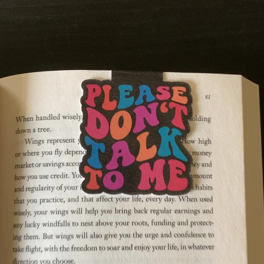 This listing is for one magnetic bookmark that says, "Please Don't Talk To Me." It's perfect for holding your place just about anywhere! Use it in your favorite book, planner, notebook, or wherever your heart desires!