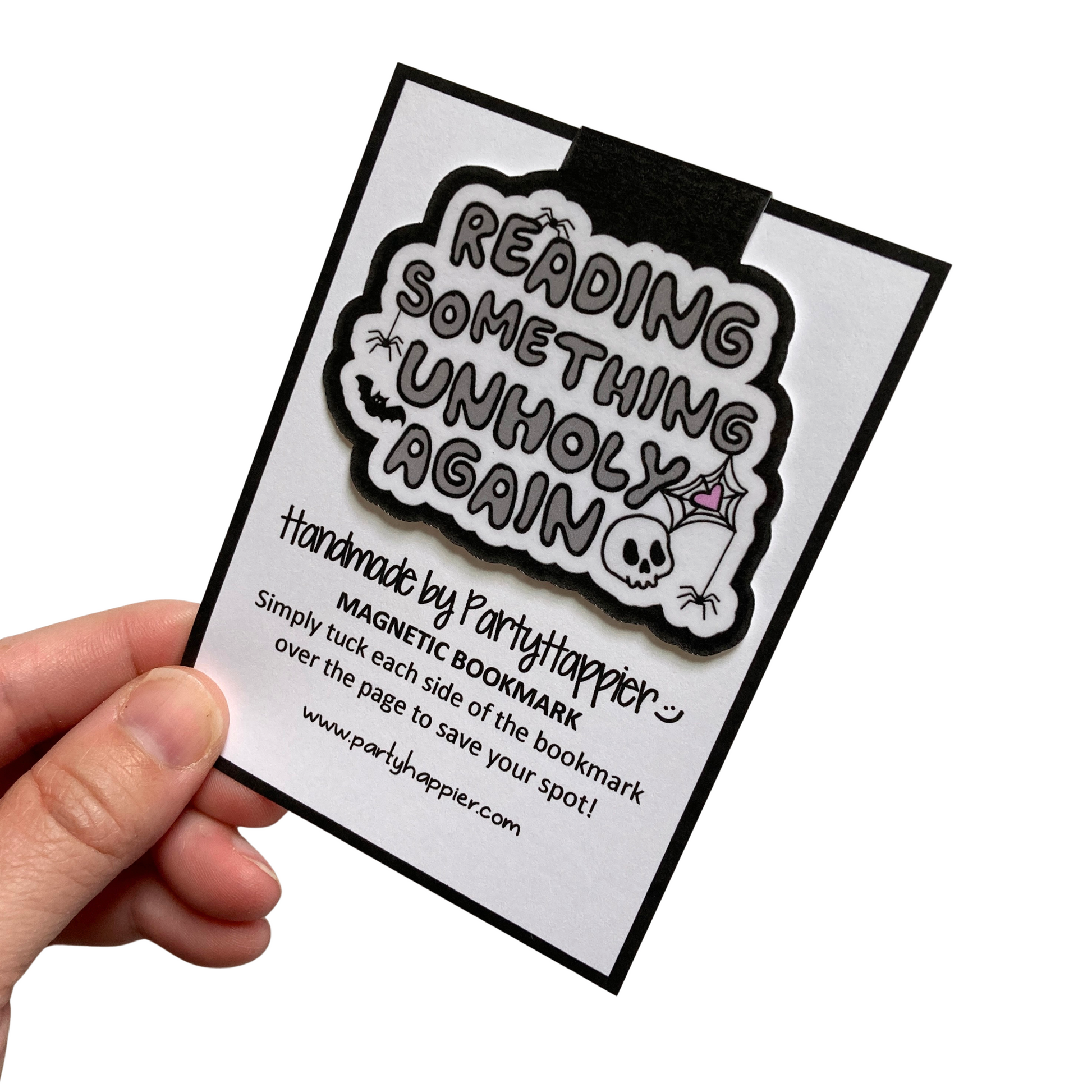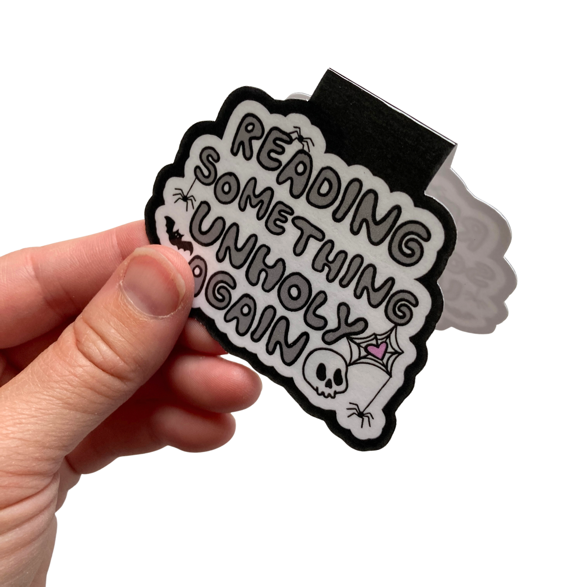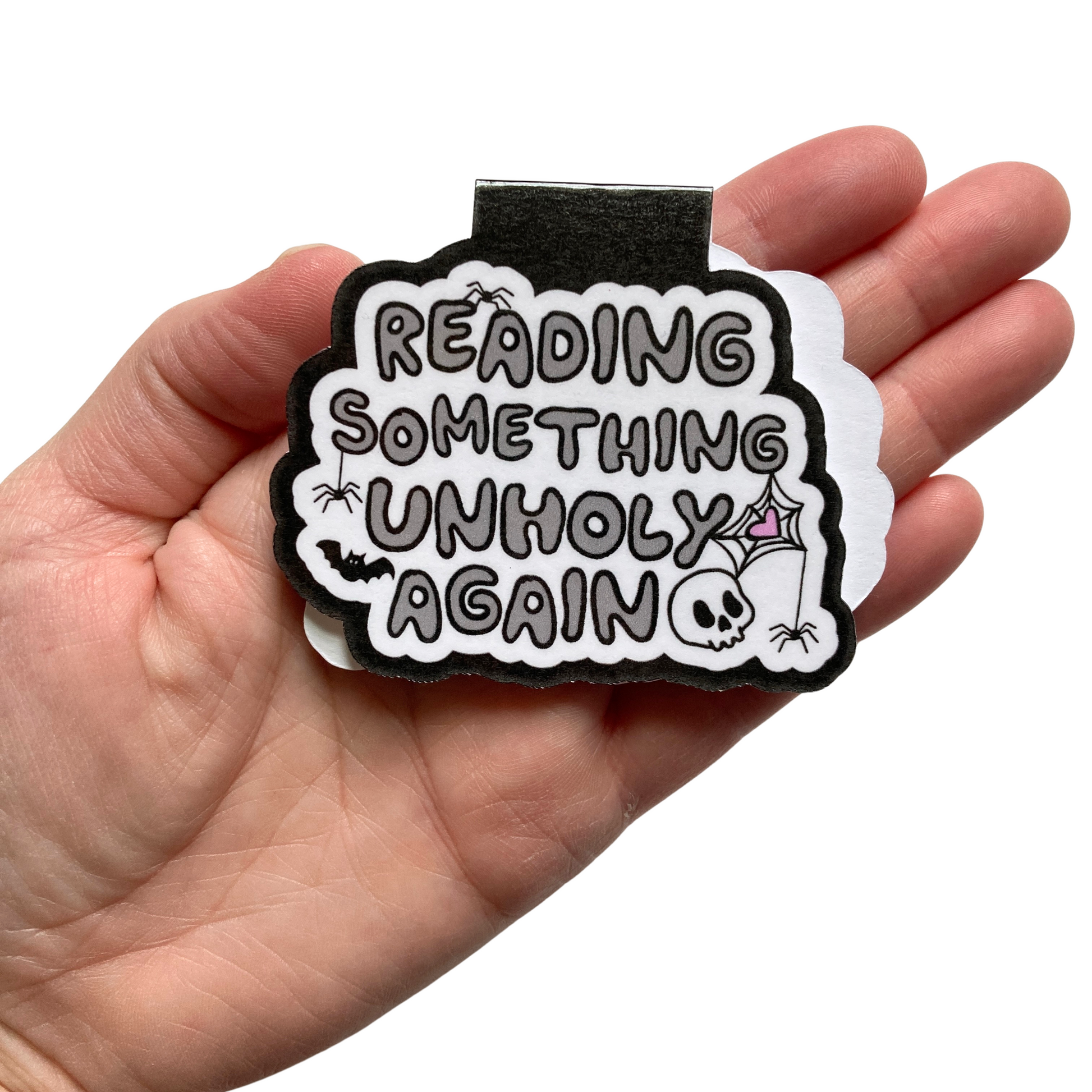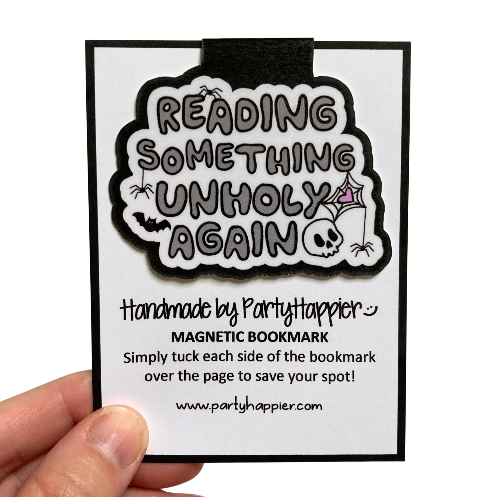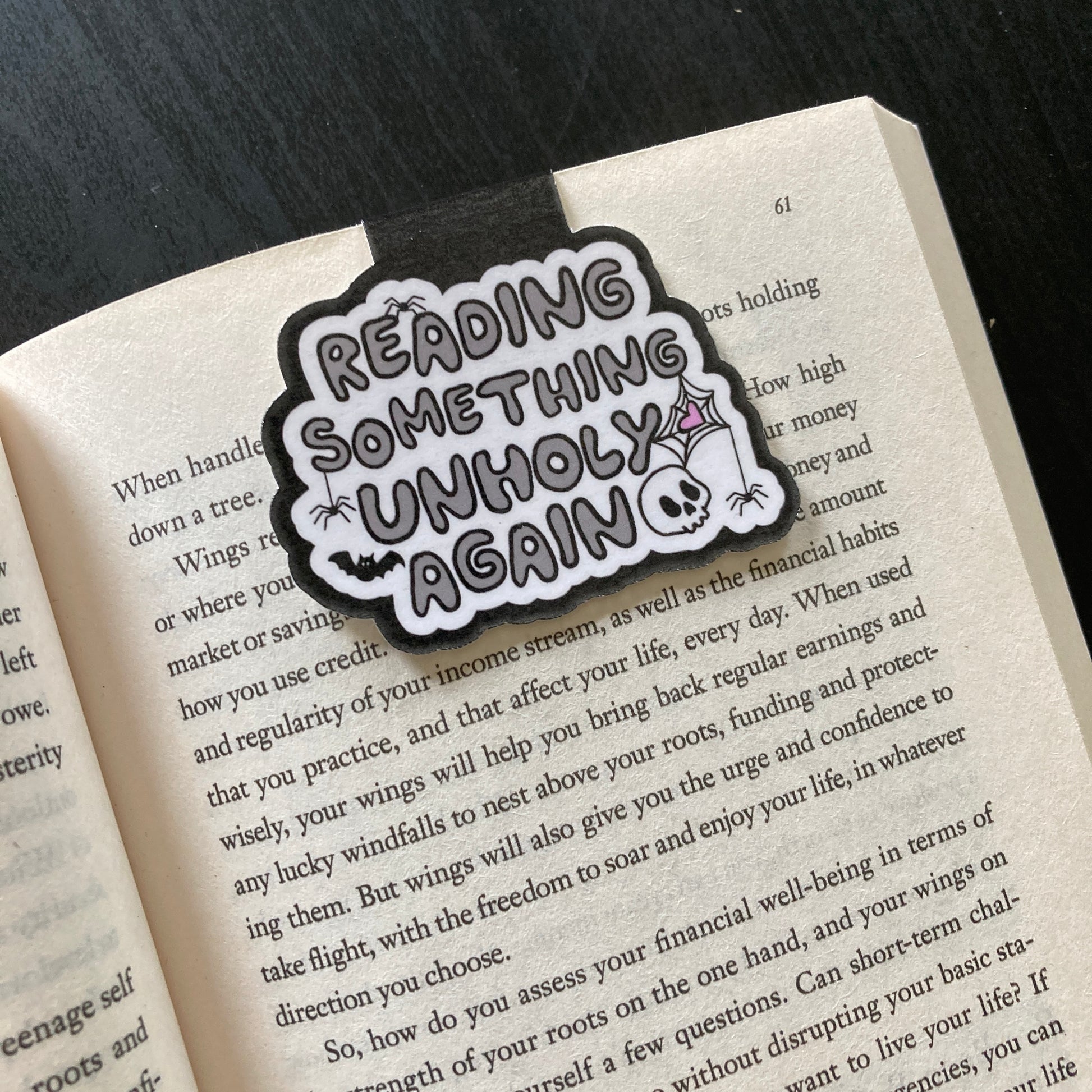 This listing is for one magnetic bookmark that says, "Reading Something Unholy Again." It's perfect for holding your place just about anywhere! Use it in your favorite book, planner, notebook, or wherever your heart desires!