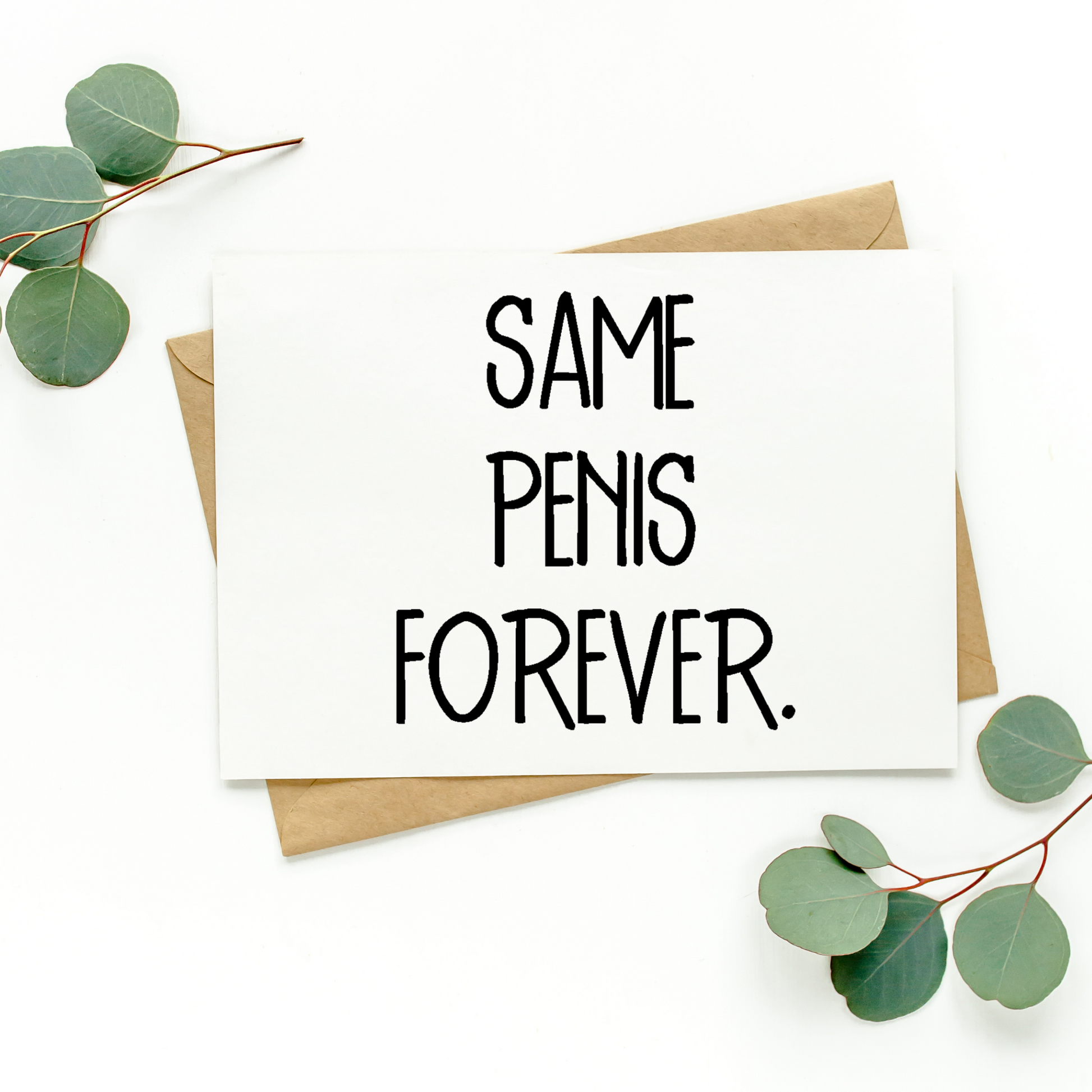 This listing is for one blank greeting card that says, "Same Penis Forever." It is a hilarious card to celebrate someone's commitment to their partner!
