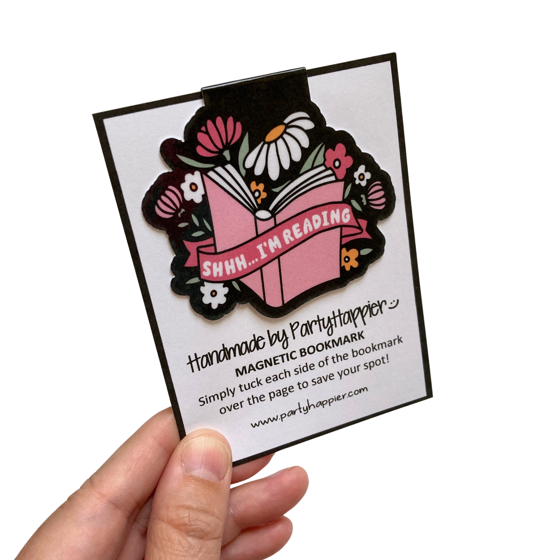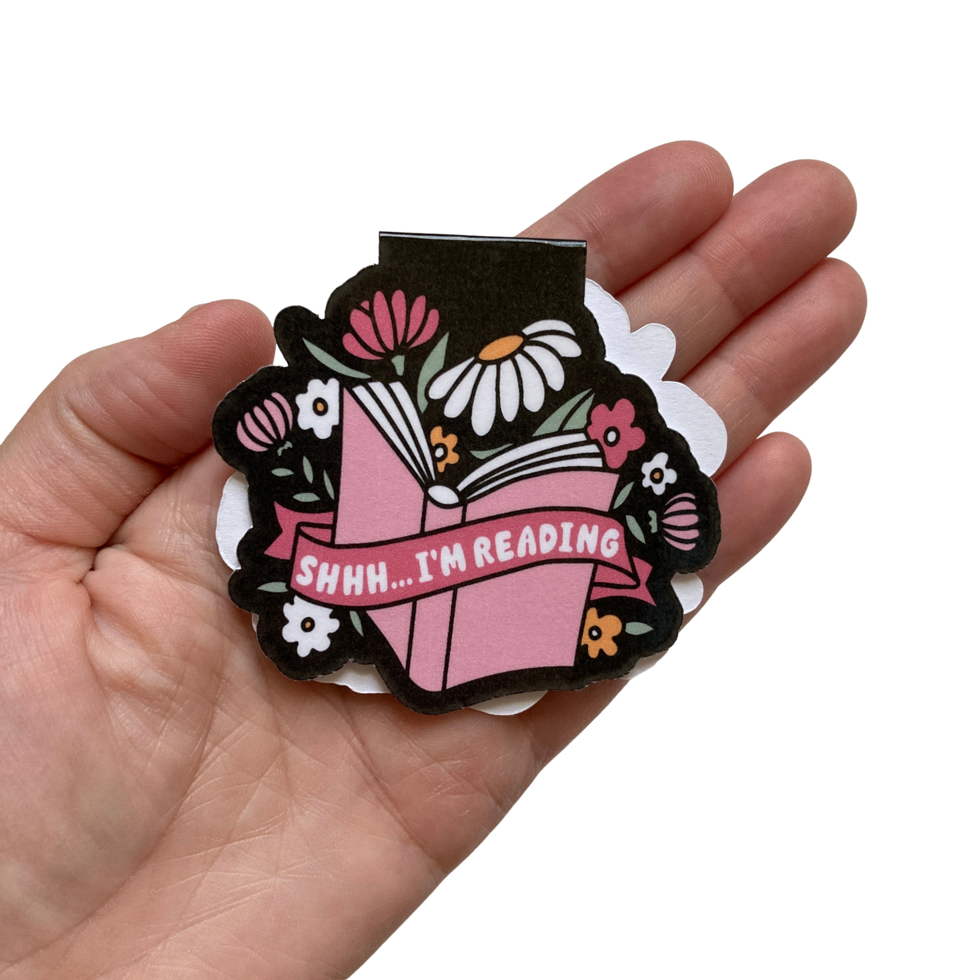 This listing is for one magnetic bookmark that says, "Shhh... I'm Reading." It's perfect for holding your place just about anywhere! Use it in your favorite book, planner, notebook, or wherever your heart desires!