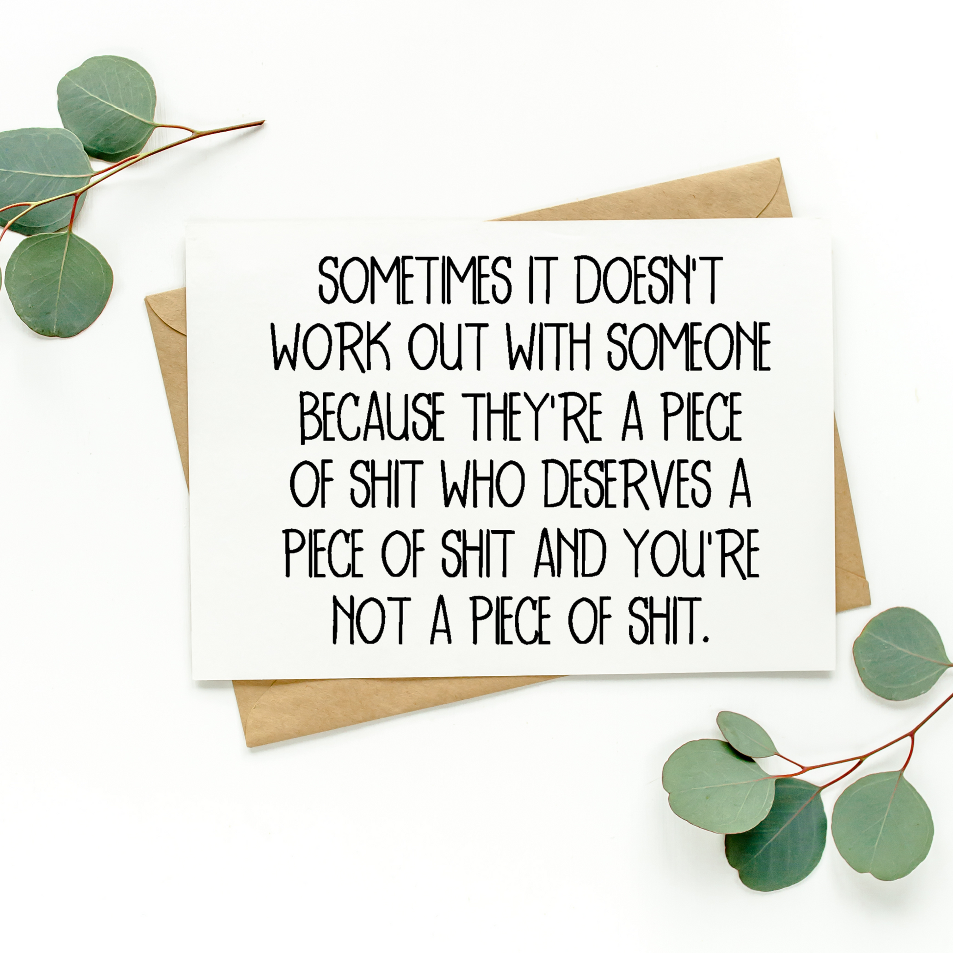 This listing is for one blank greeting card that says, "Sometimes It Doesn't Work Out With Someone Because They're A Piece Of Shit Who Deserves A Piece Of Shit And You're Not A Piece Of Shit." The card is a hilarious and thoughtful way to help someone get over their recent breakup.