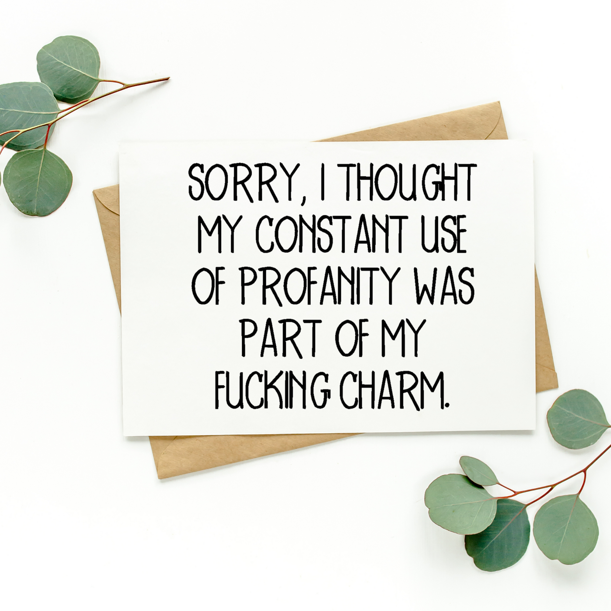 This listing is for one blank greeting card that says "Sorry, I Thought My Constant Use Of Profanity Was Part Of My Fucking Charm." It takes a special person in your life to appreciate the snarky humor this card offers;)