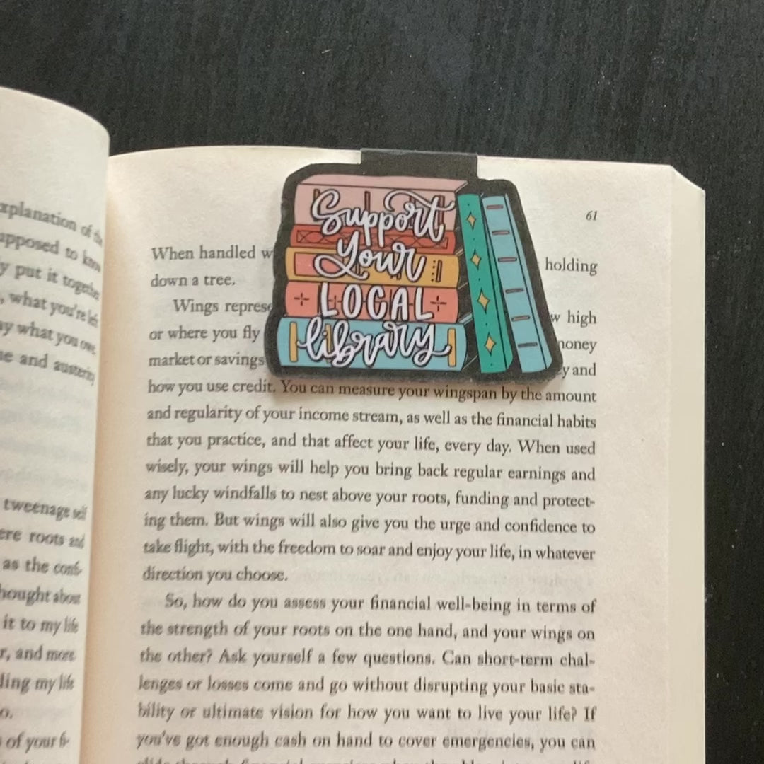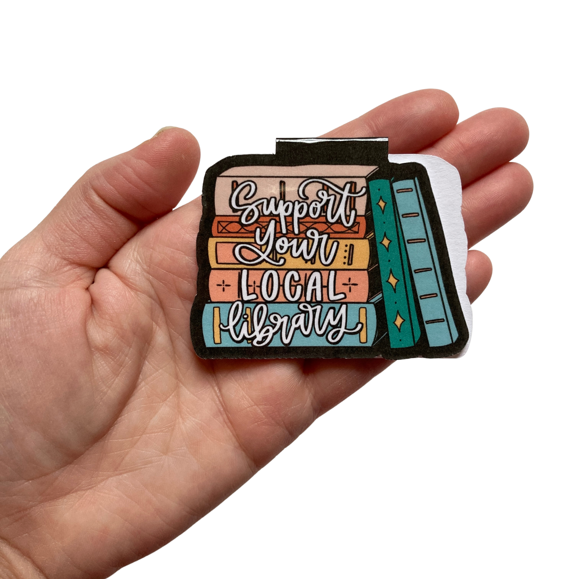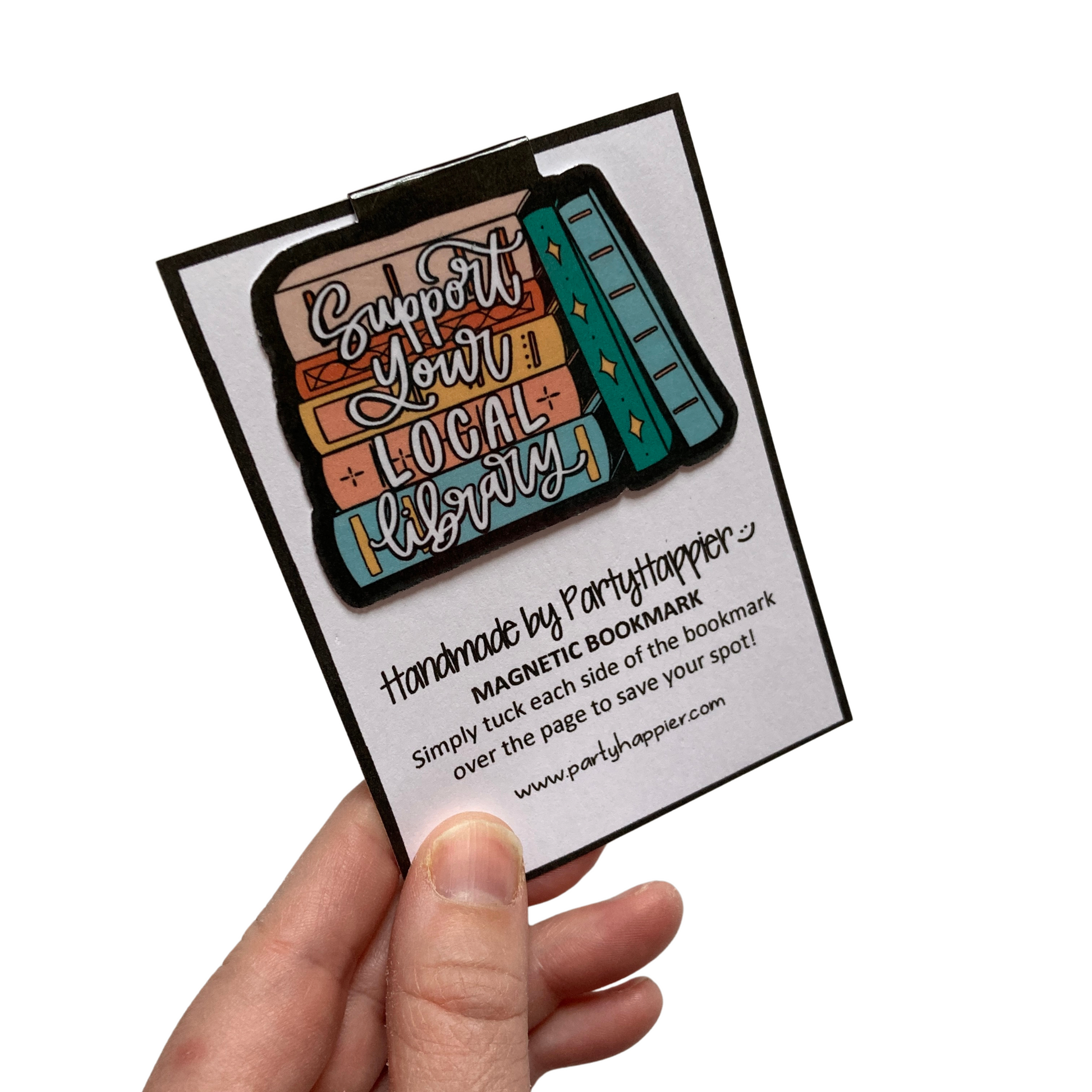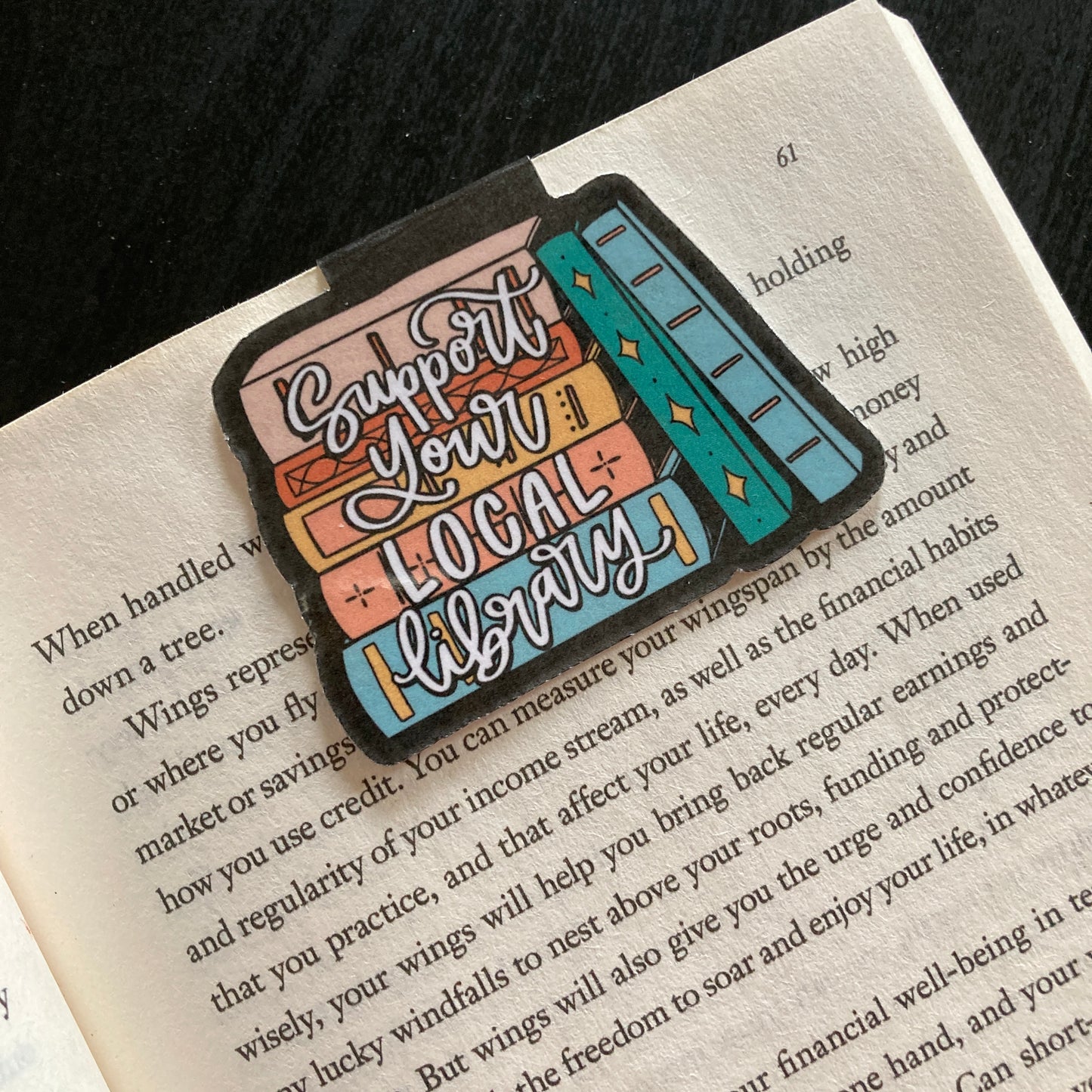 This listing is for one magnetic bookmark that says, "Support Your Local Library." It's perfect for holding your place just about anywhere! Use it in your favorite book, planner, notebook, or wherever your heart desires!