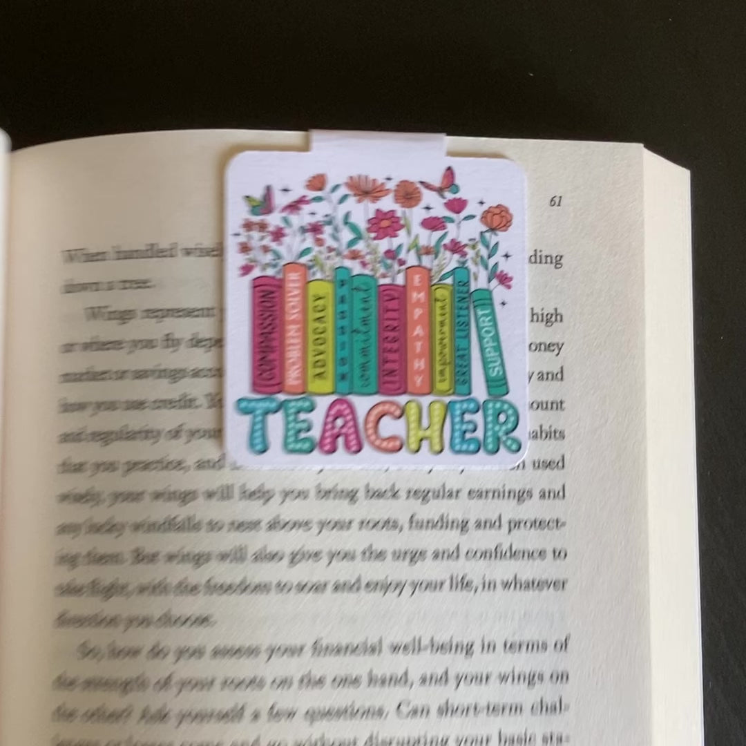 This listing is for one magnetic bookmark that says, "Teacher" and features a variety of kind words on books. It's perfect for holding your place just about anywhere! Use it in your favorite book, planner, notebook, or wherever your heart desires!