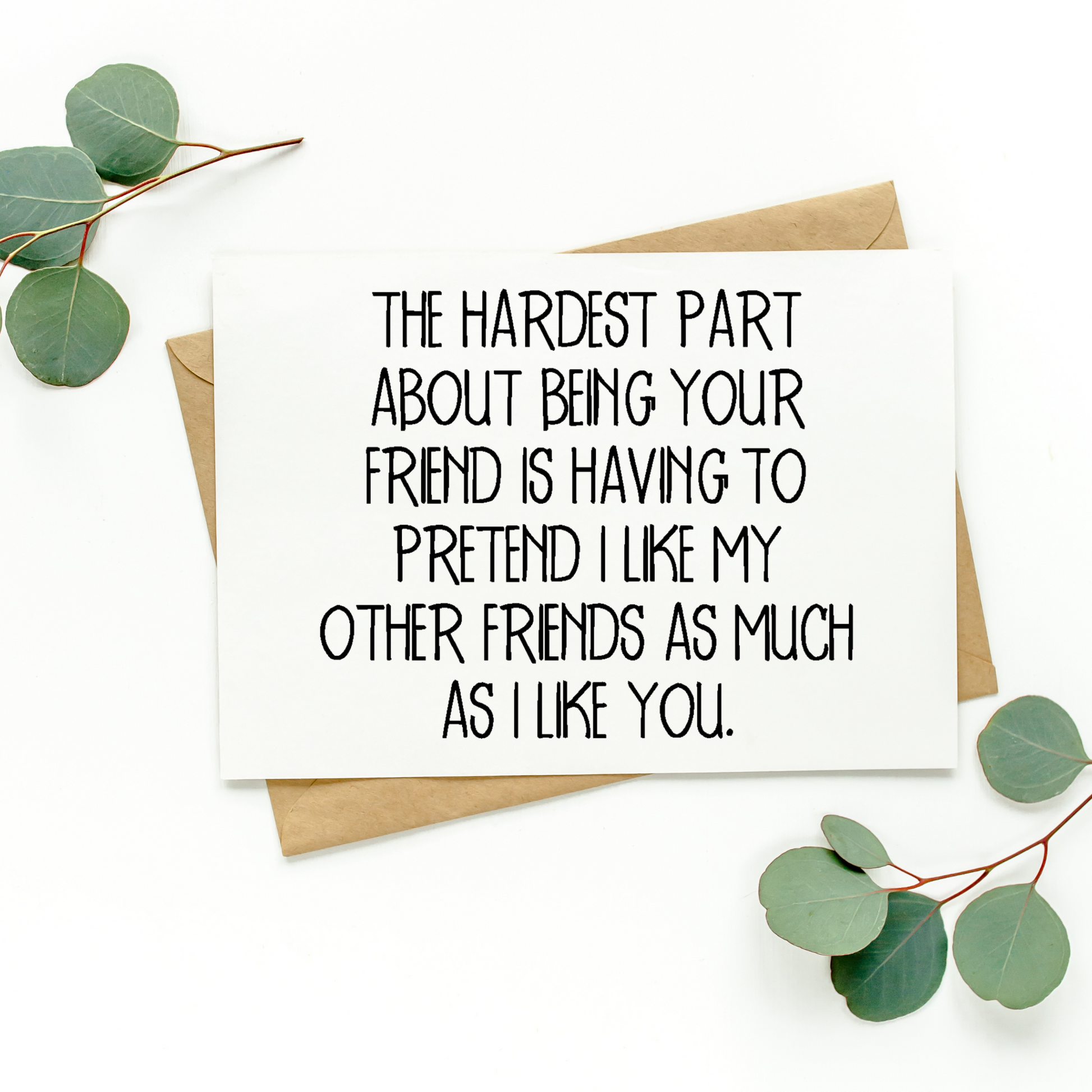 This listing is for one blank greeting card that says, "The Hardest Part About Being Your Friend Is Having To Pretend I Like My Other Friends As Much As I Like You." Enough said;)