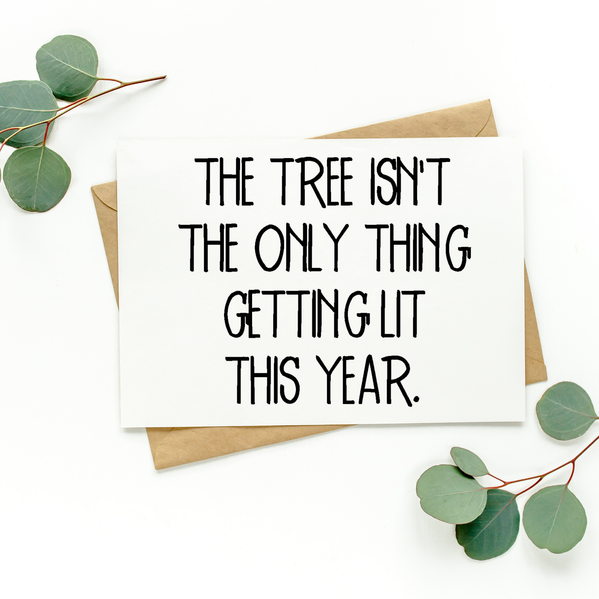 This listing is for one blank greeting card that says, "The Tree Isn't The Only Thing Getting Lit This Year." What a funny way to celebrate the holidays!